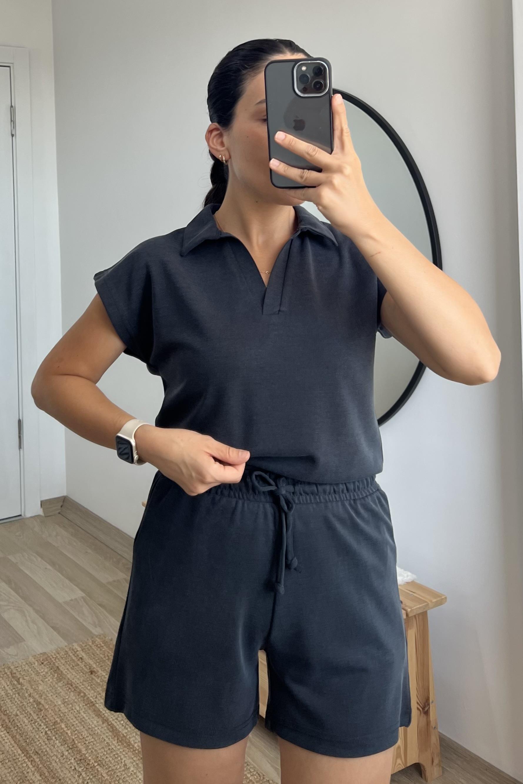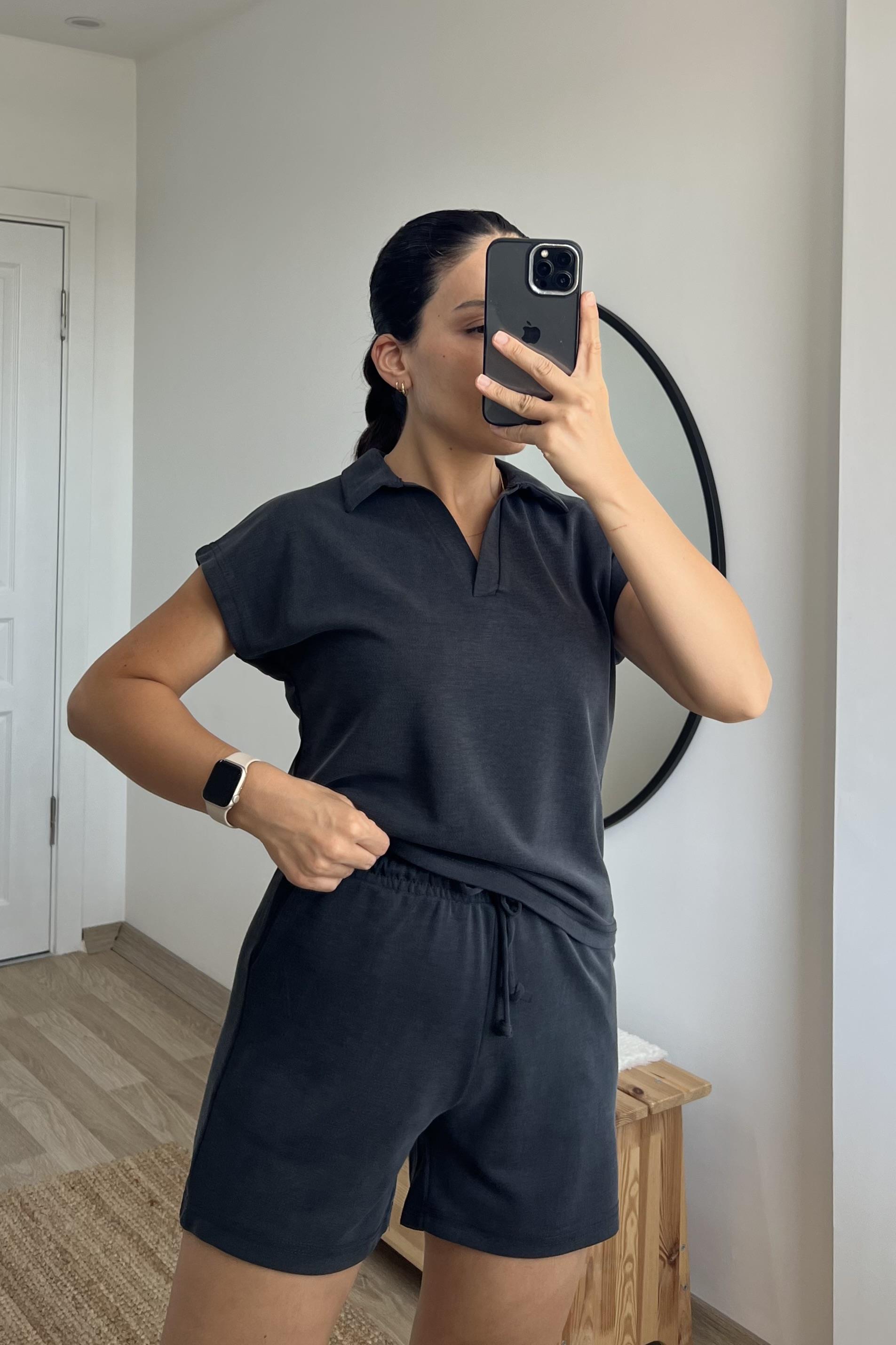 Antrasit Oysho Kumaş Modal Polo Yaka Tshirt Şort Takım