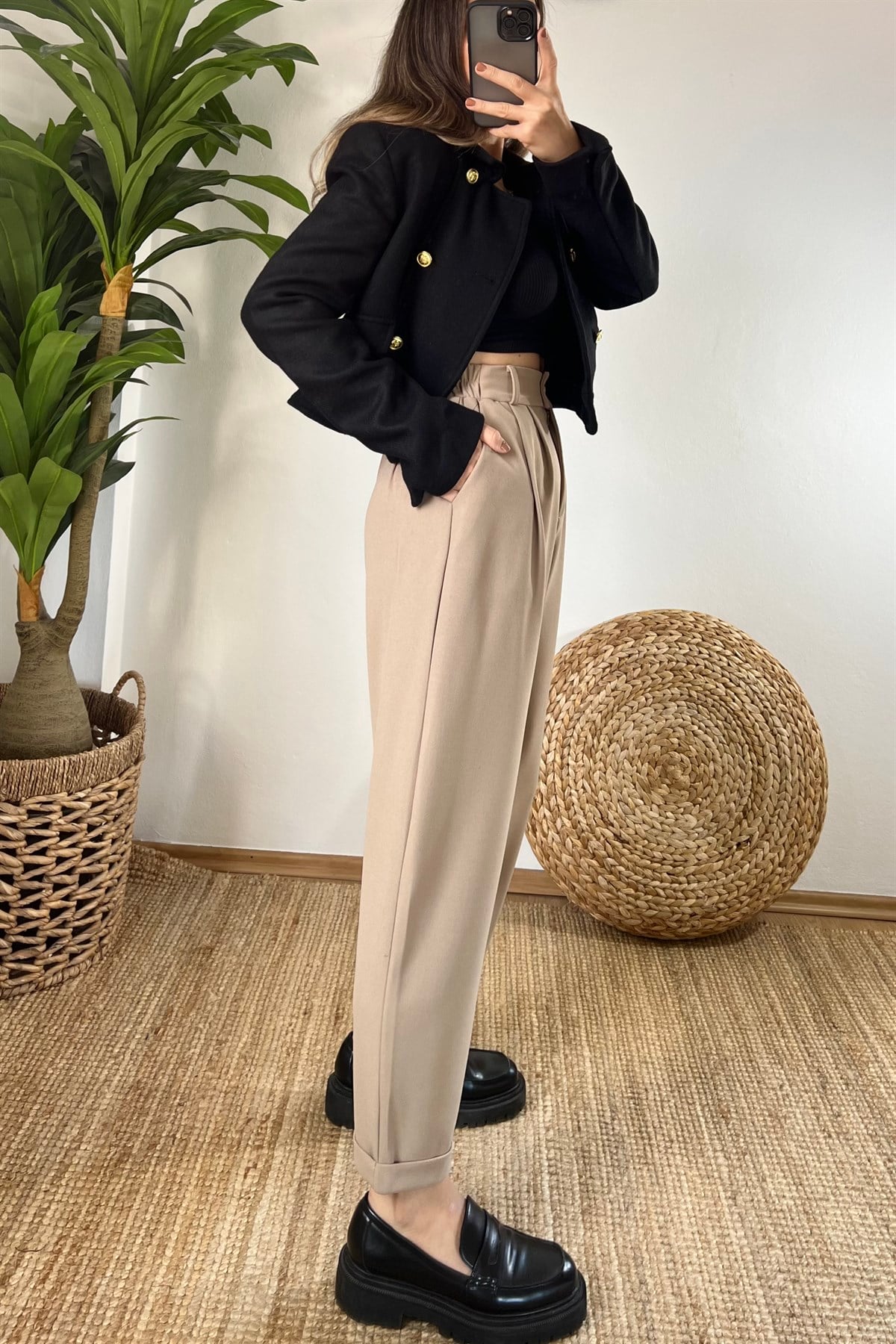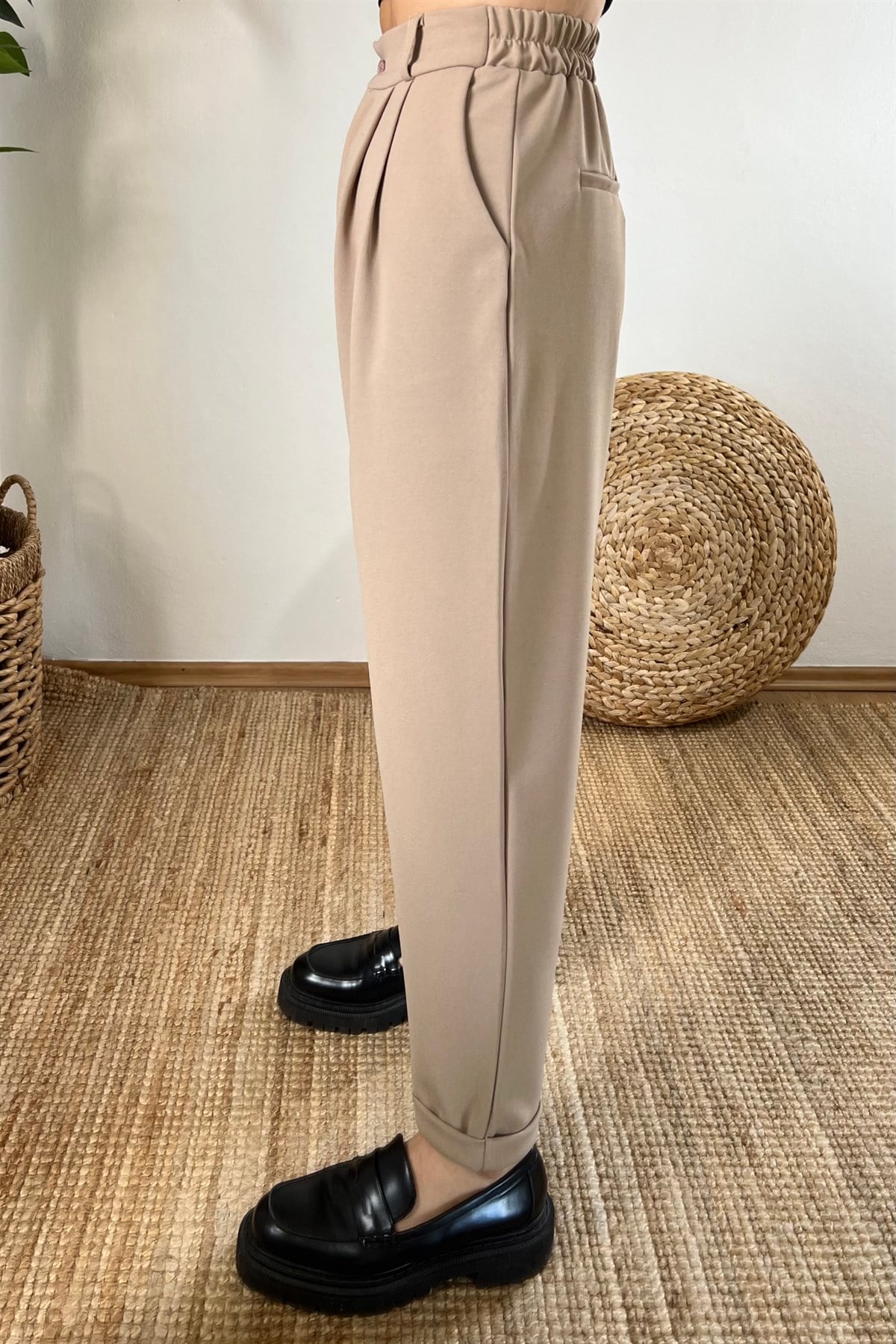 Bej Beli Lastikli Duble Paça Pantolon