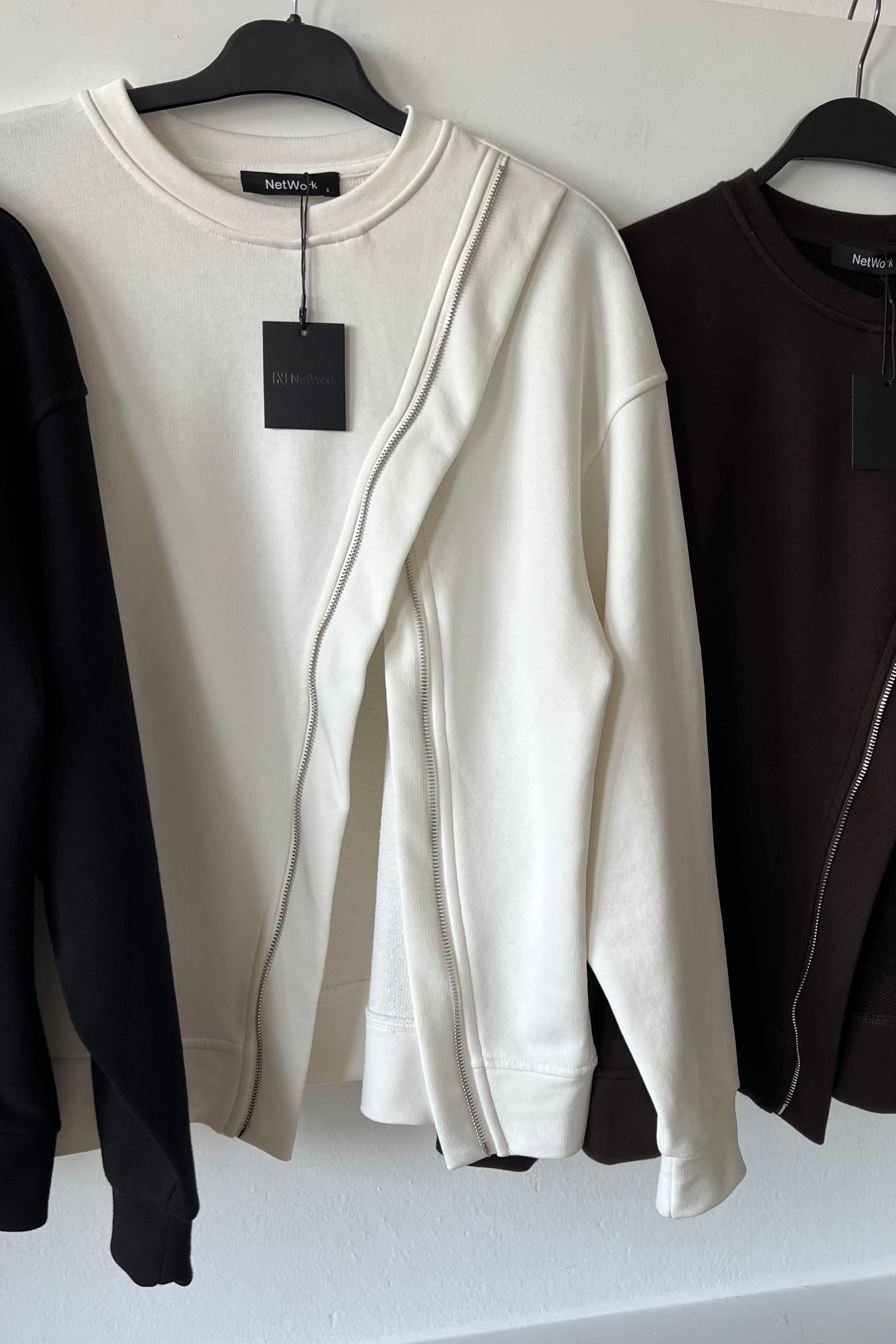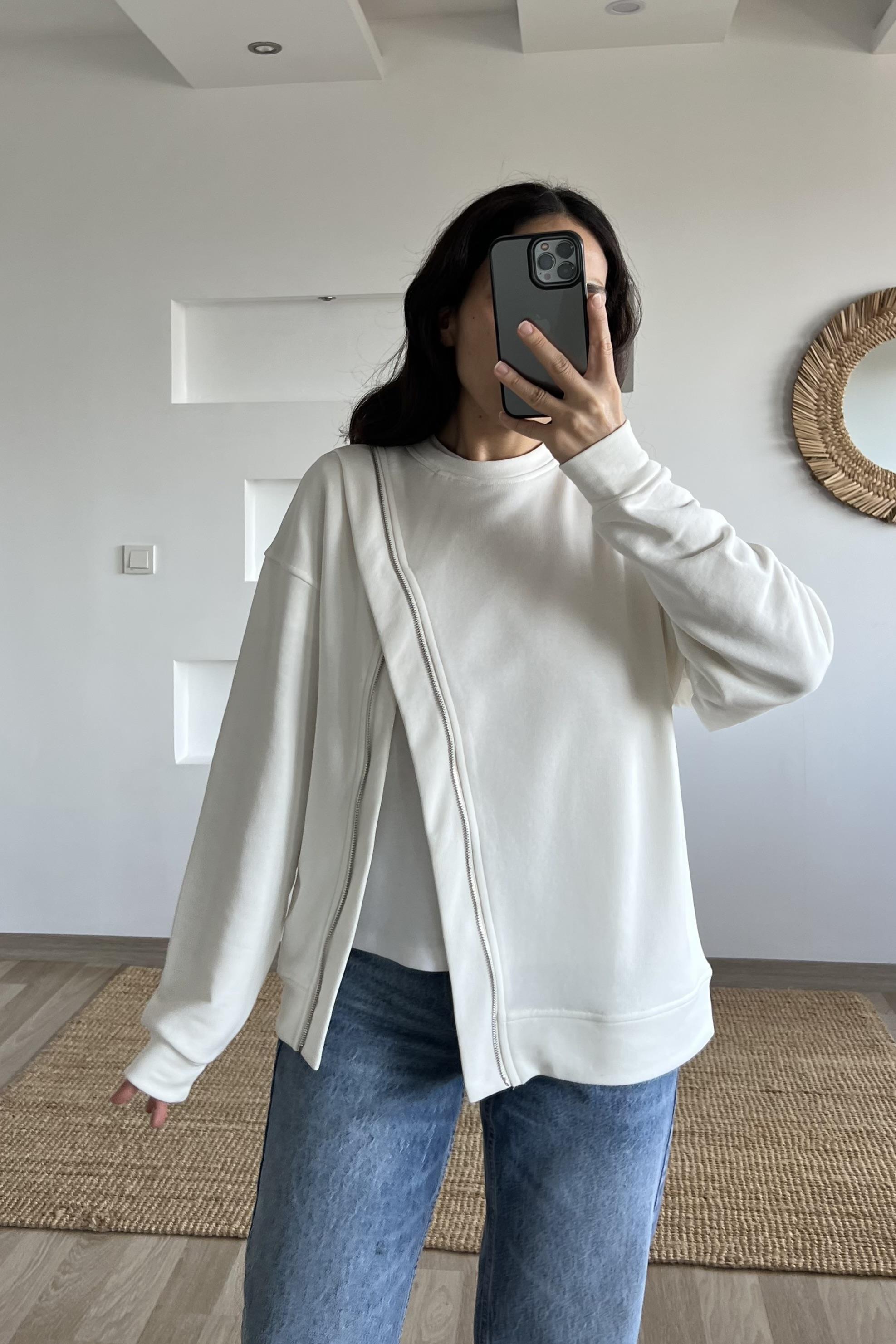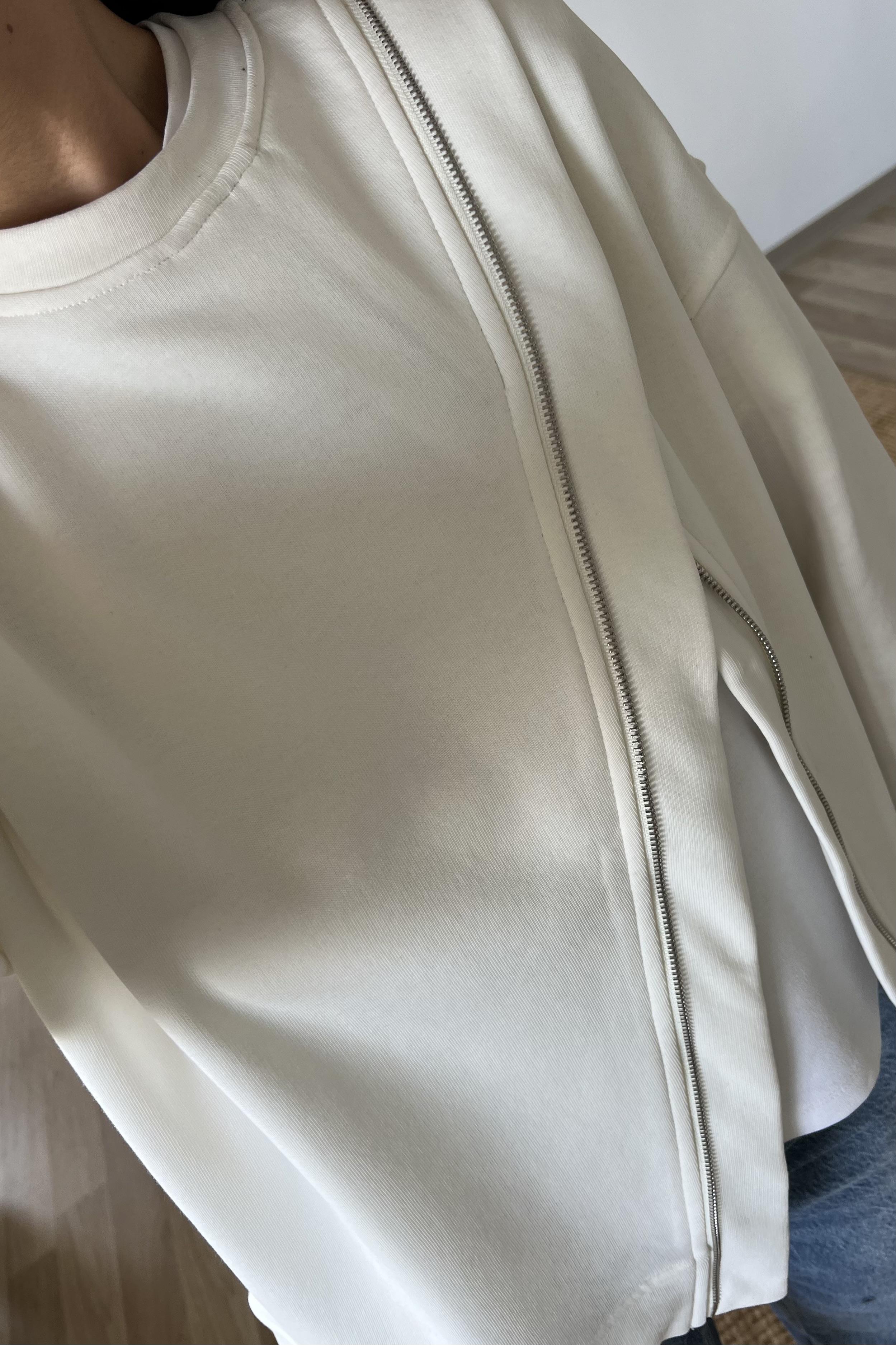 Beyaz Asimetrik Fermuarlı Sweatshirt