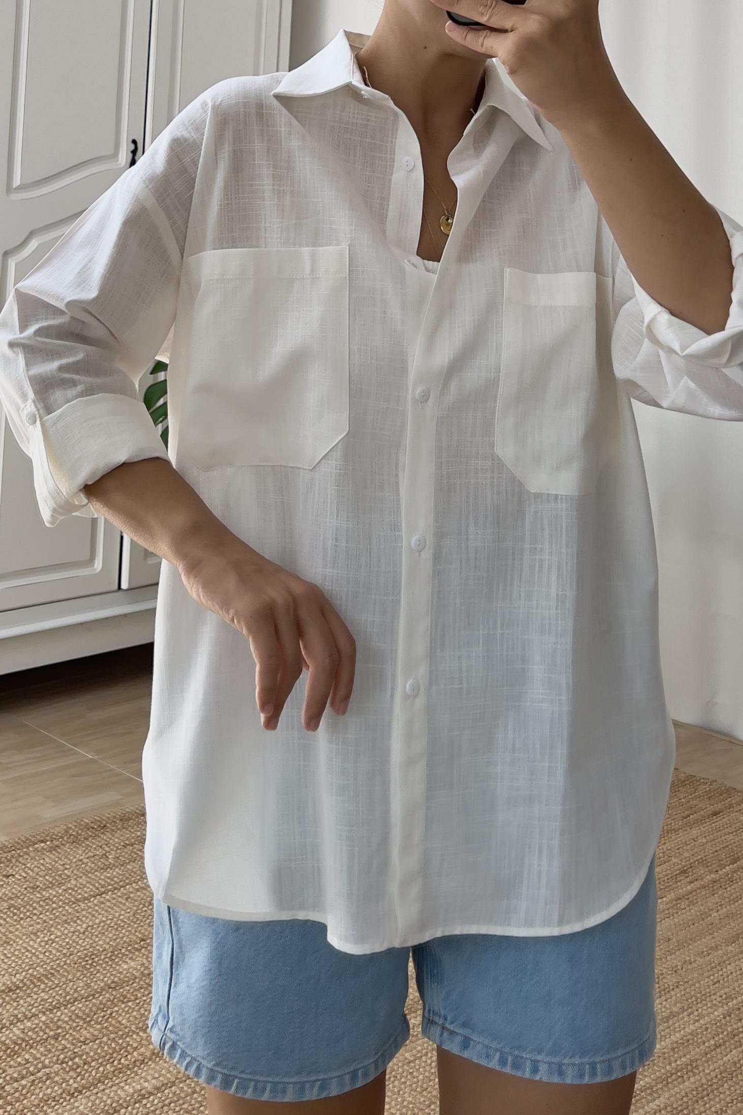 Beyaz Çift Cep Detaylı Keten Gömlek