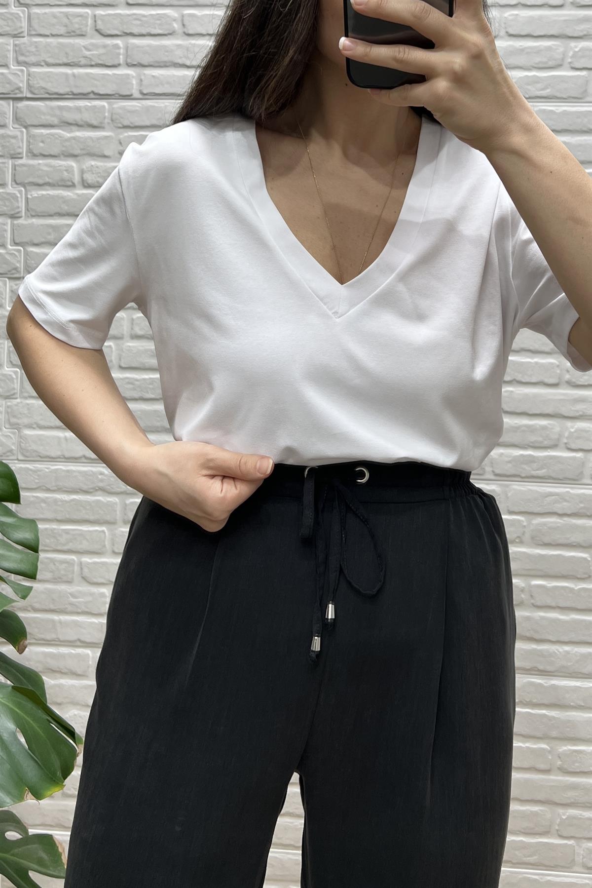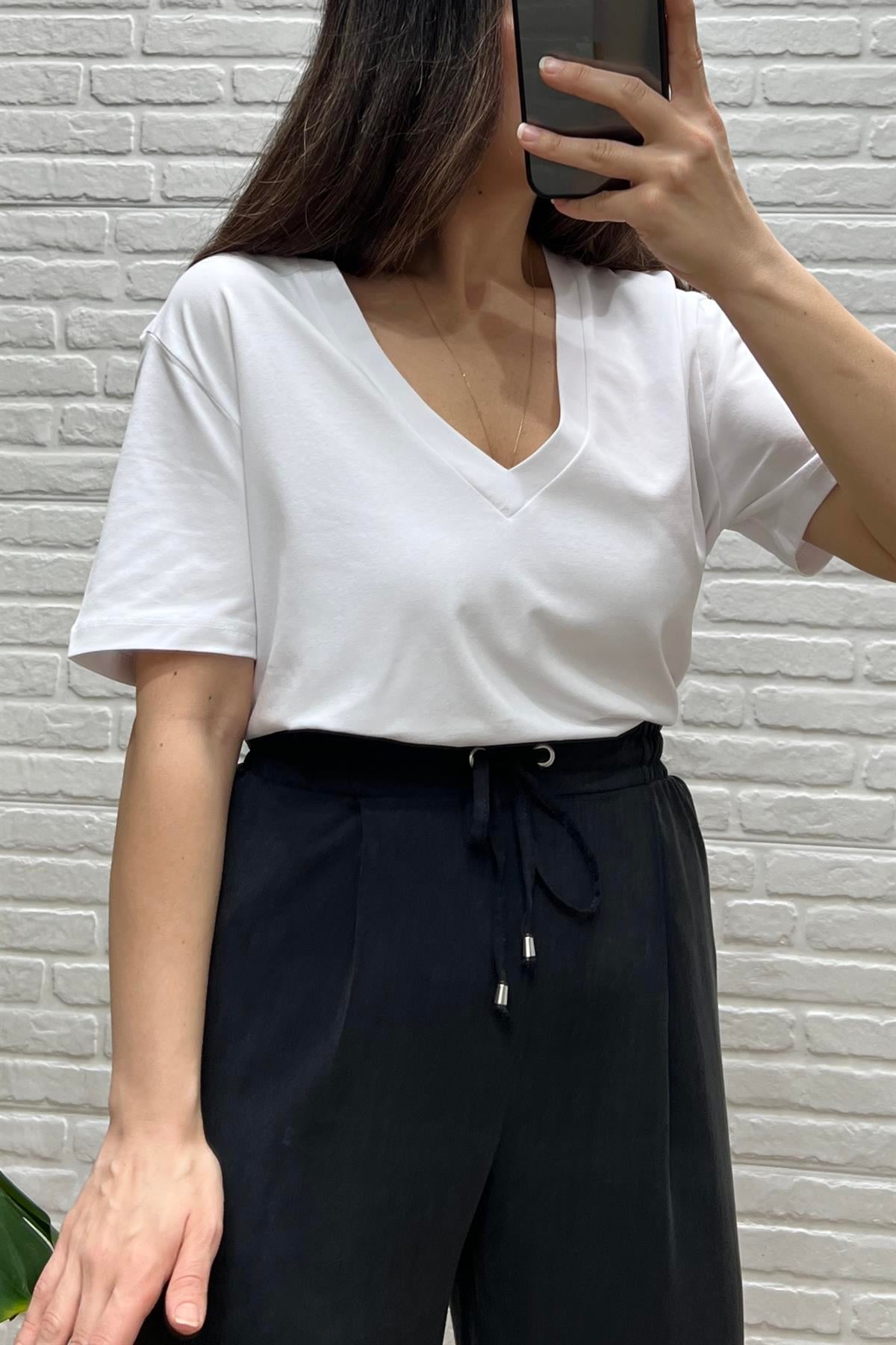 Beyaz Orjinal Marka V Yaka Likralı Basic Tshirt