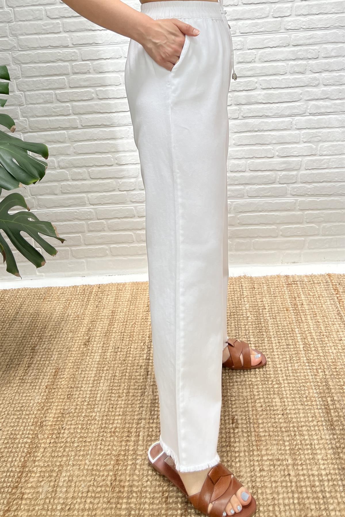 Beyaz Paçası Püskül Detaylı Rahat Pantolon