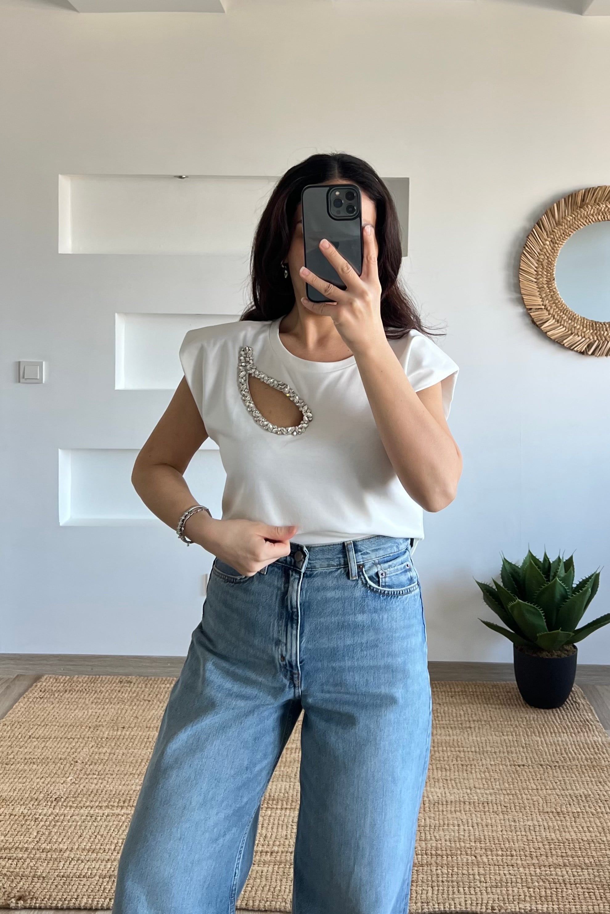 Beyaz Vatkalı Taş Dekolteli Tshirt