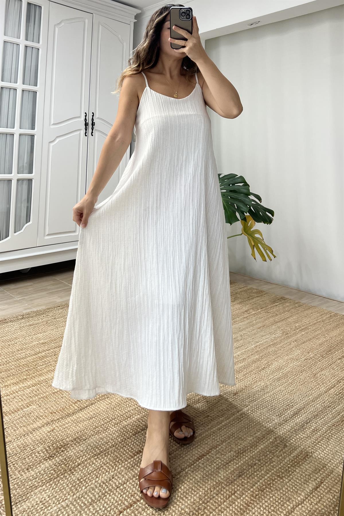 Ekru Askılı Astarlı Gofre Elbise