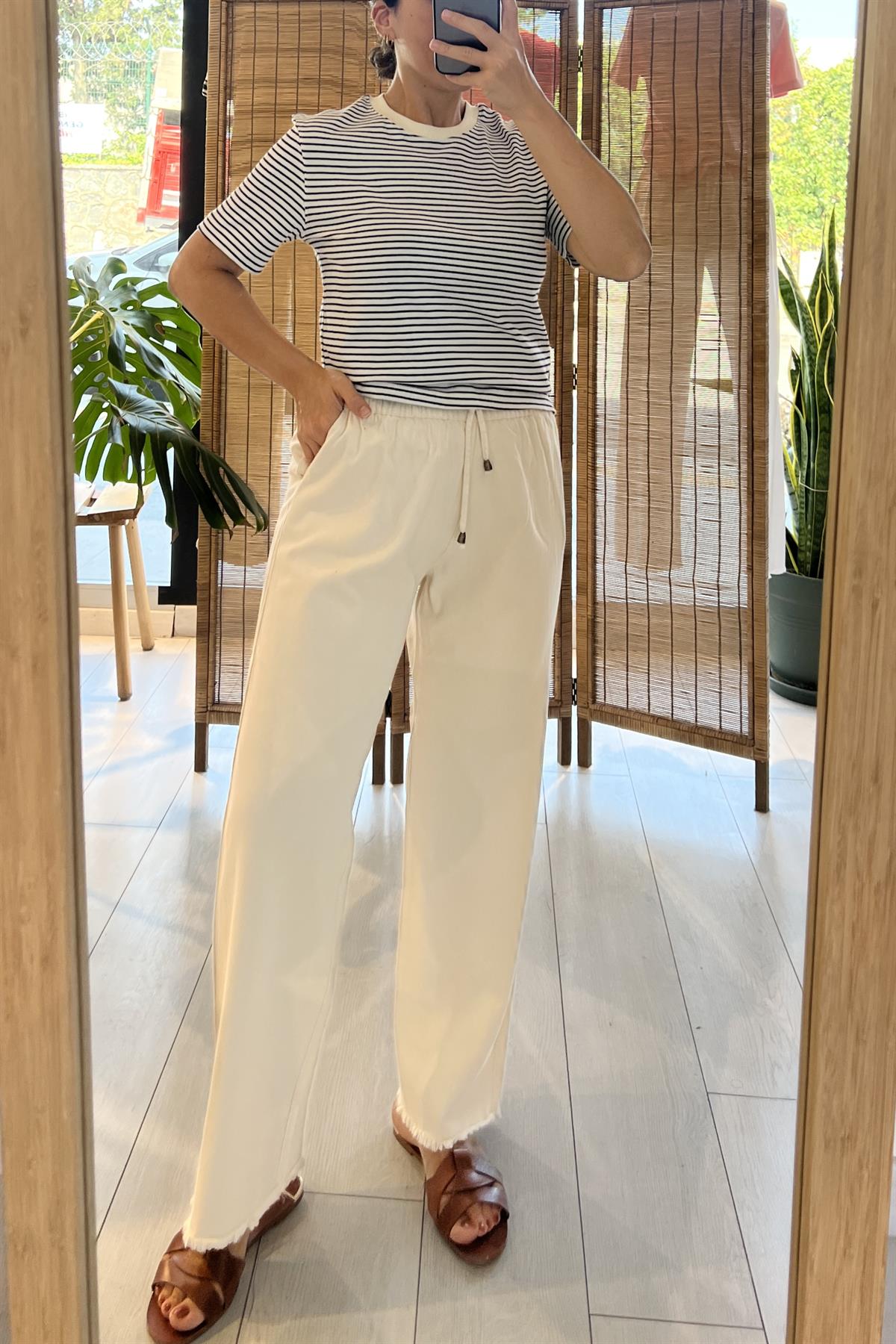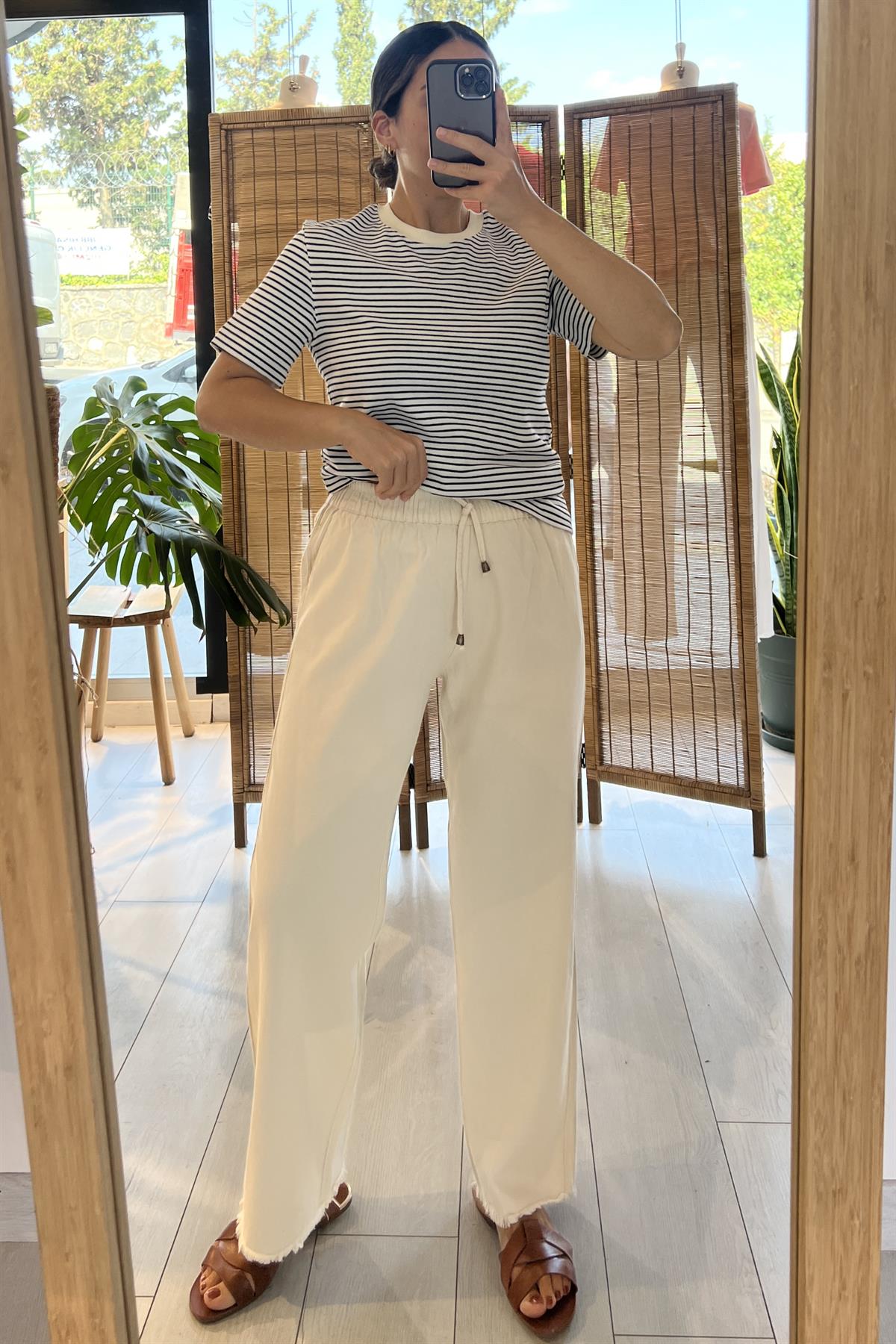 Ekru Çizgili Kontrast Biyeli Tshirt