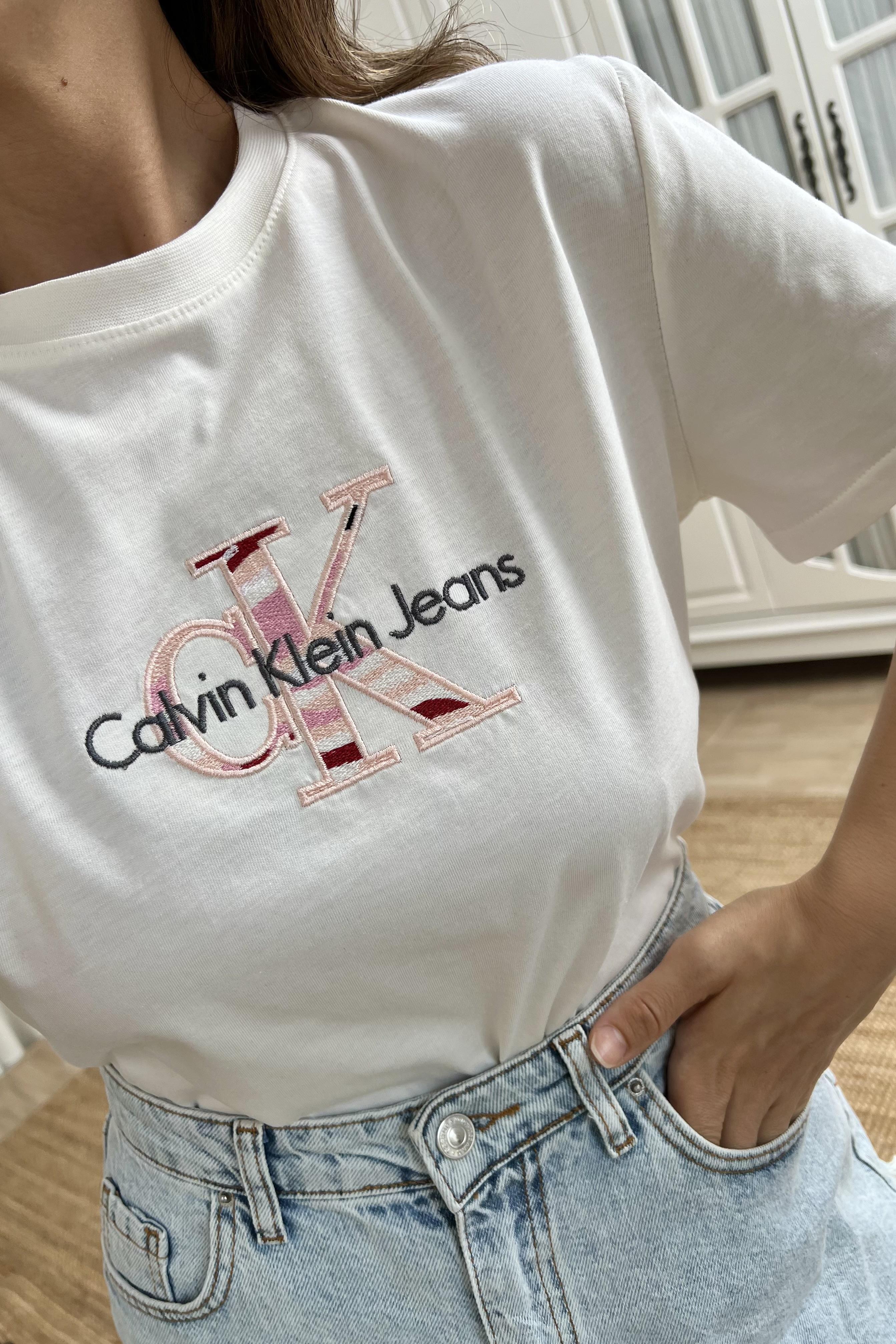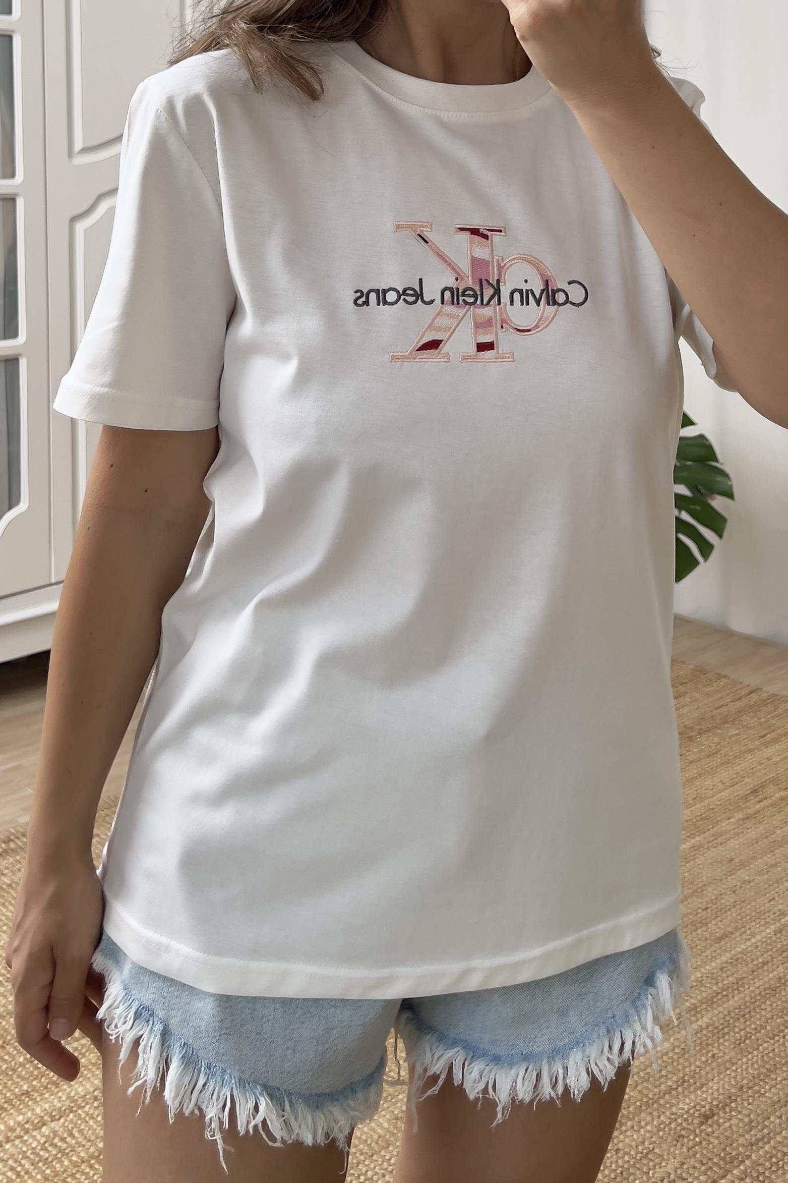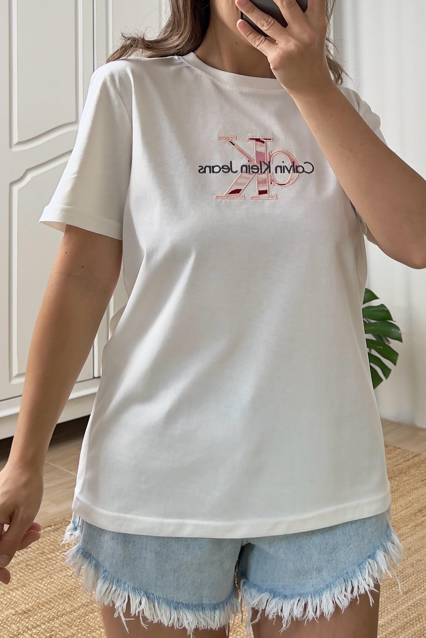 Ekru Pembe Desen Nakışlı Logolu Tshirt