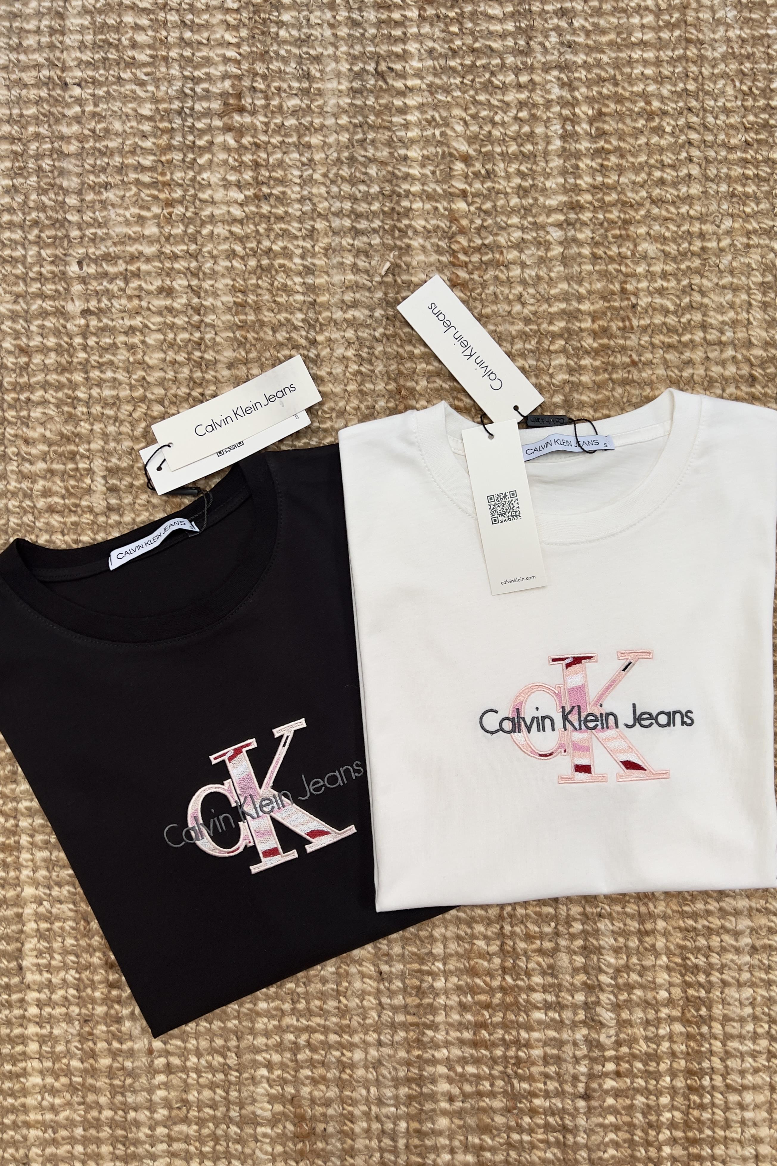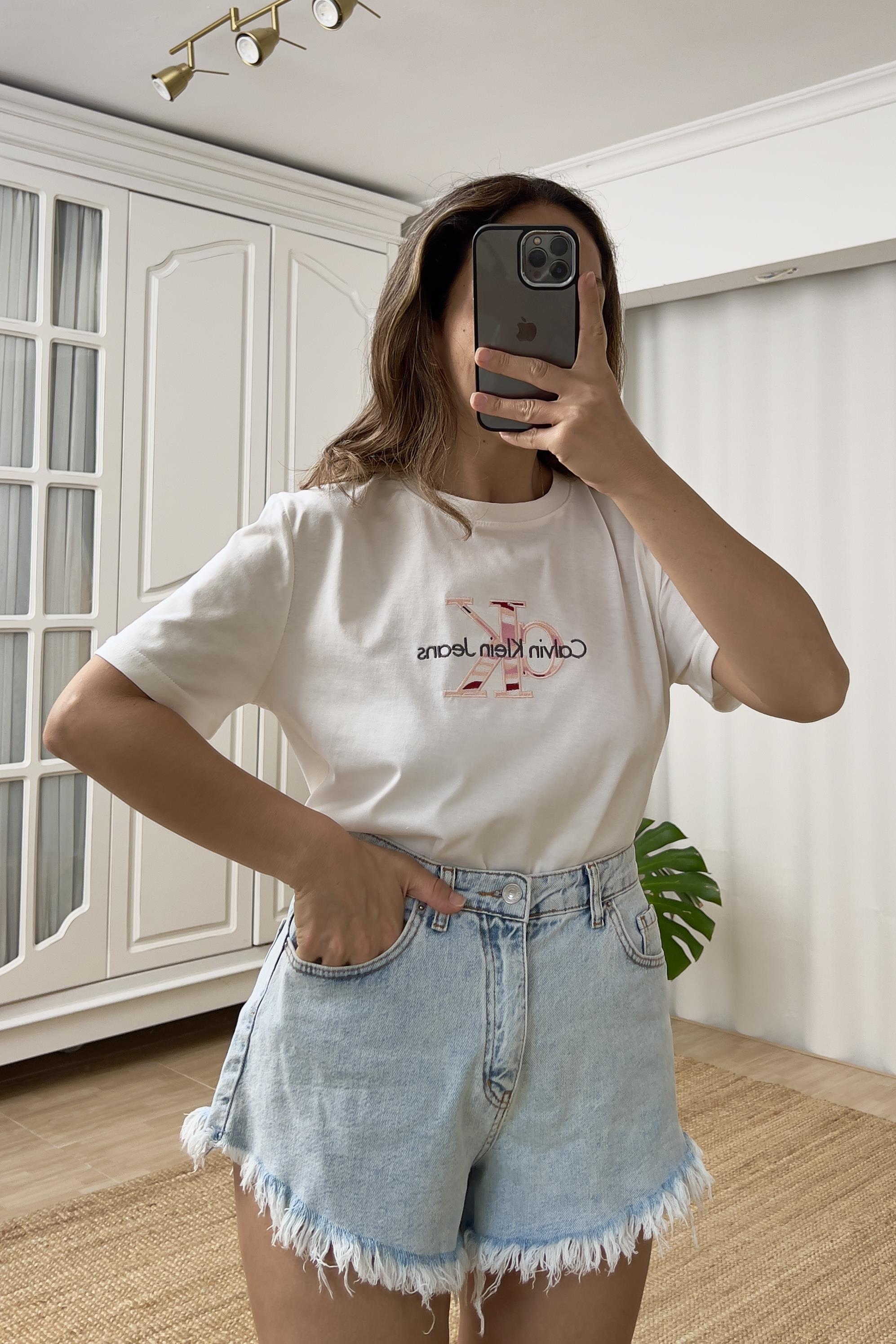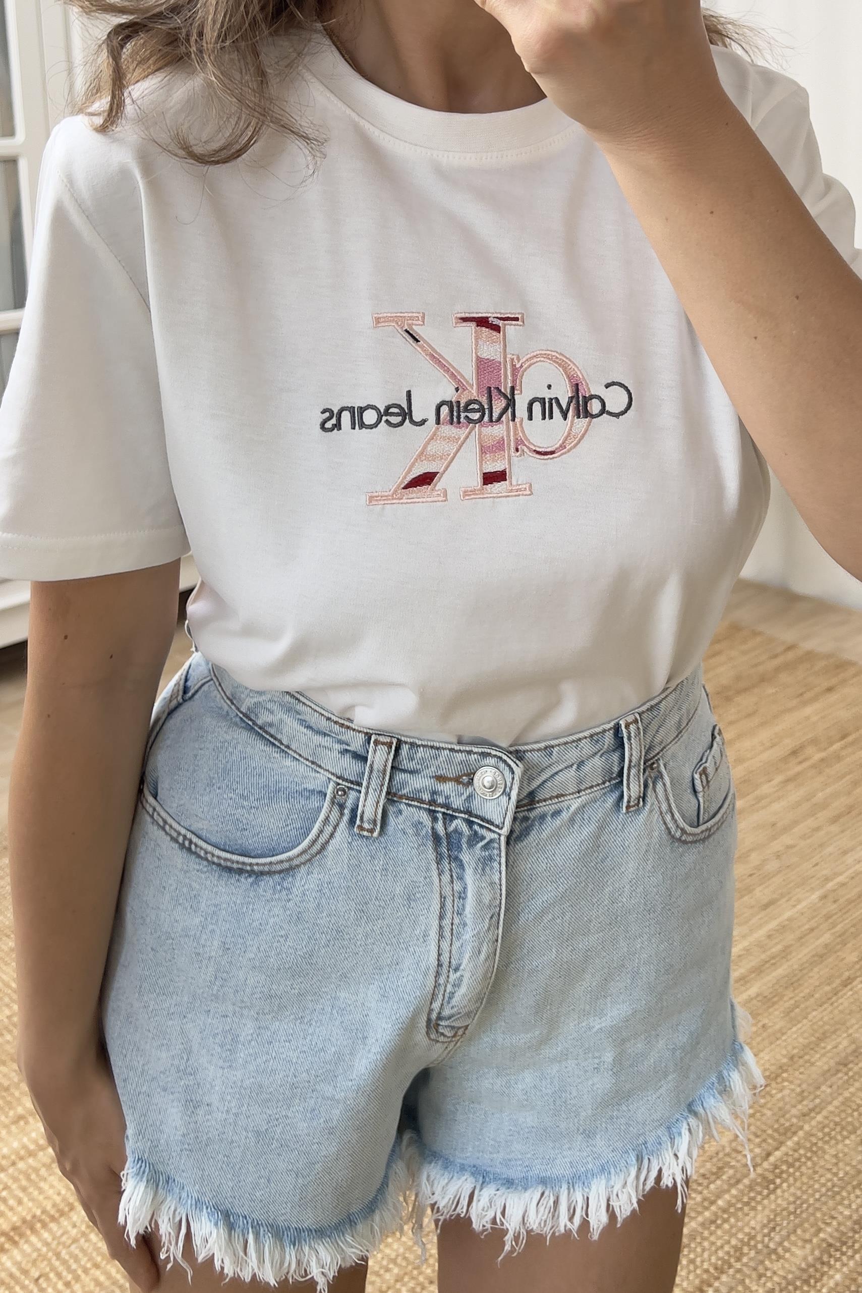 Ekru Pembe Desen Nakışlı Logolu Tshirt