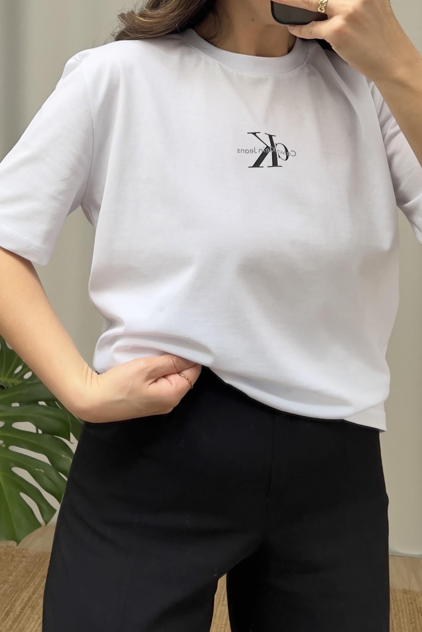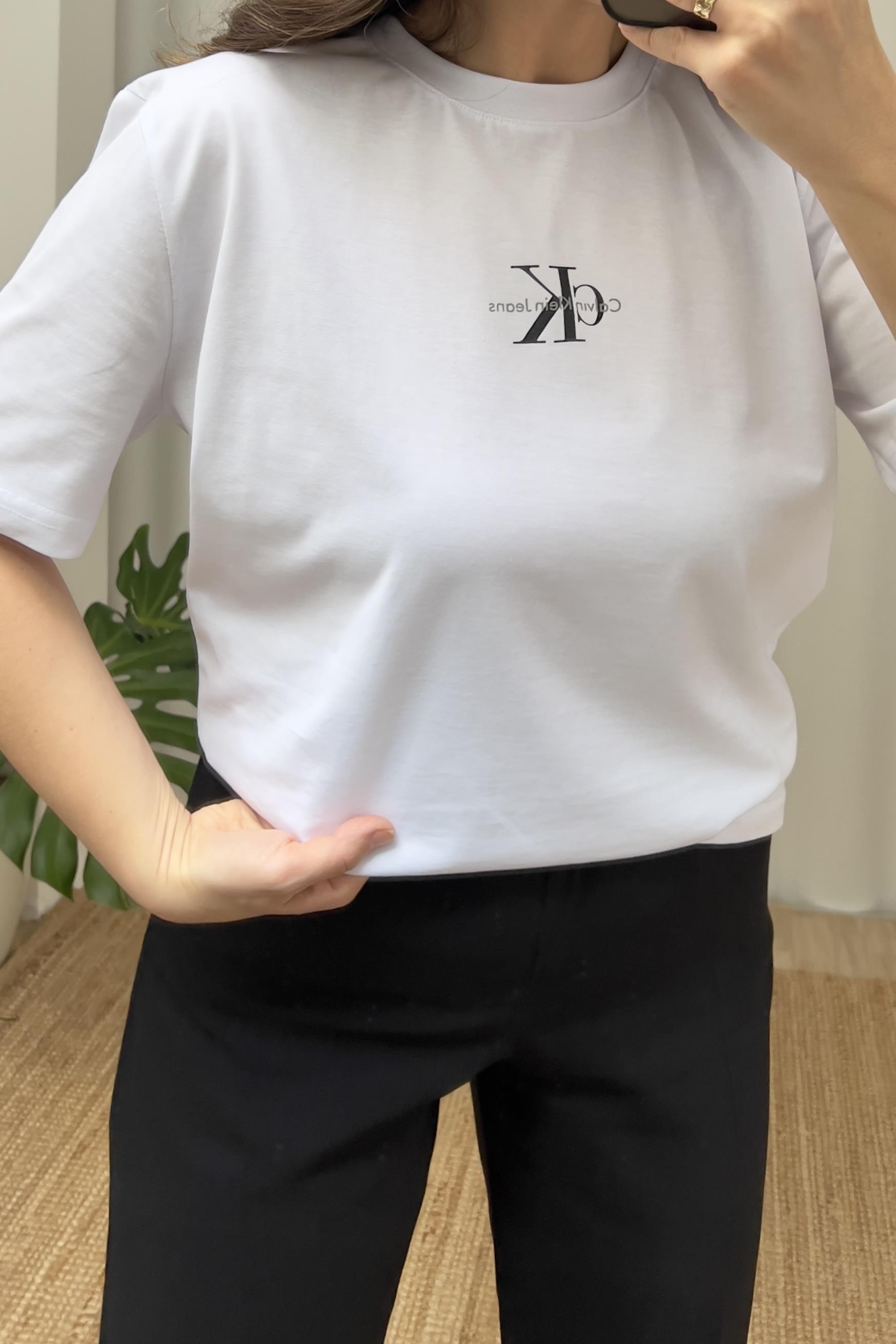 Ekru Tok Dokulu Yazı Logolu Tshirt