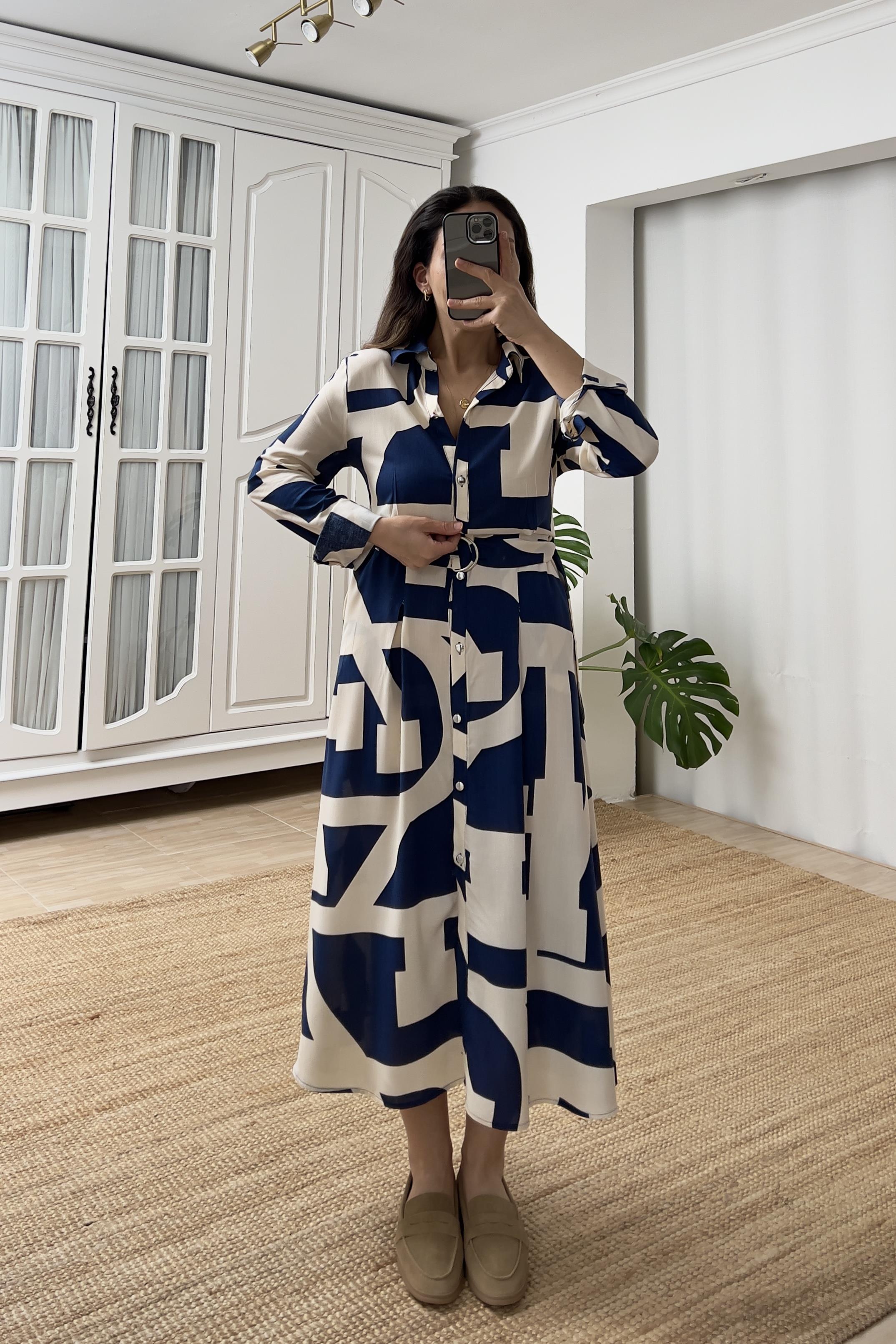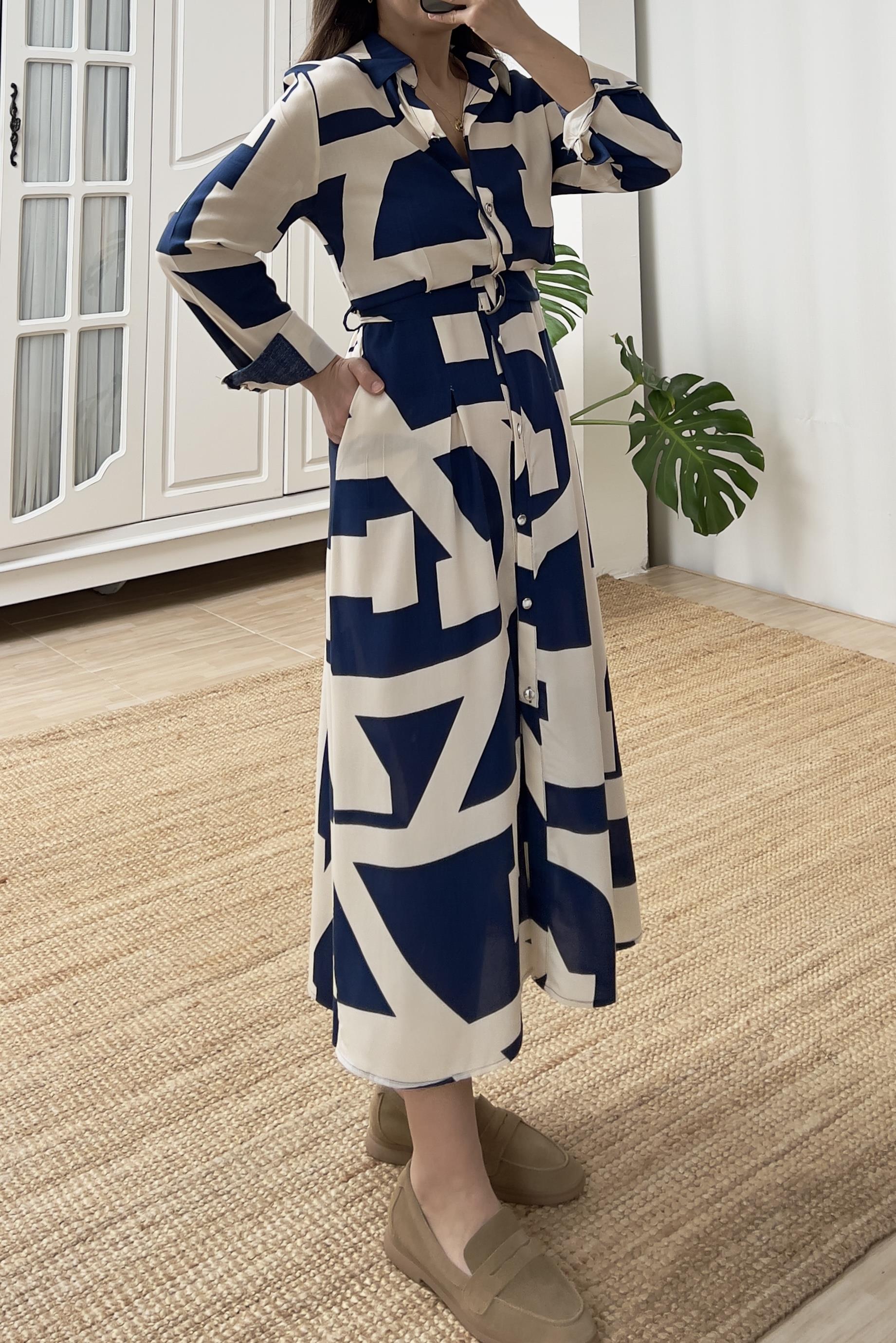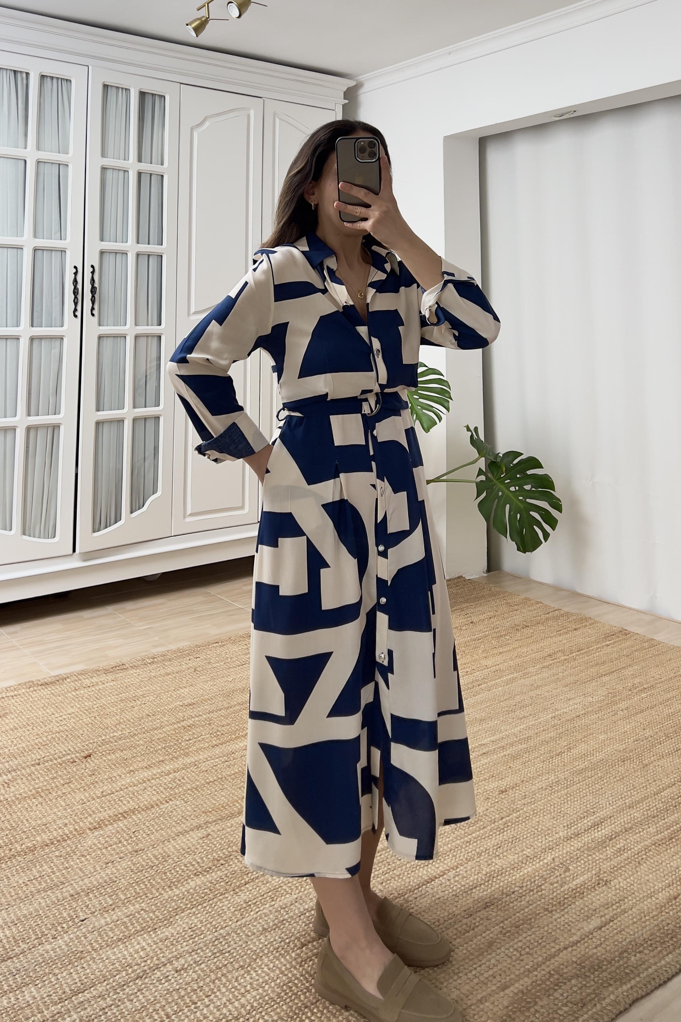 Geometrik Desenli Kuşaklı Gömlek Elbise