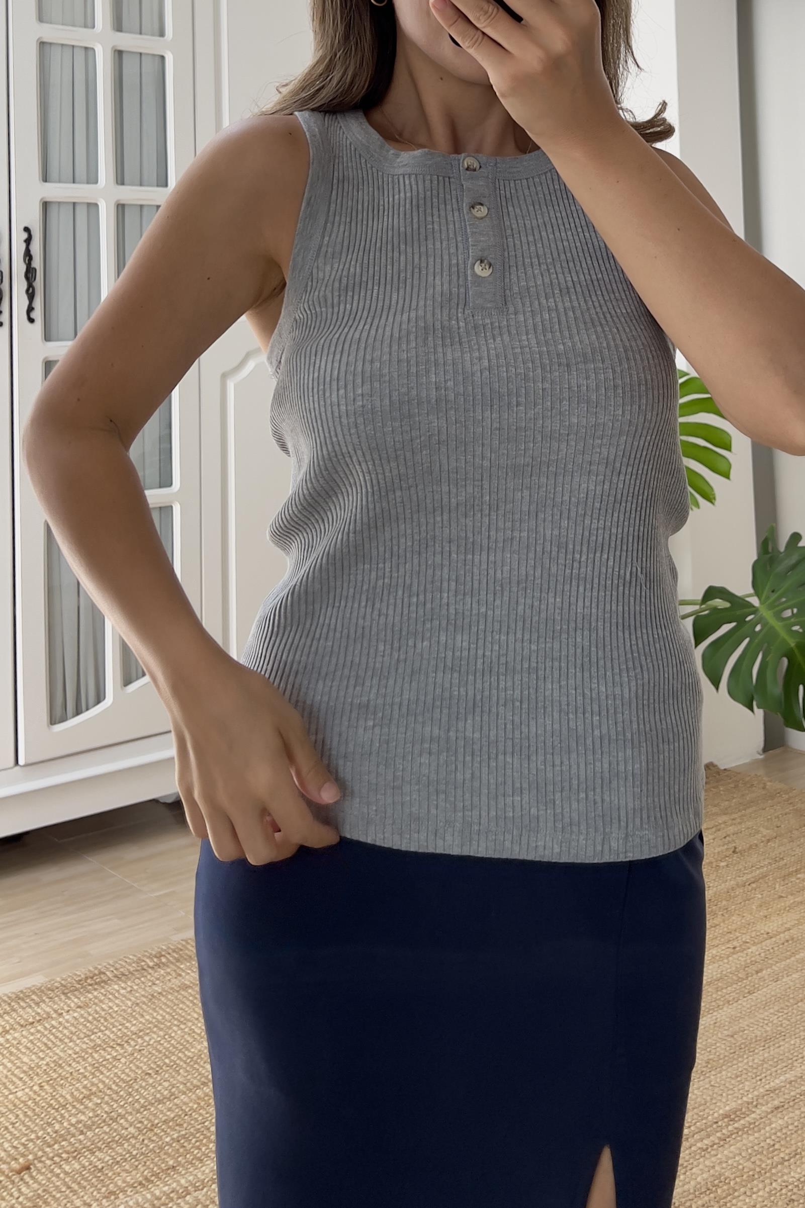 Gri Kendinden Fitilli Kolsuz Bluz
