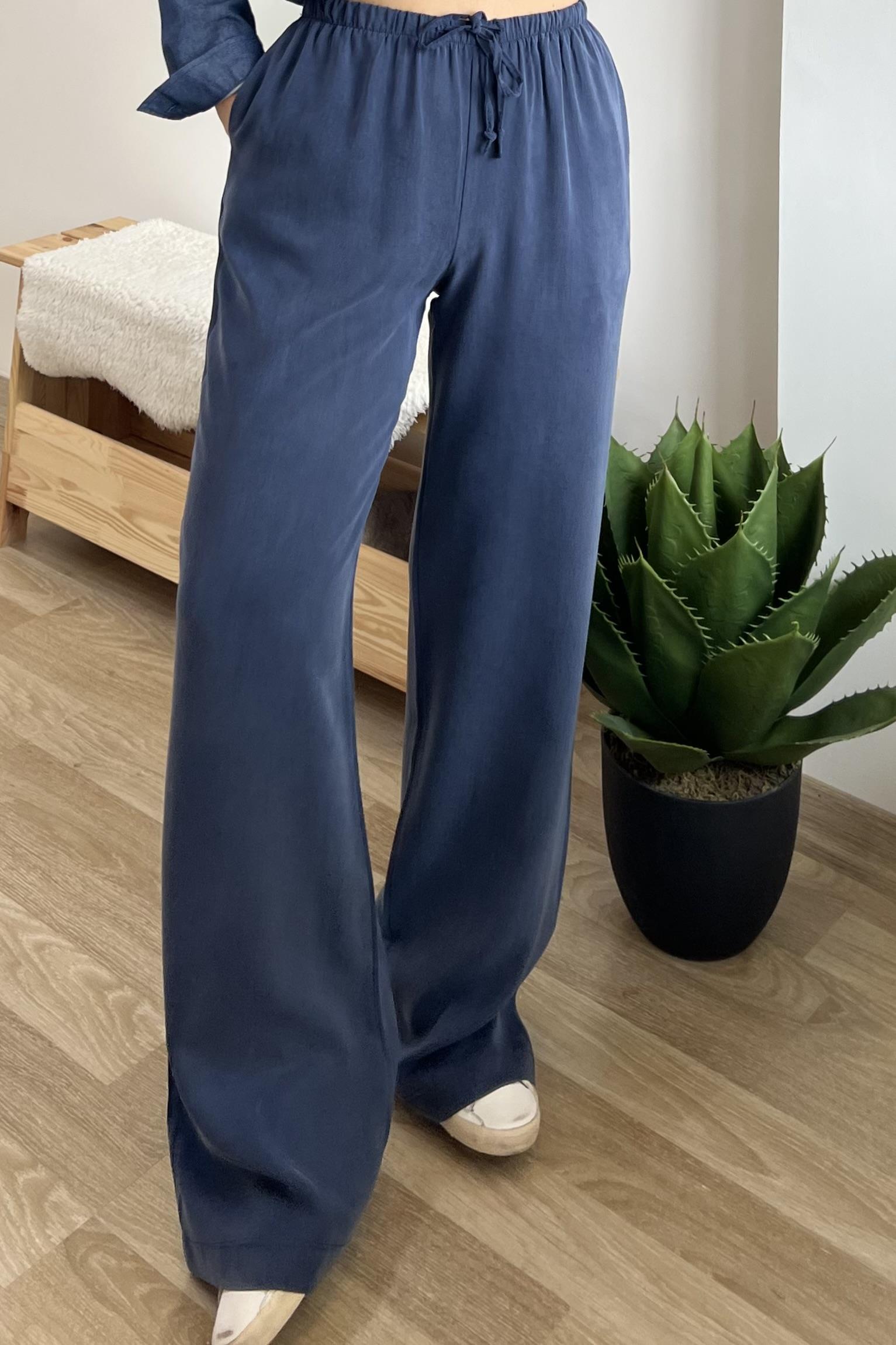 Lacivert Beli Lastikli Dökümlü Tensel Pantolon