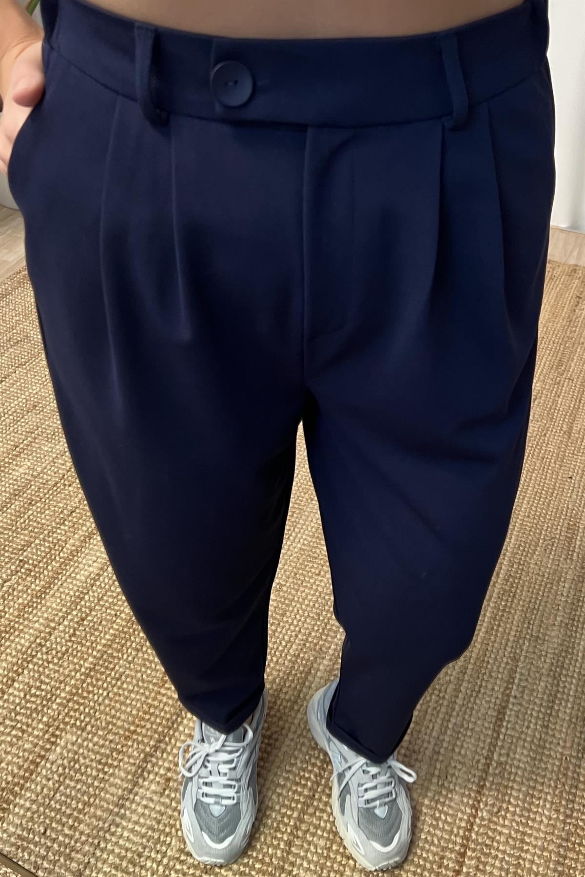 Lacivert Beli Lastikli Pileli Rahat Pantolon