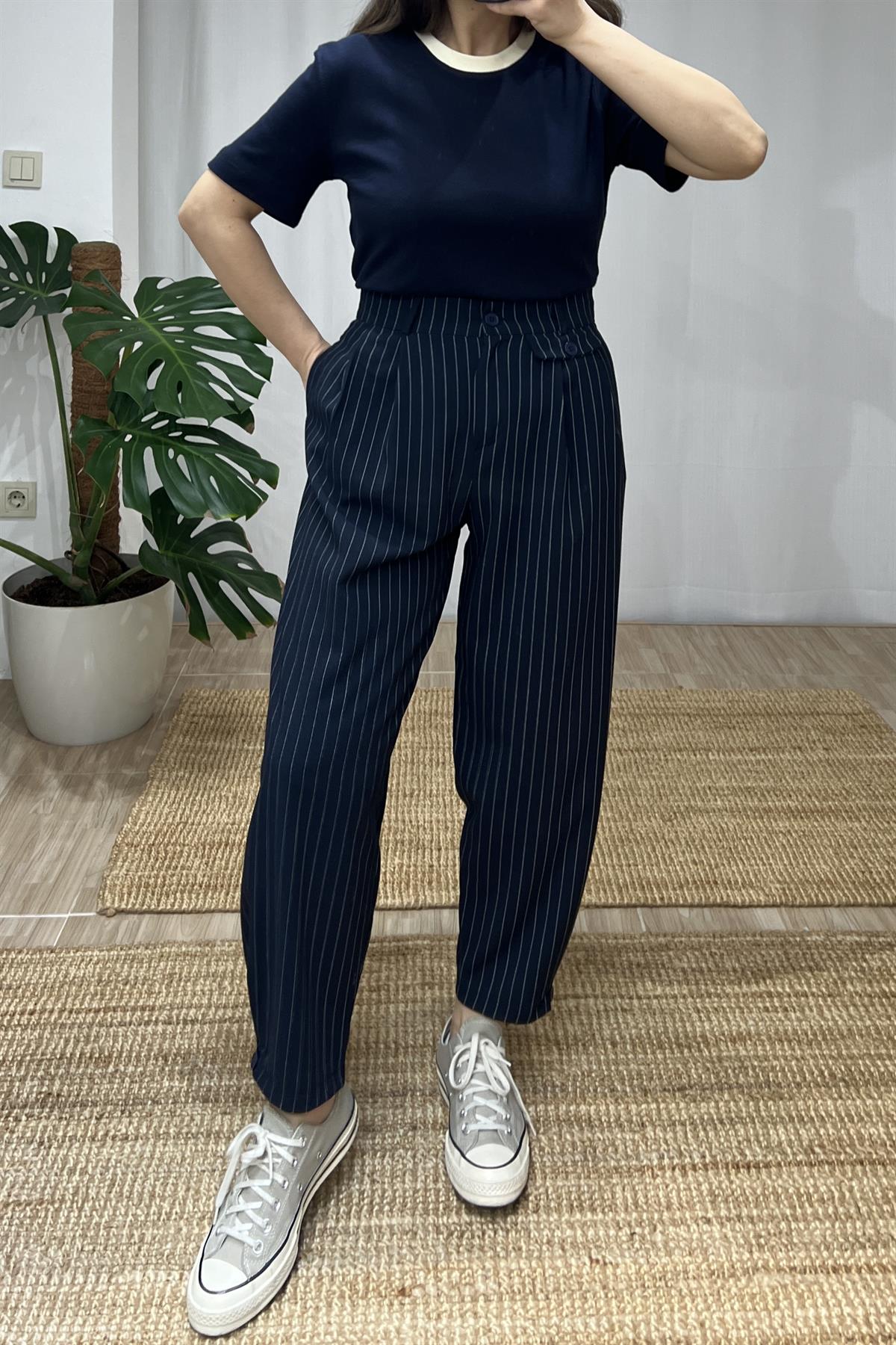Lacivert Çizgili Kapak Cepli Paçası Düğmeli Pantolon