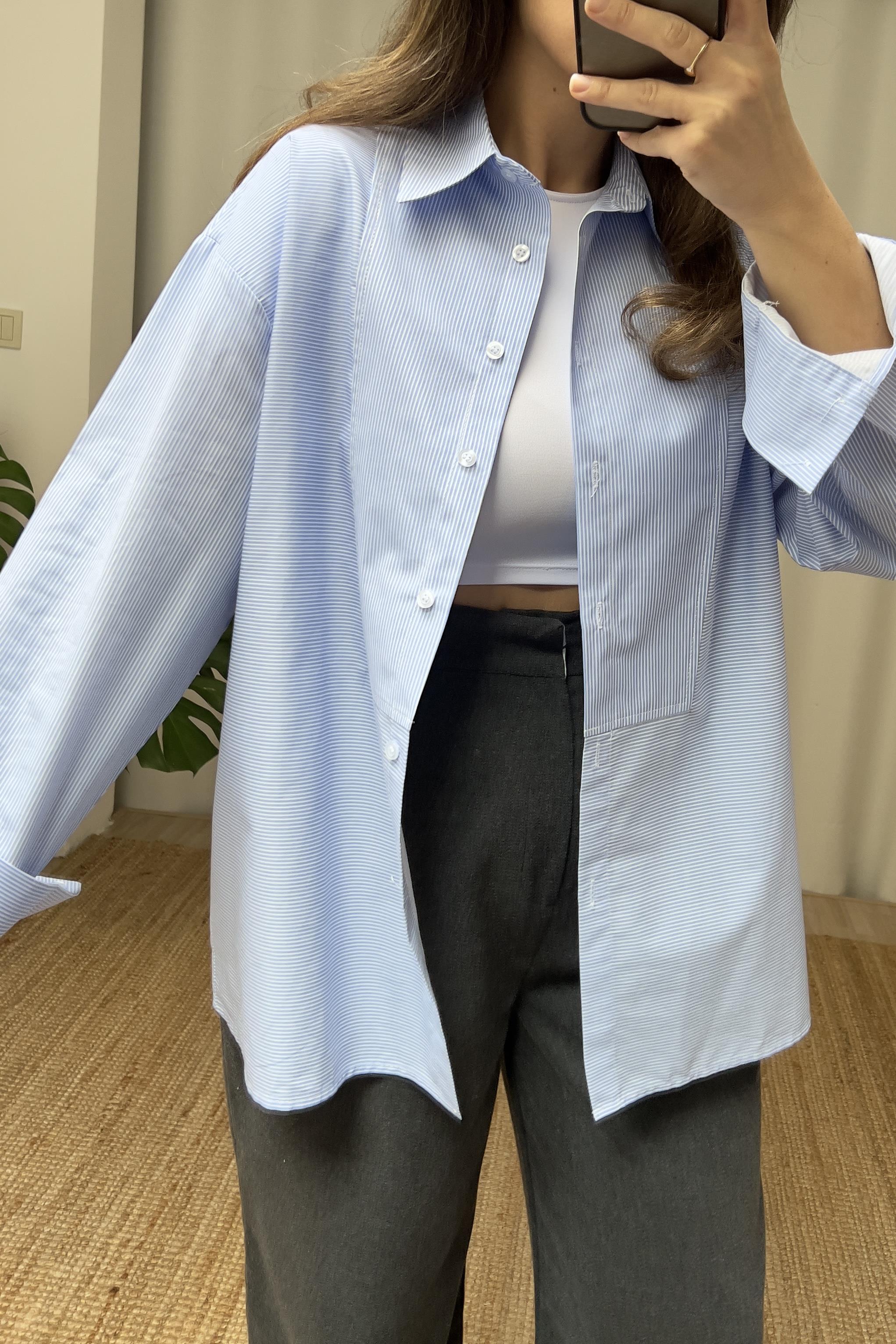 Mavi Çizgili Dikiş Detaylı Poplin Gömlek