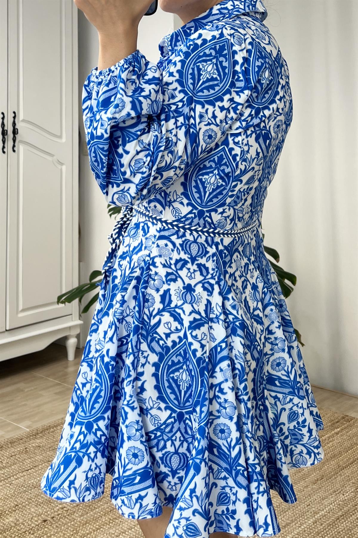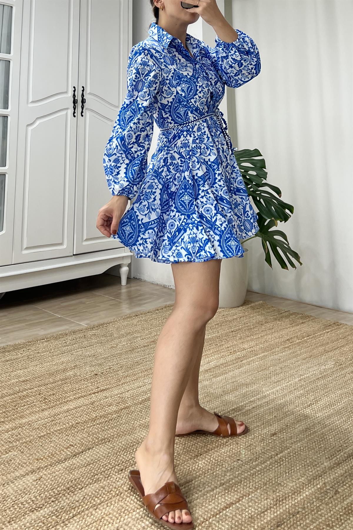 Mavi Desenli Poplin Gömlek Elbise