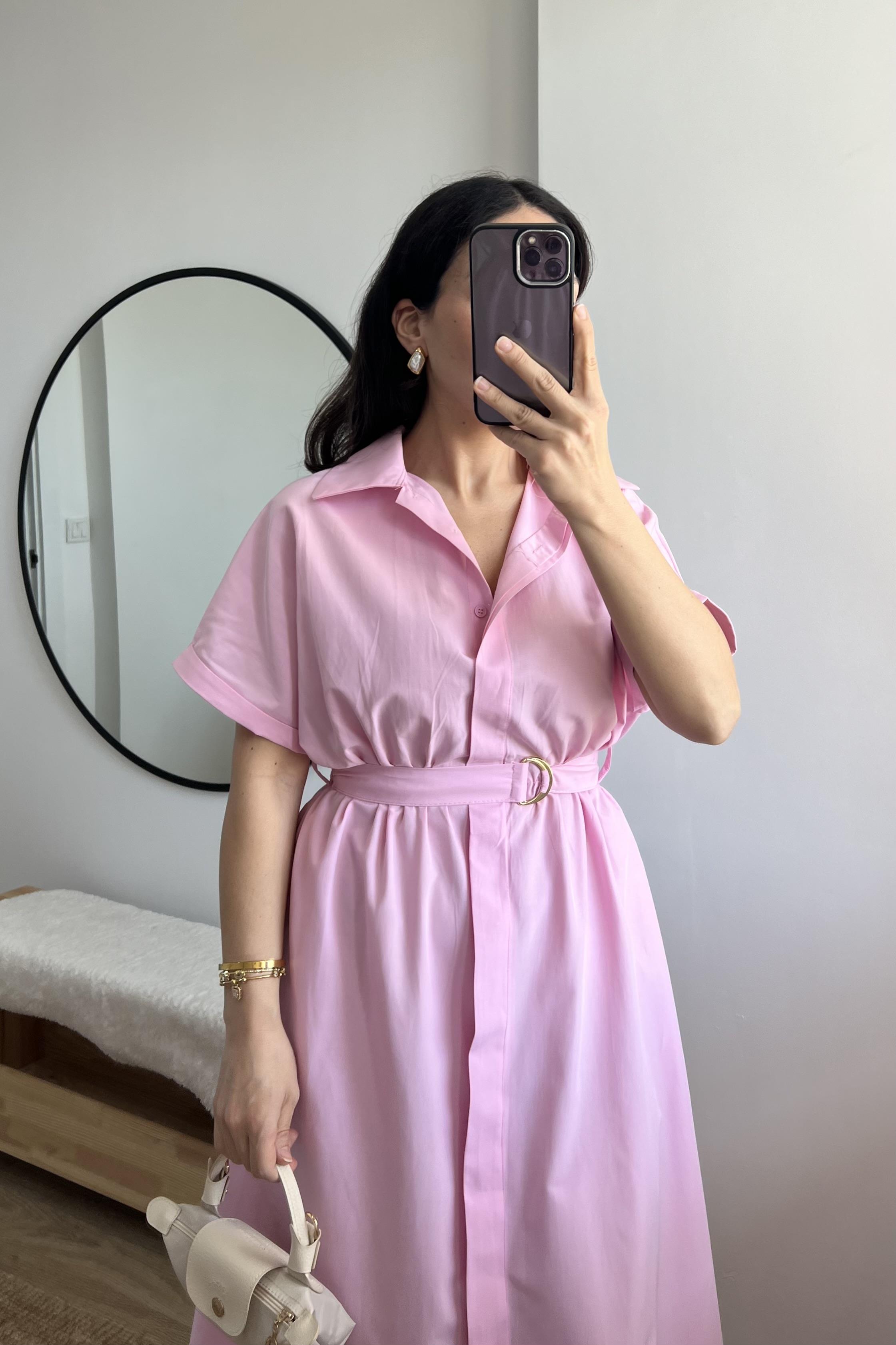 Pembe Kuşaklı Poplin Elbise