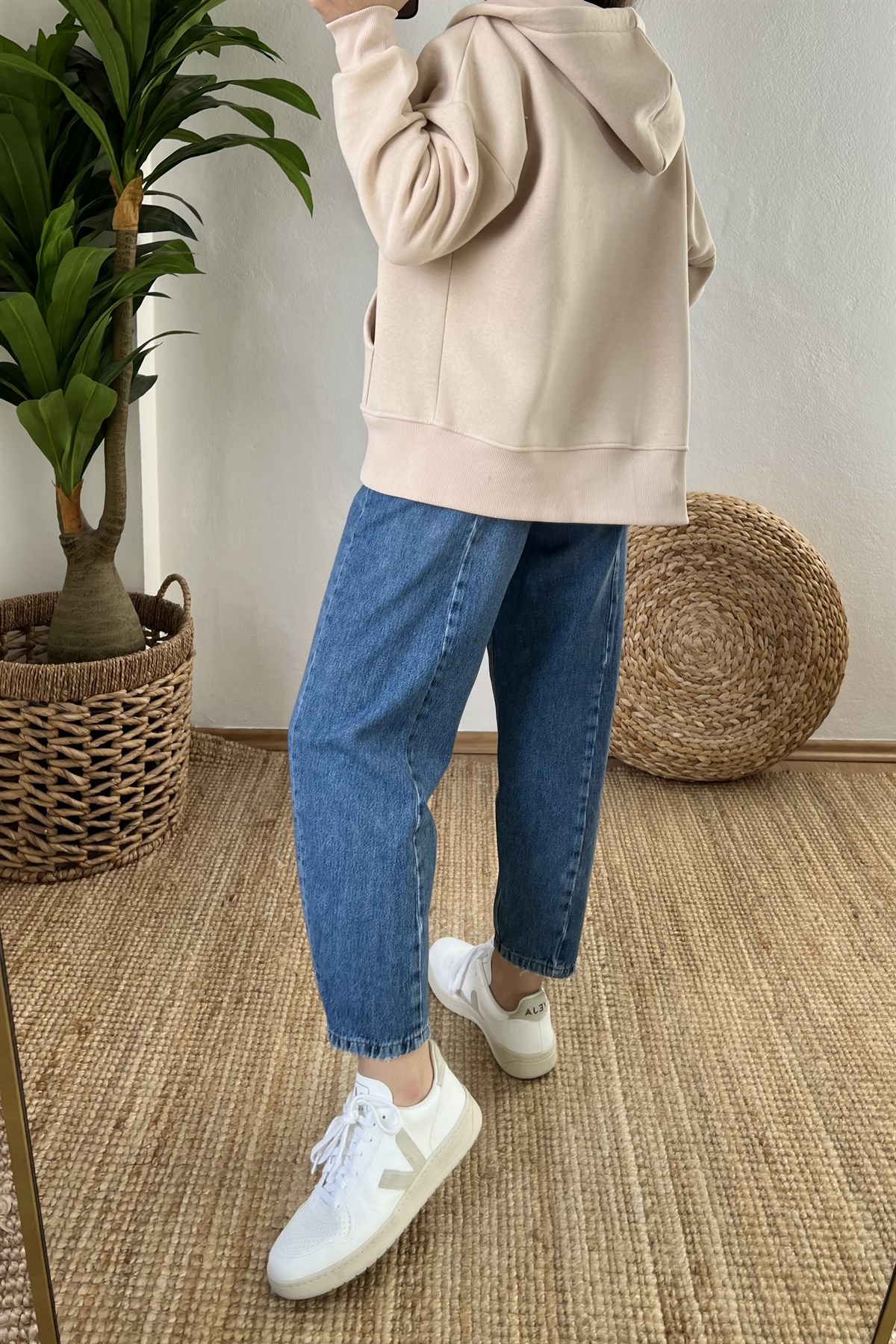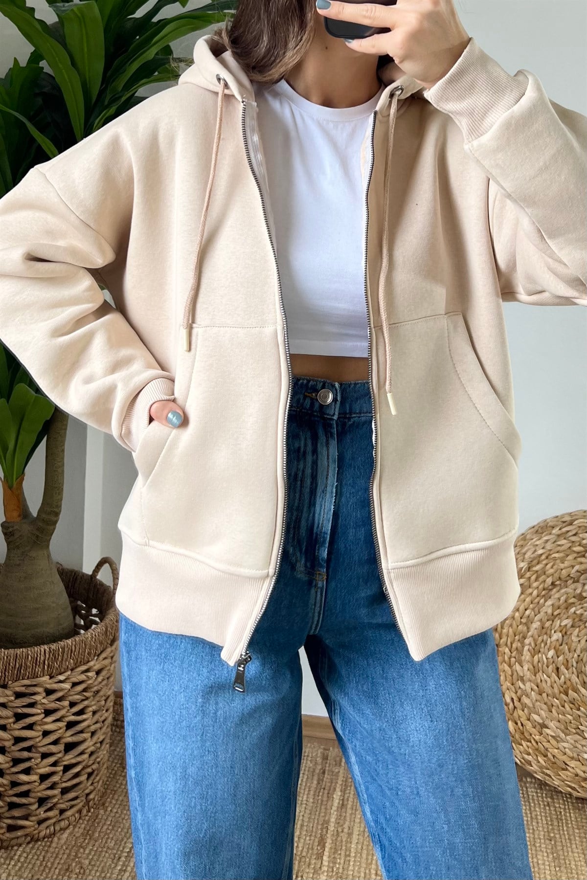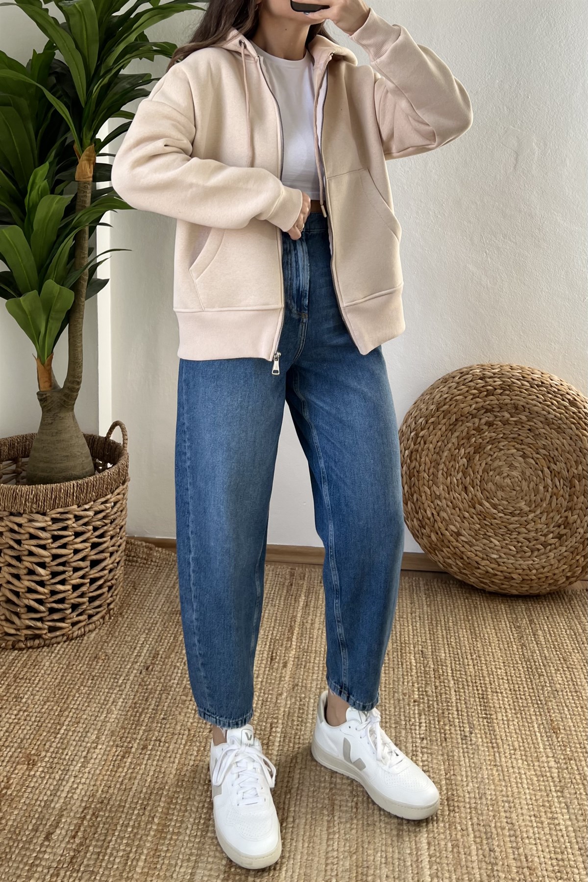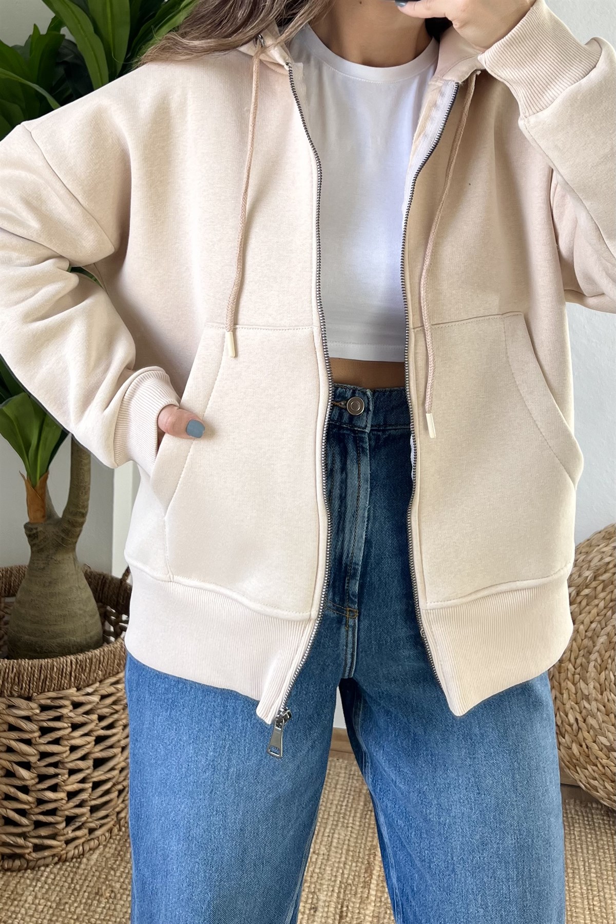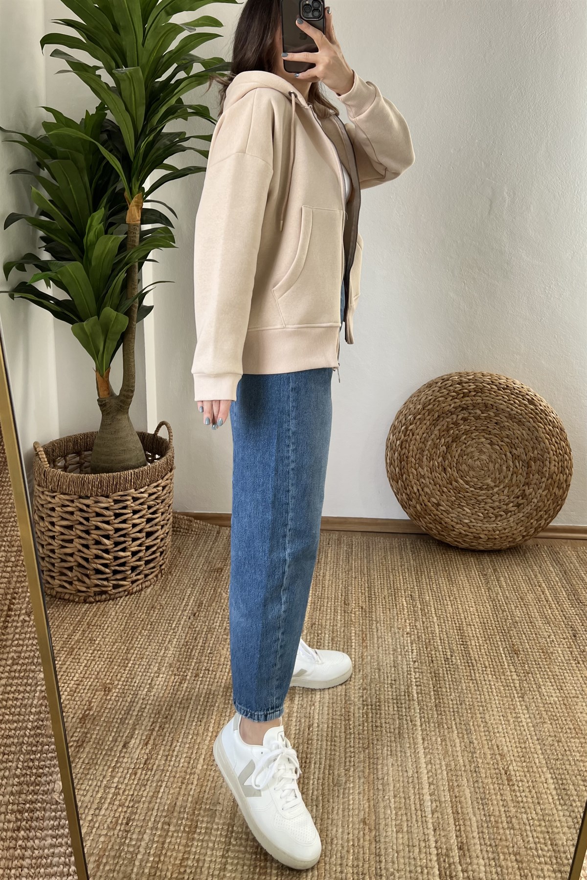 Pudra Kapüşonlu Kanguru Cepli Sweat Hırka