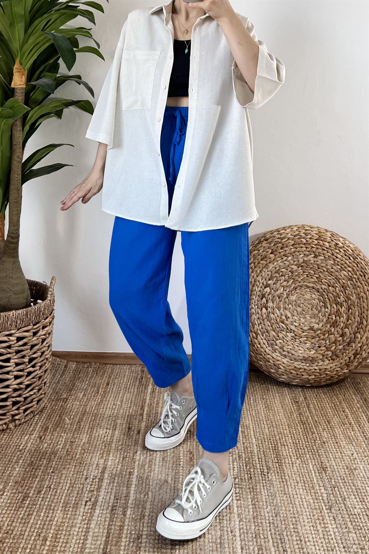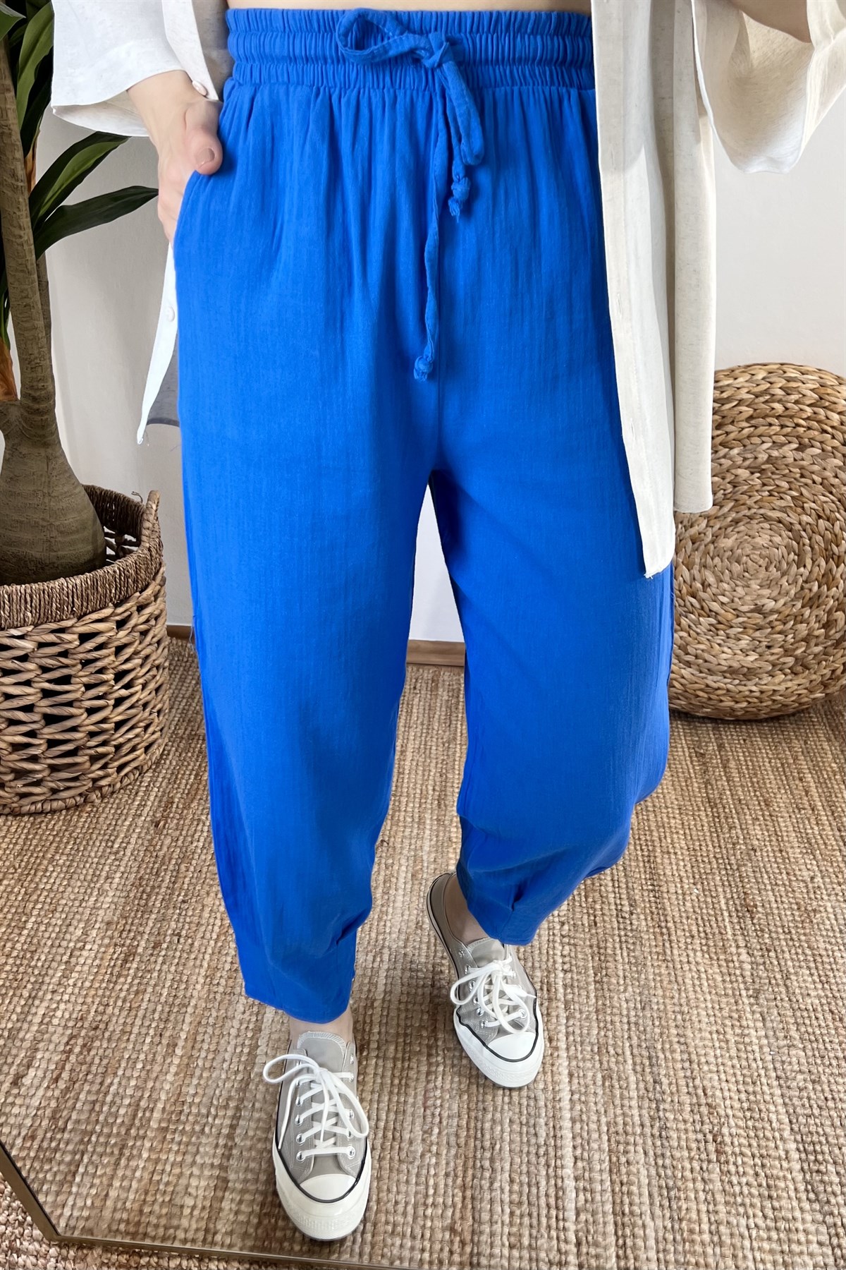Saks Mavi Beli Lastikli Paçası Pilili Keten Pantolon
