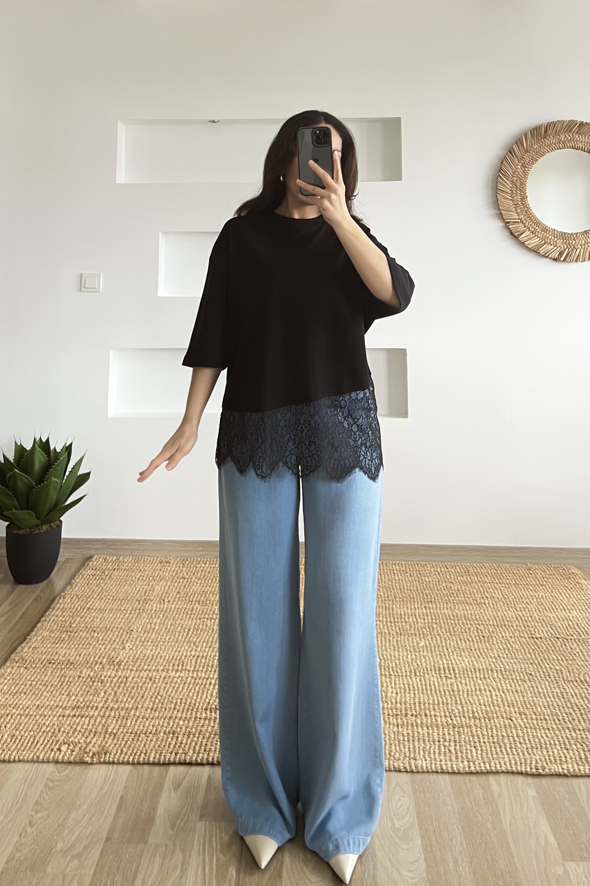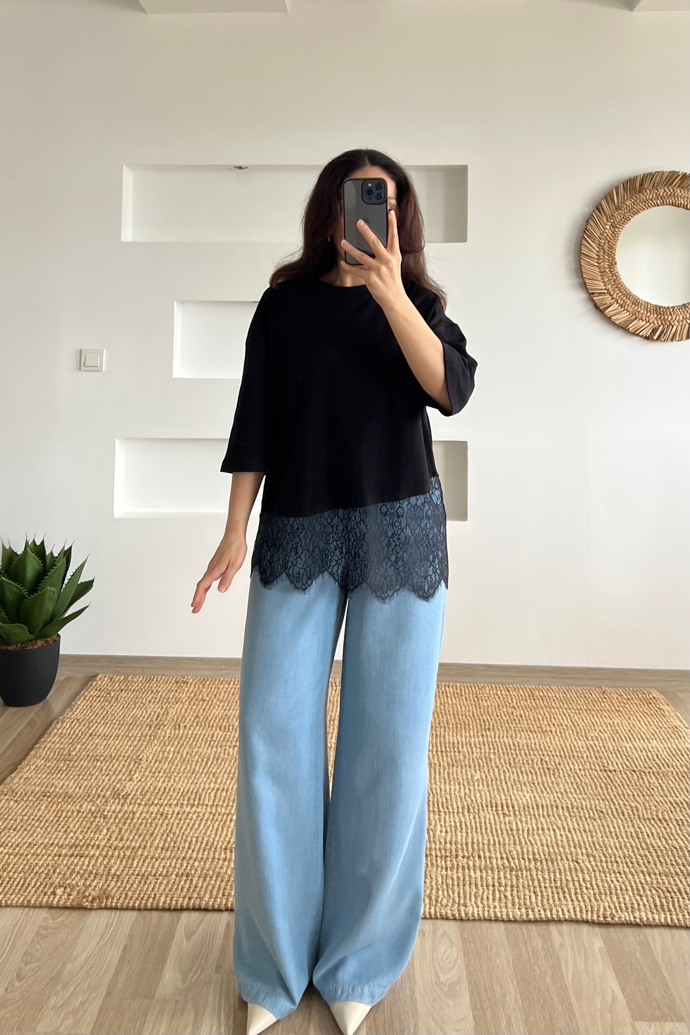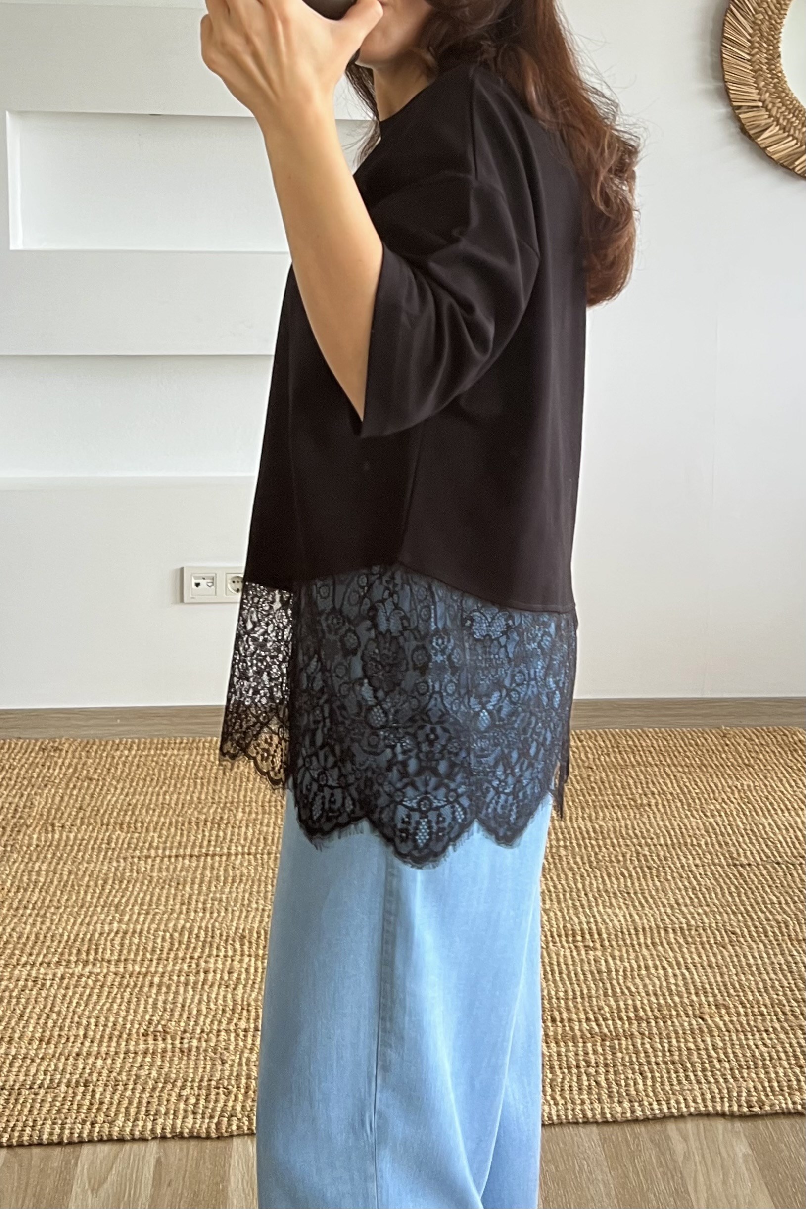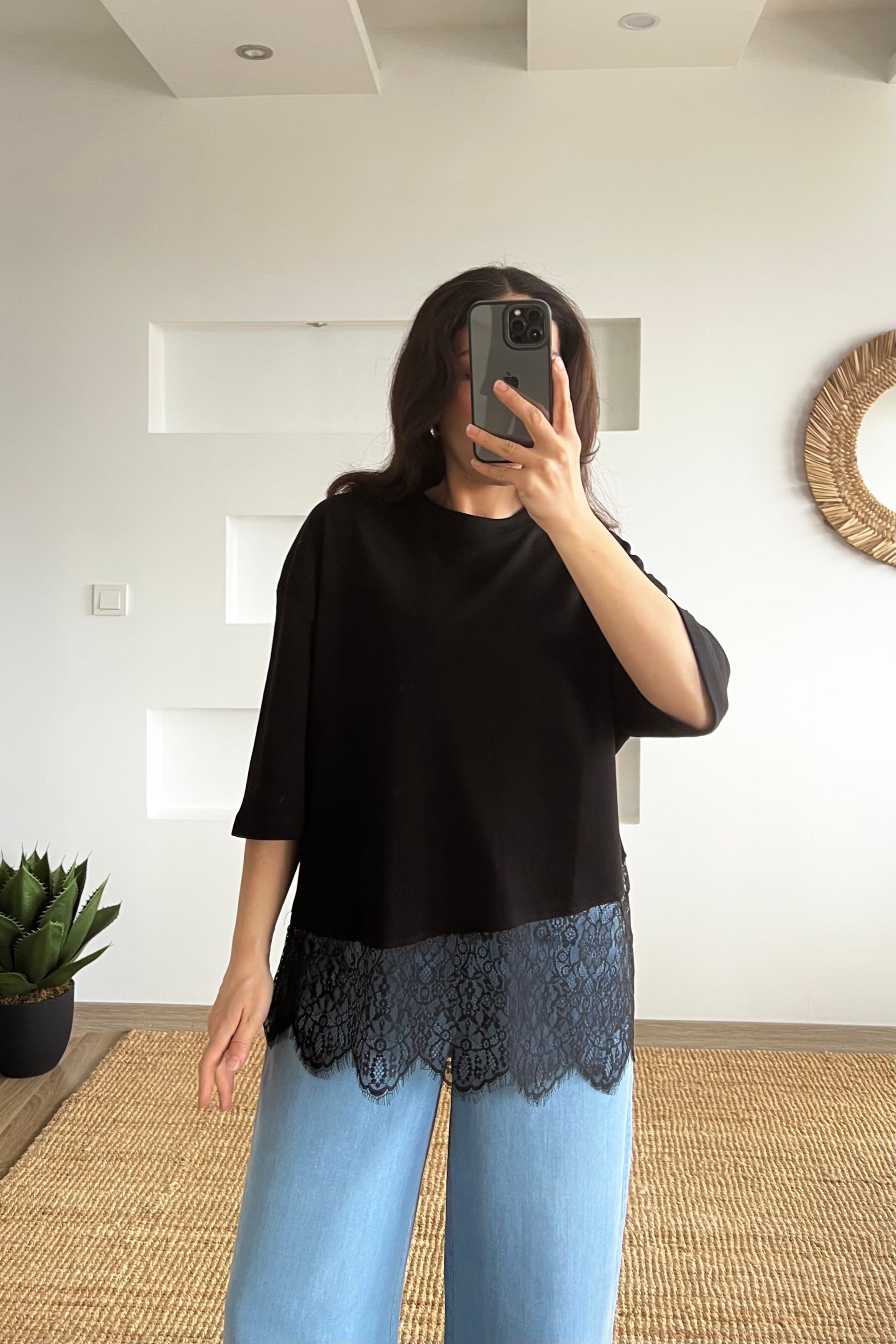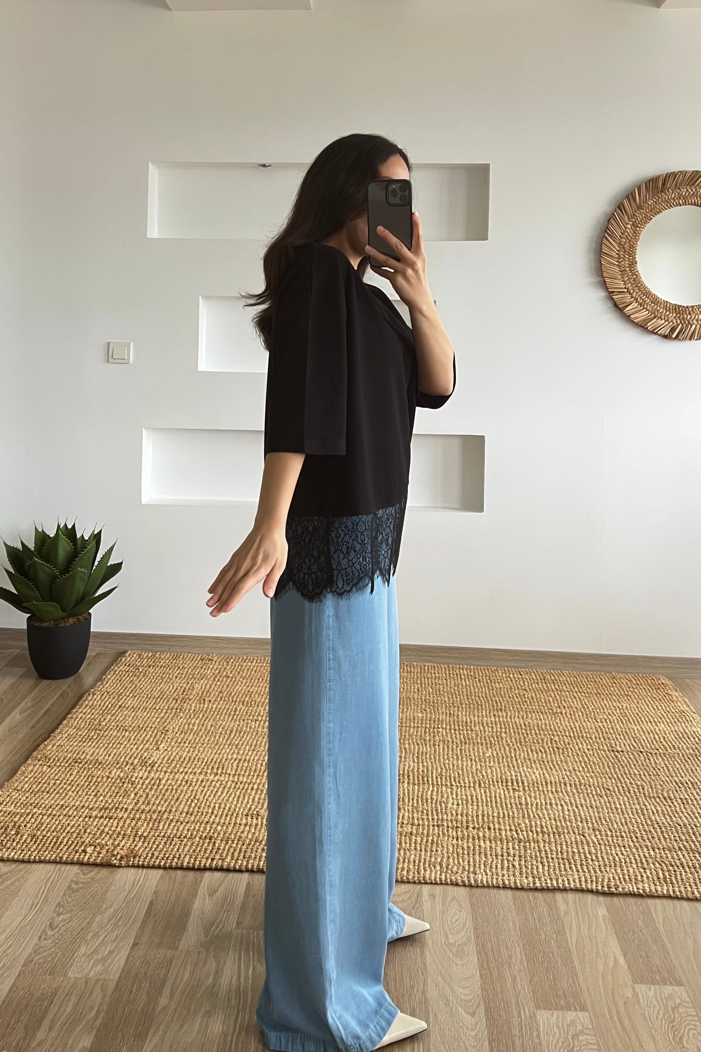 Siyah Asimetrik Dantel Detaylı Tshirt