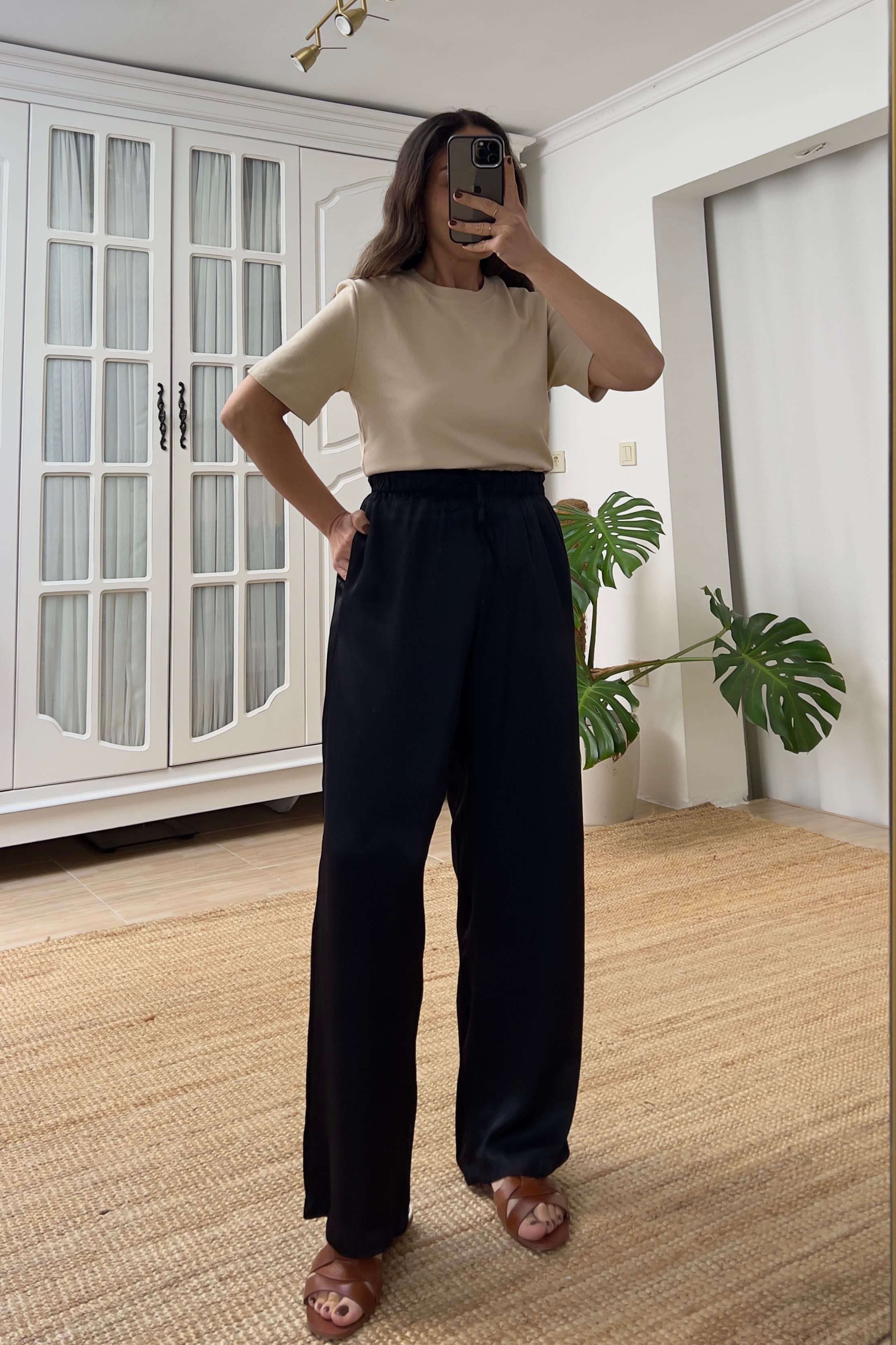 Siyah Beli Lastikli İpek Saten Dökümlü Pantolon