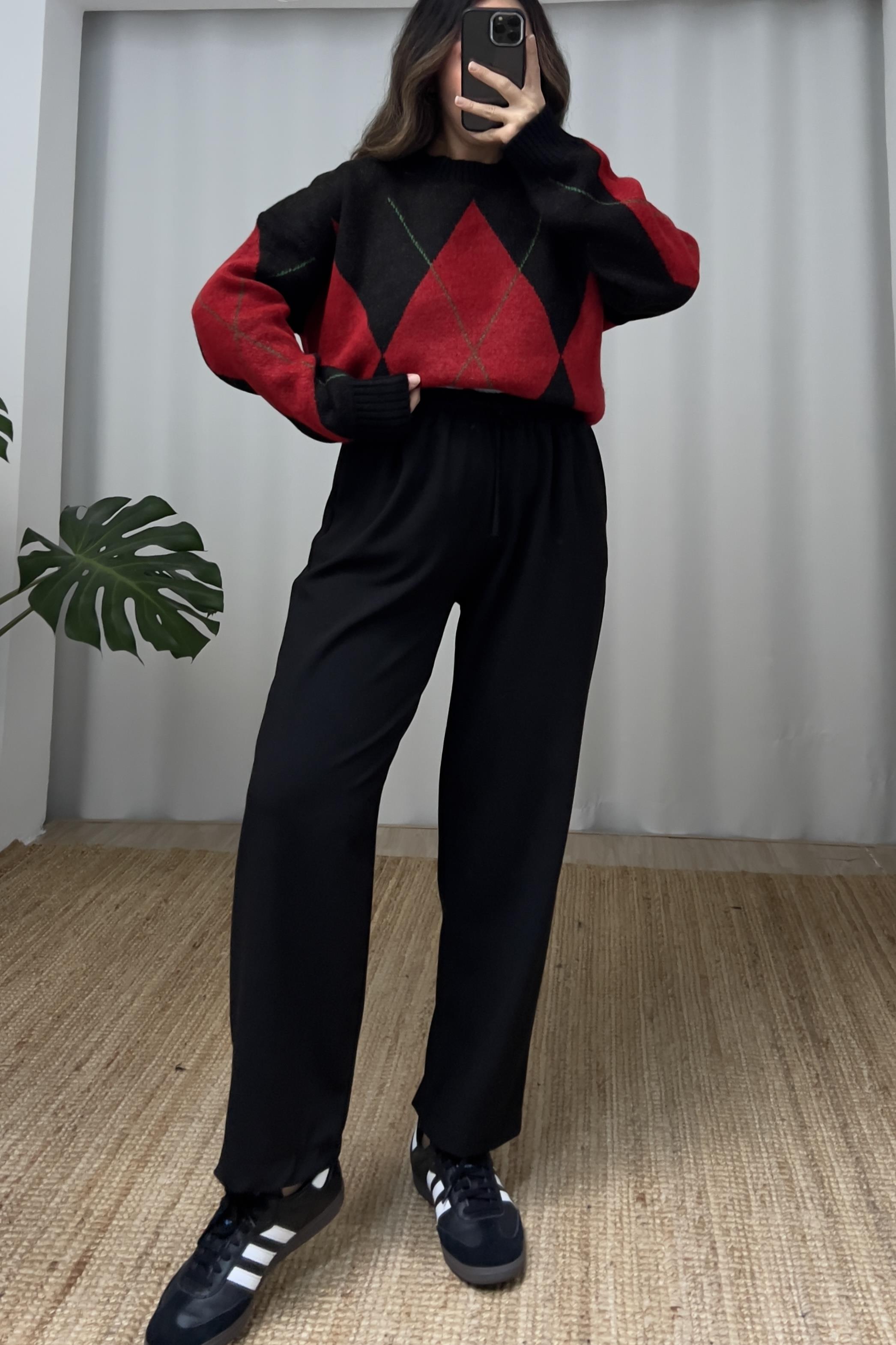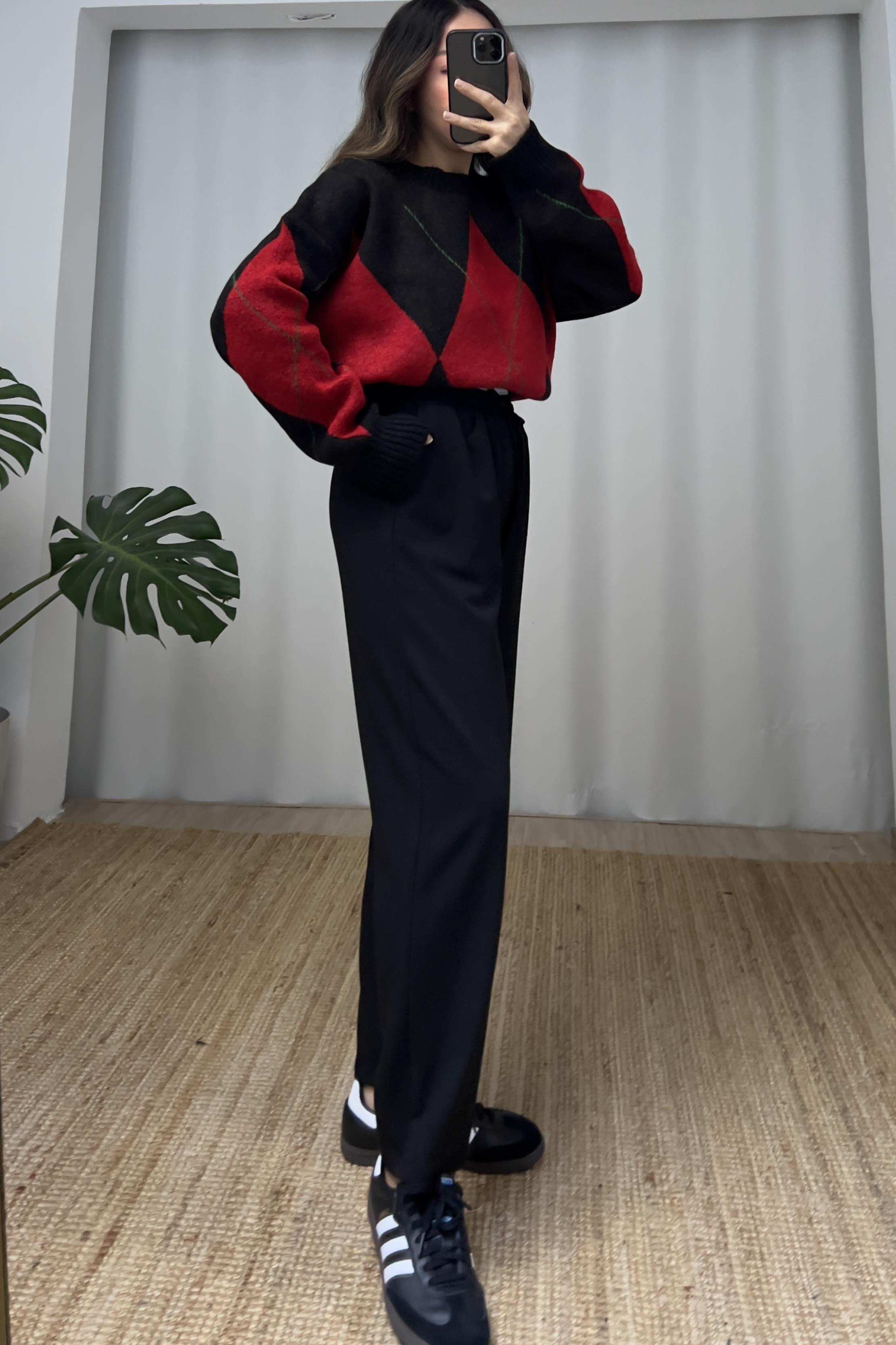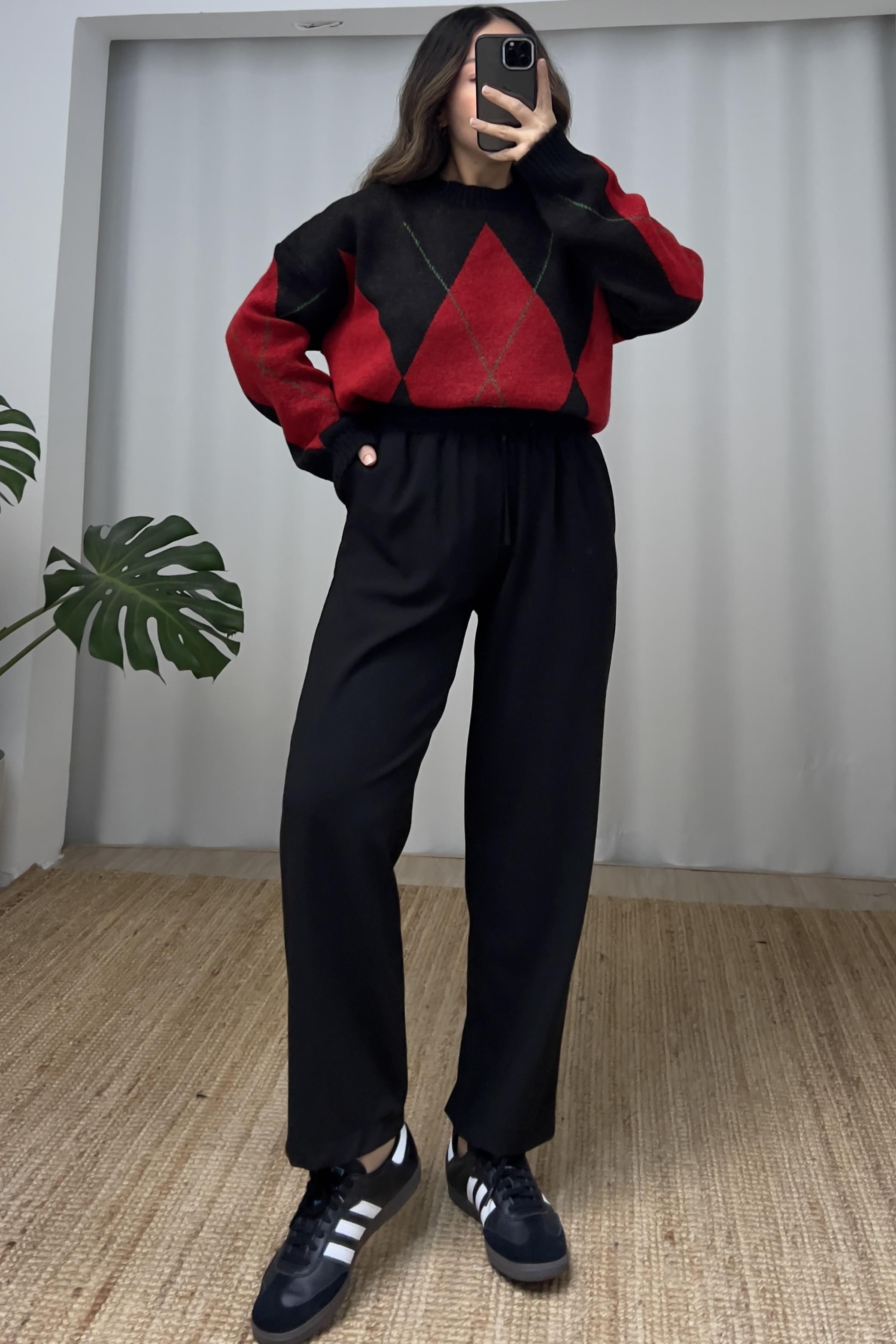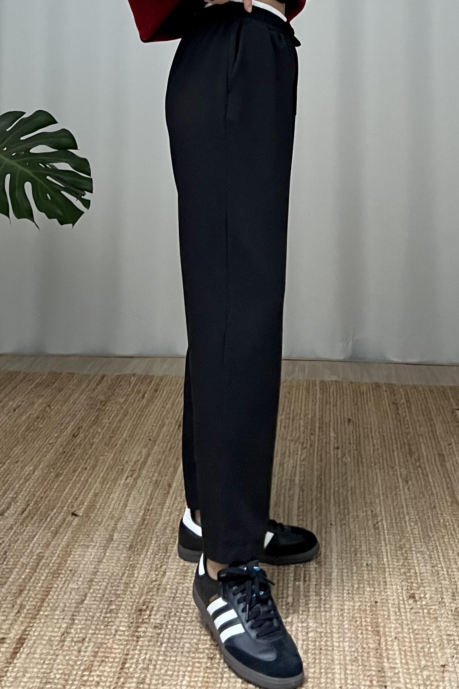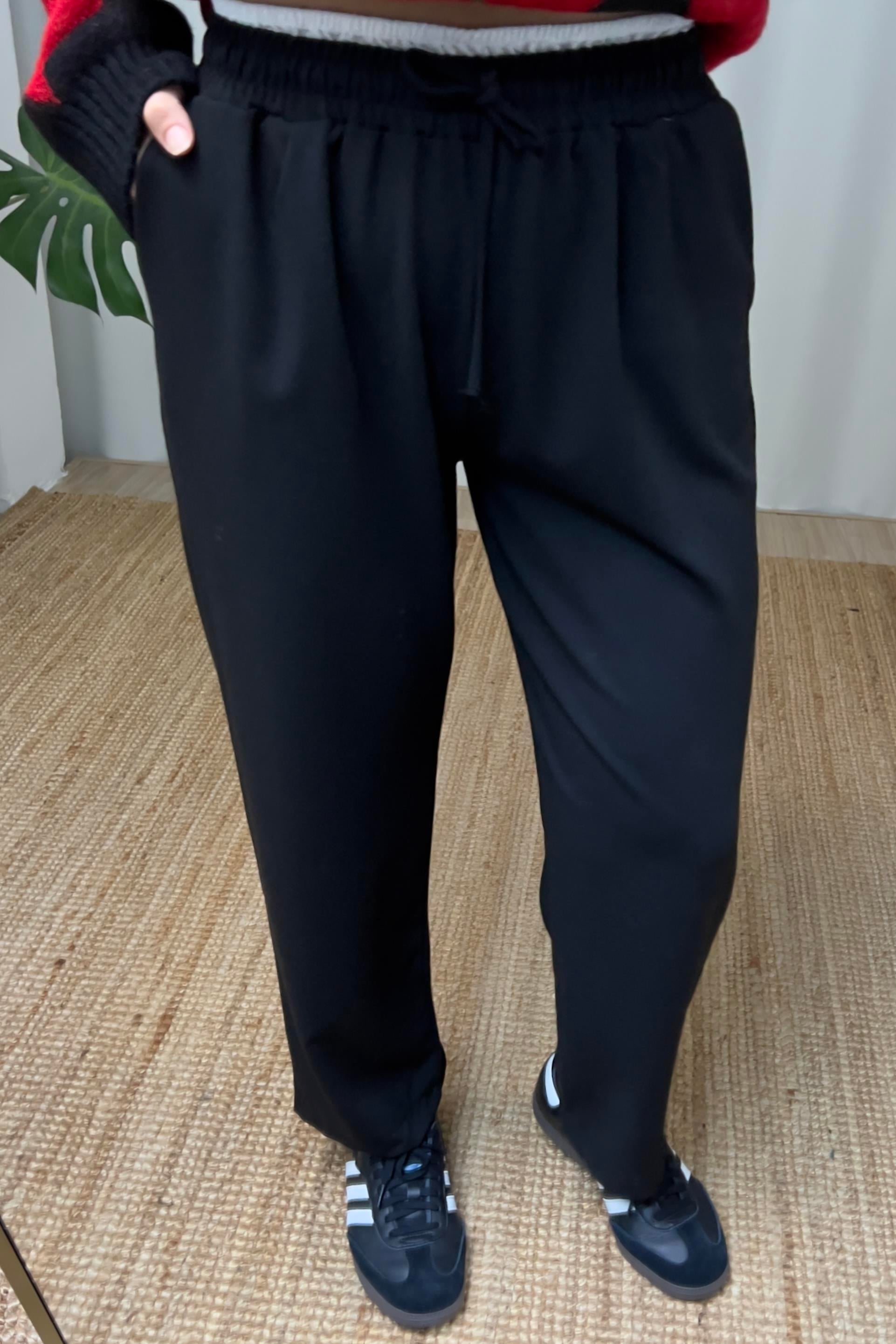 Siyah Çift Bel Detaylı Rahat Pantolon