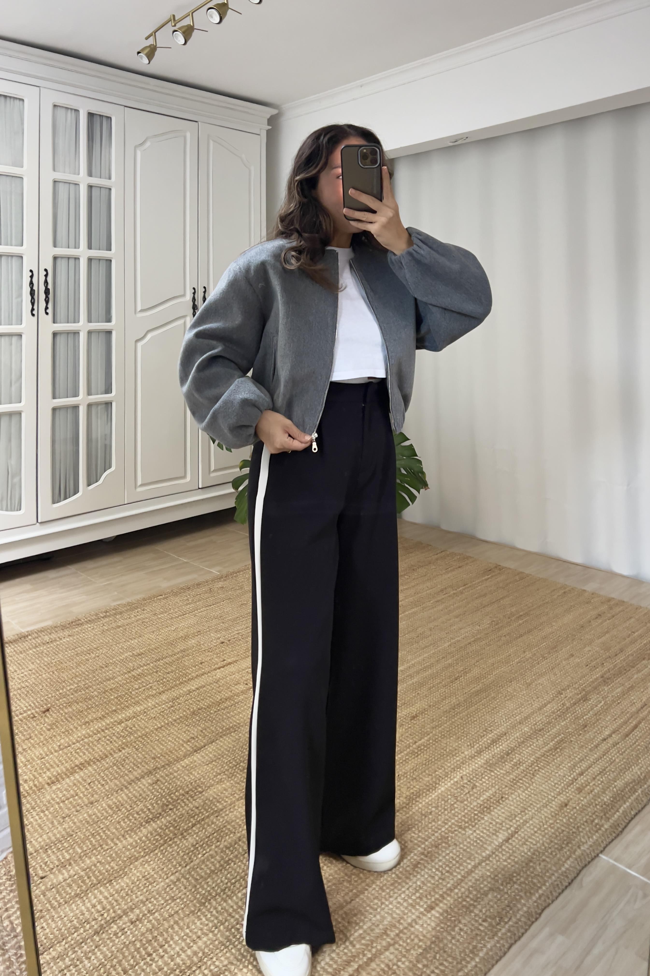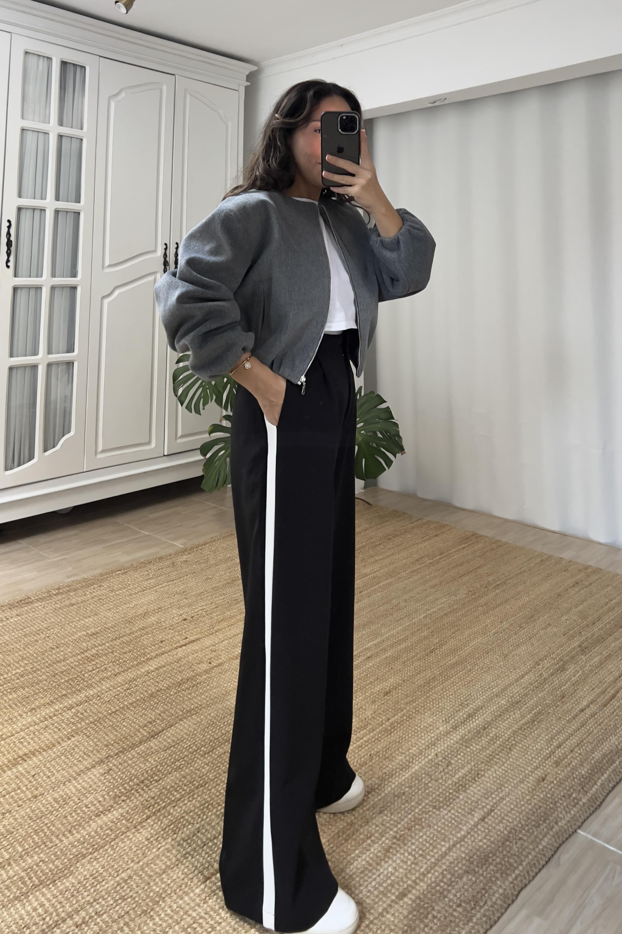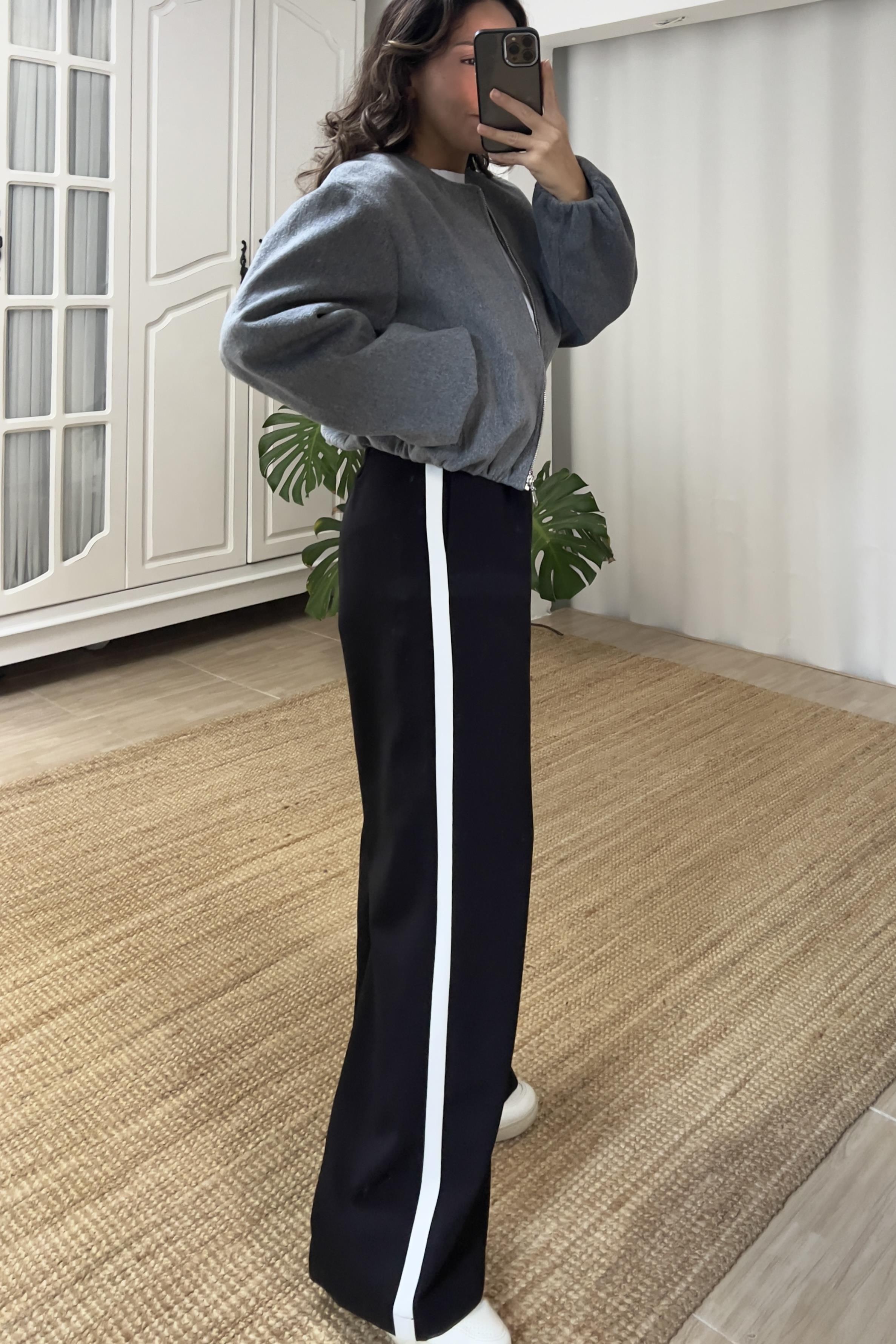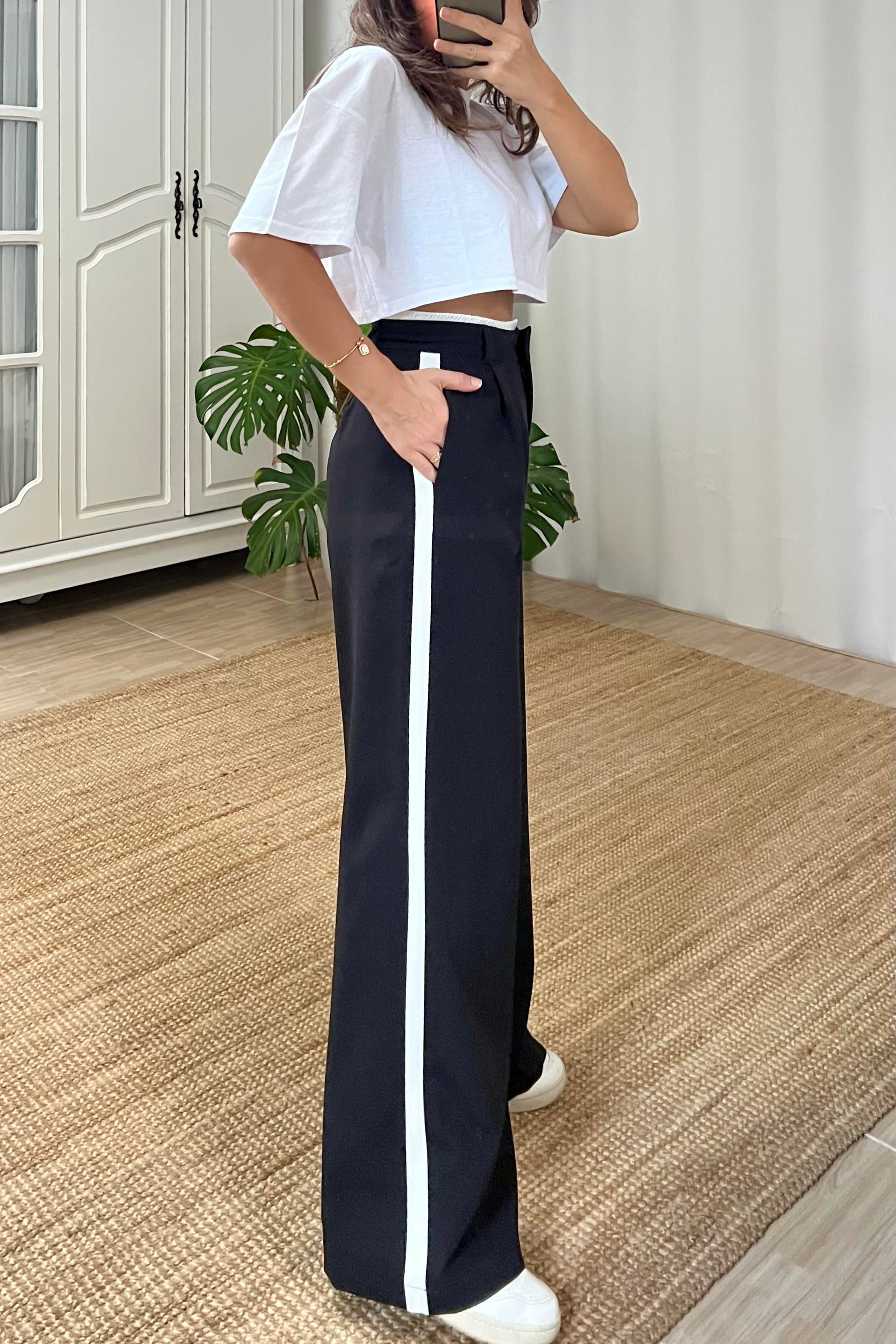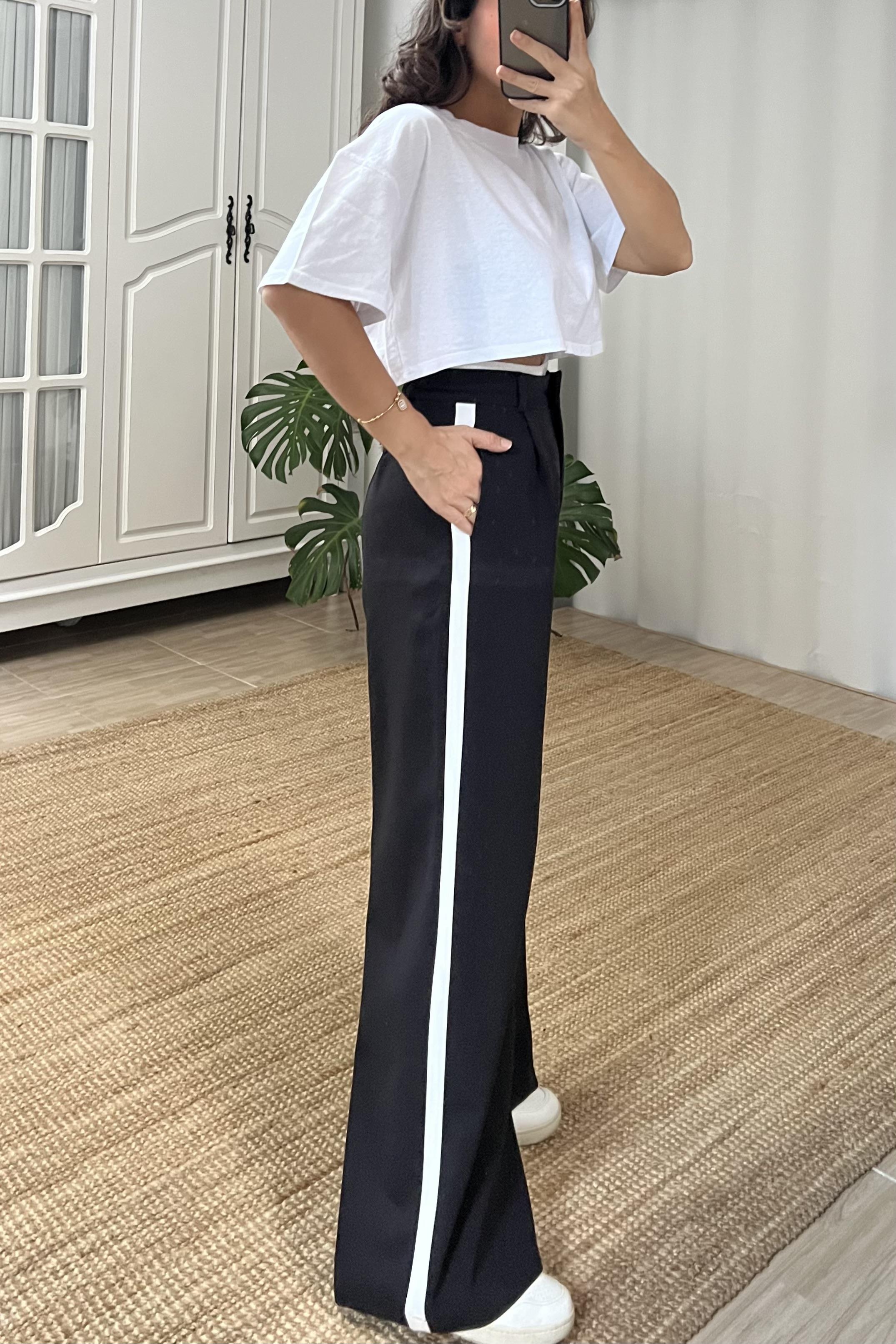 Siyah Çift Bel Şerit Detaylı Pantolon