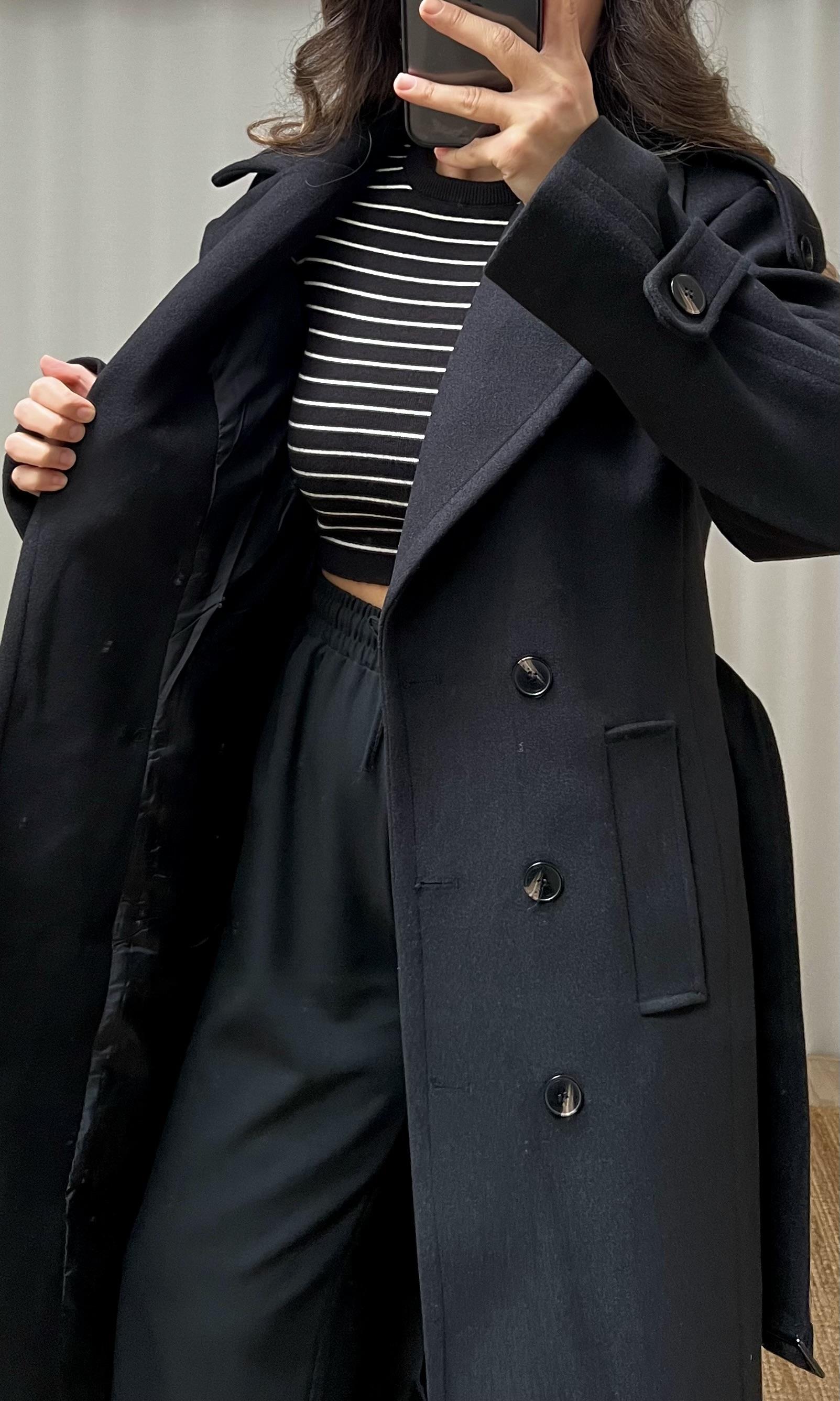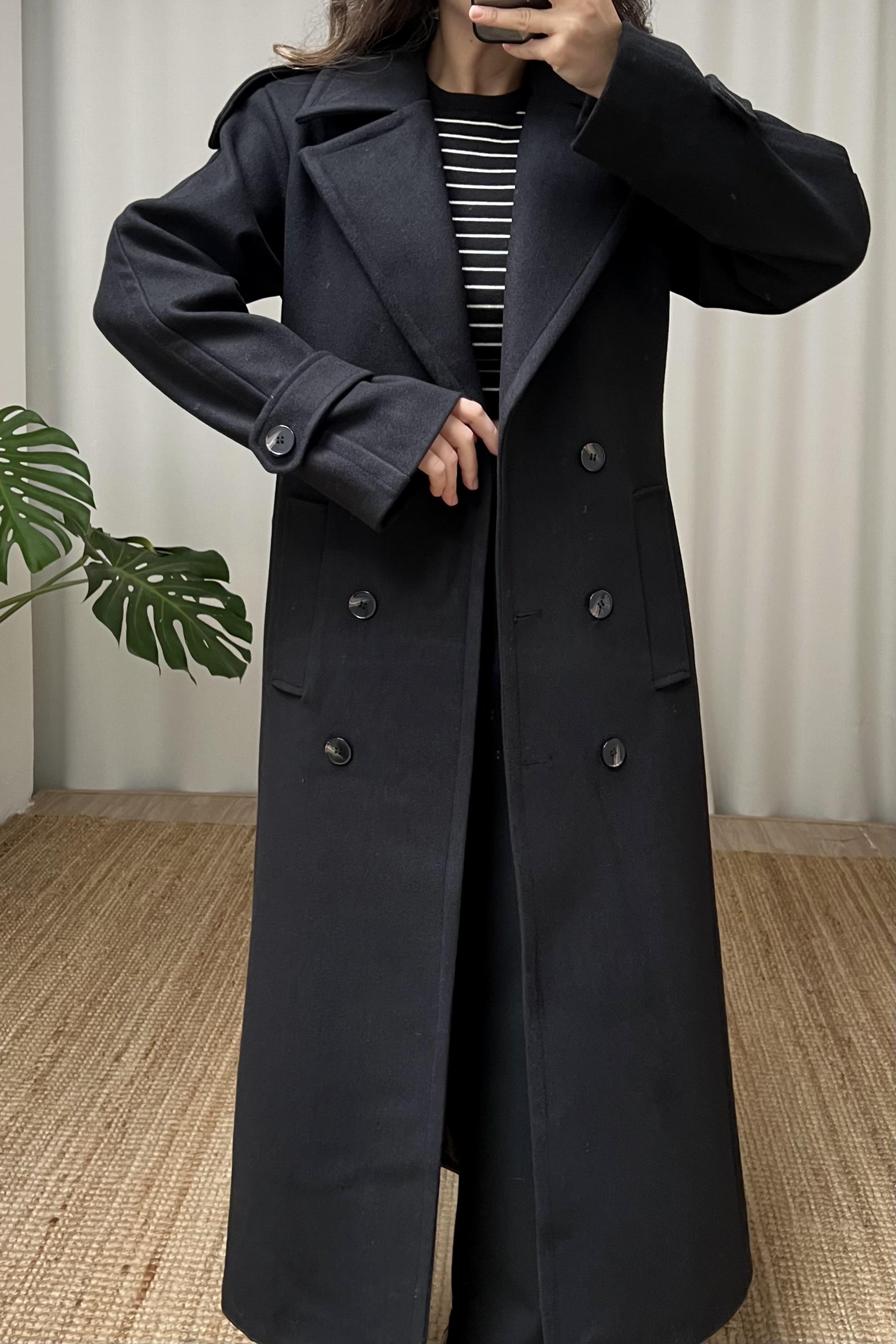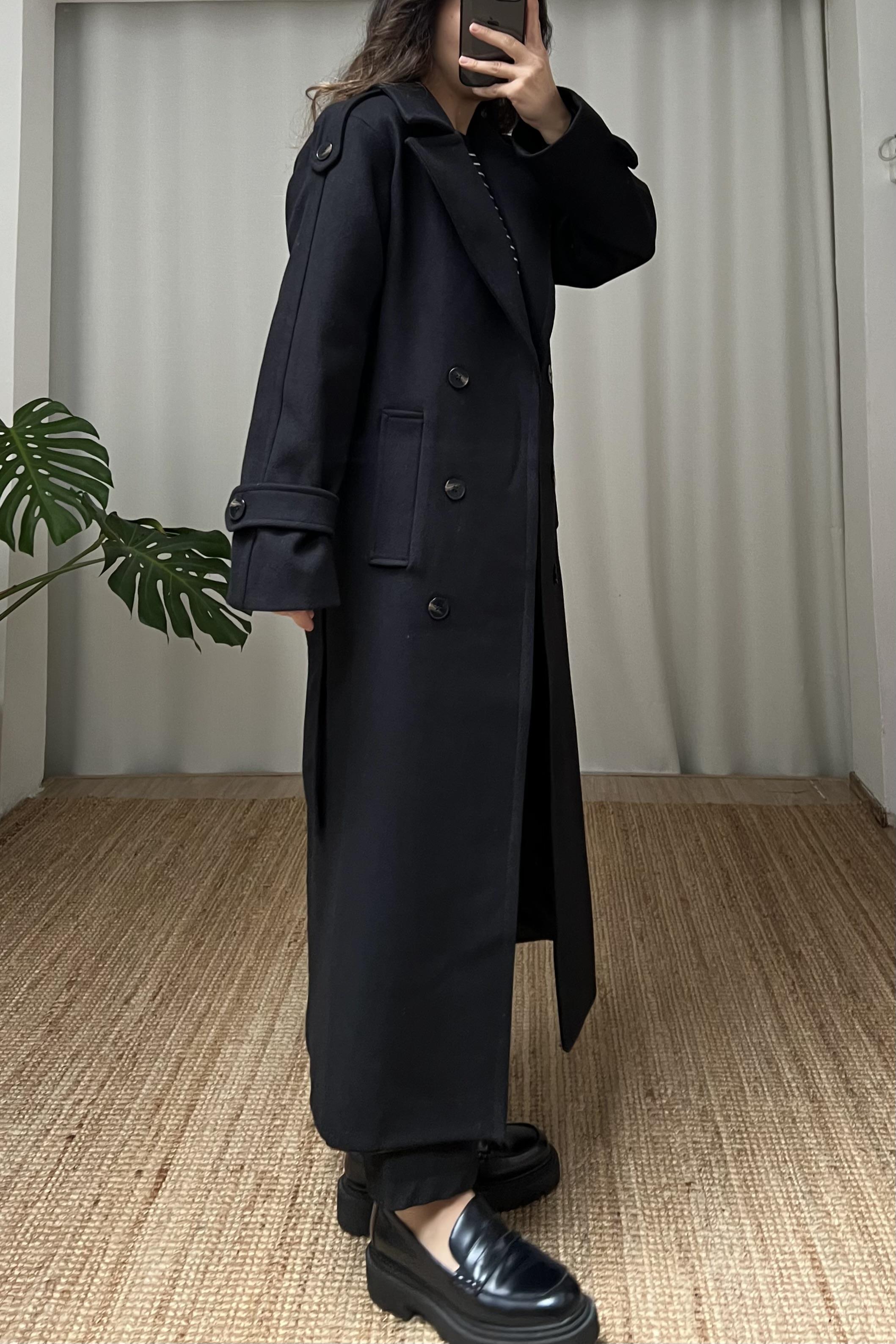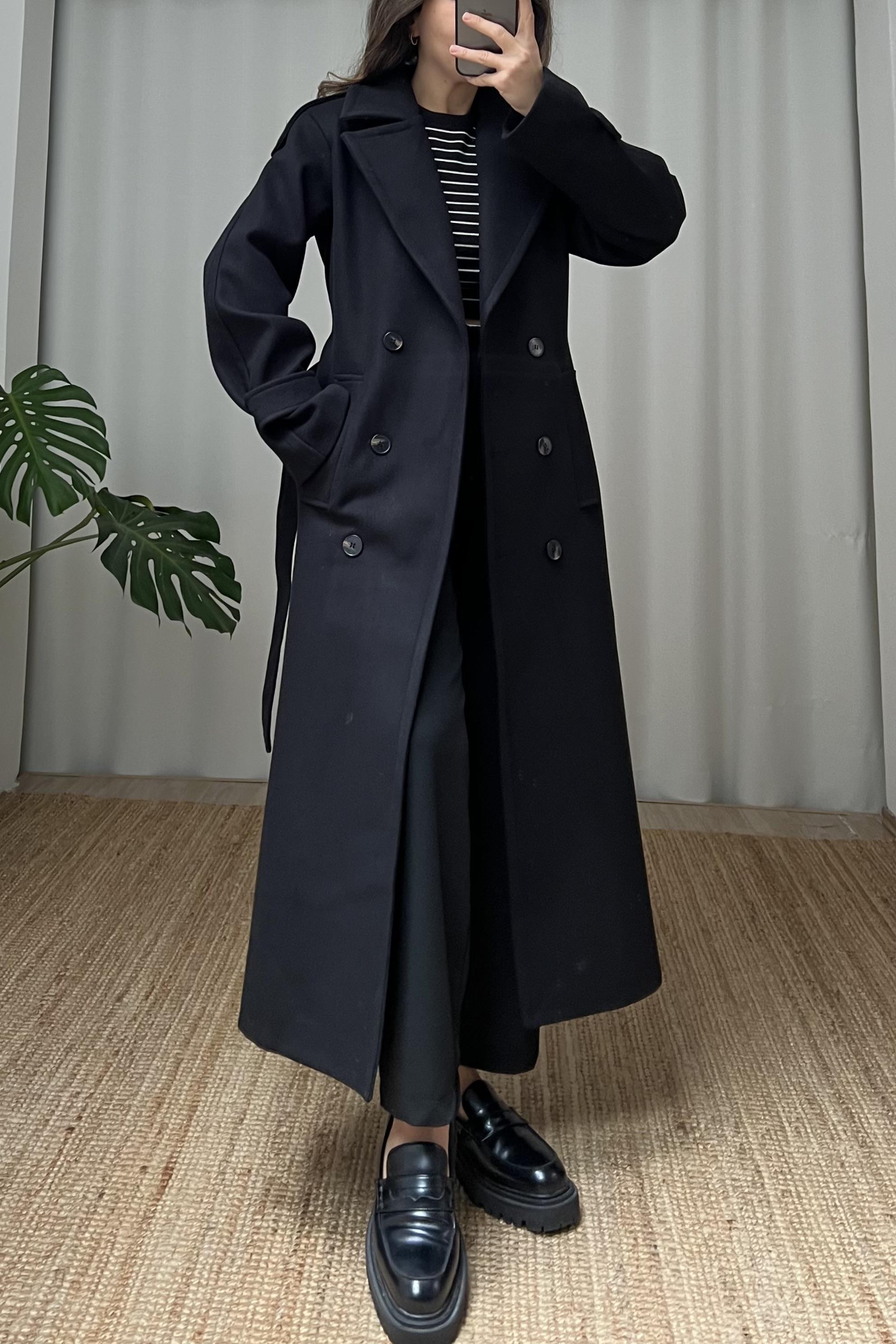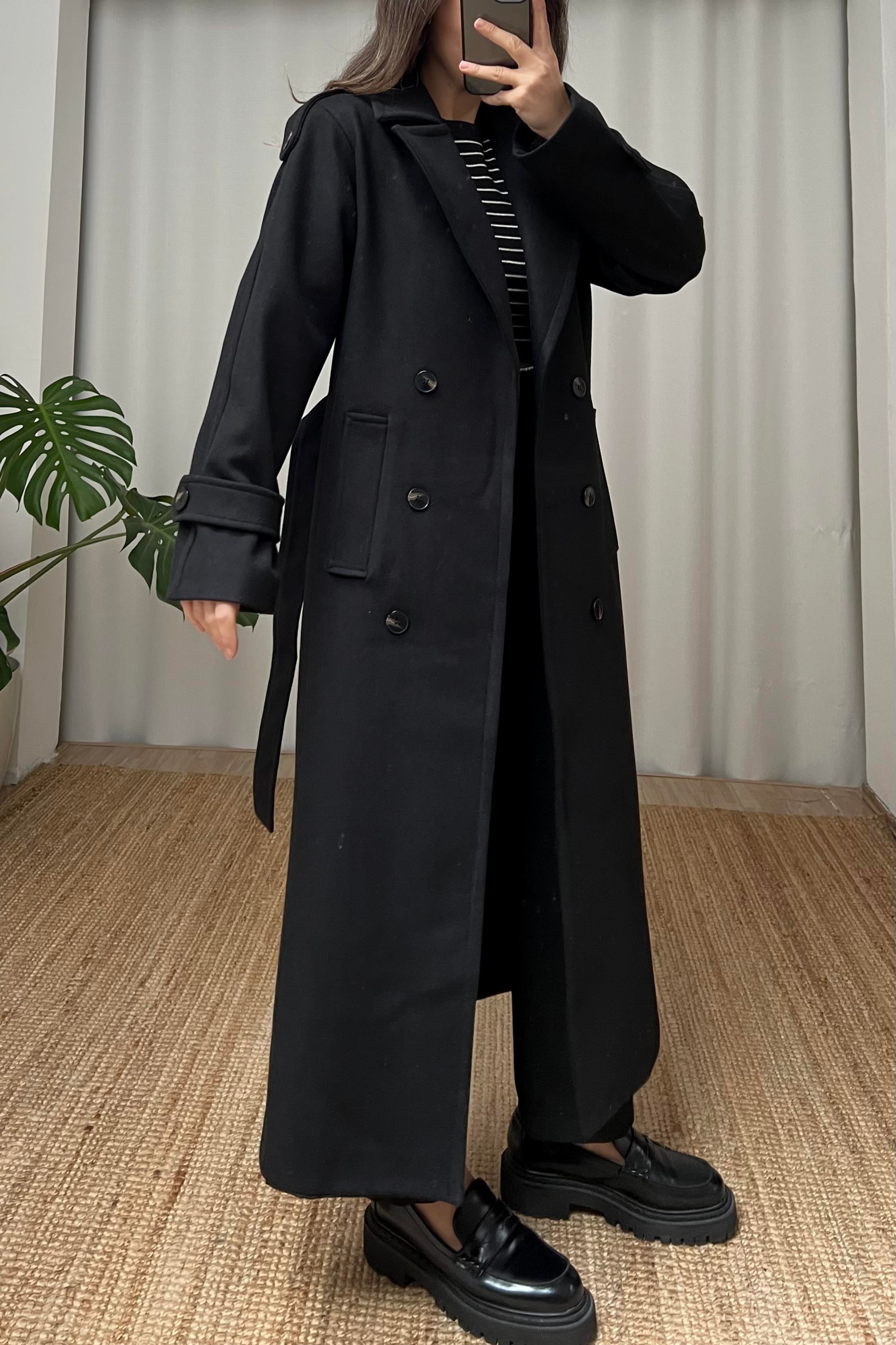 Siyah Kuşaklı Yün İçerikli Premium Kaban