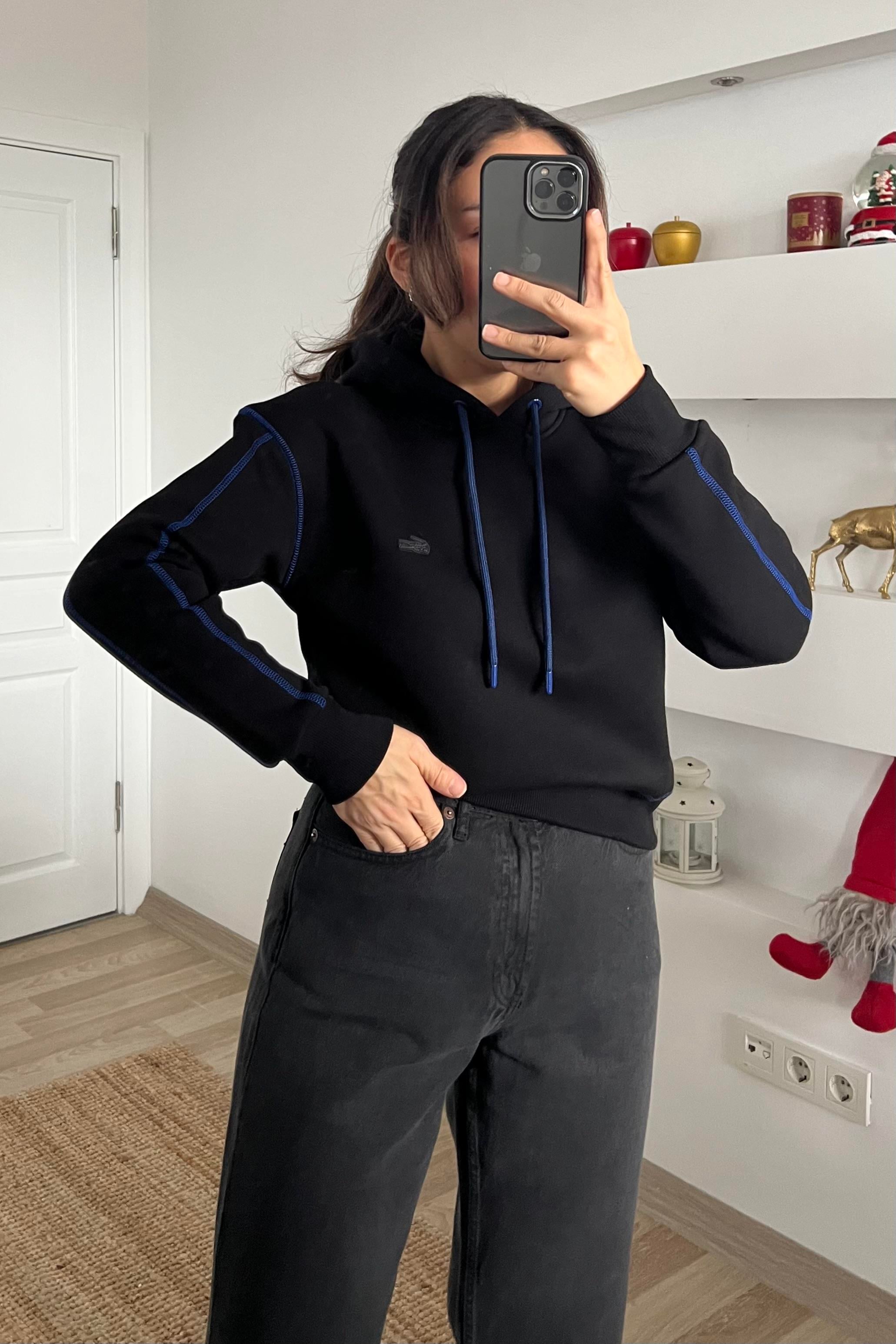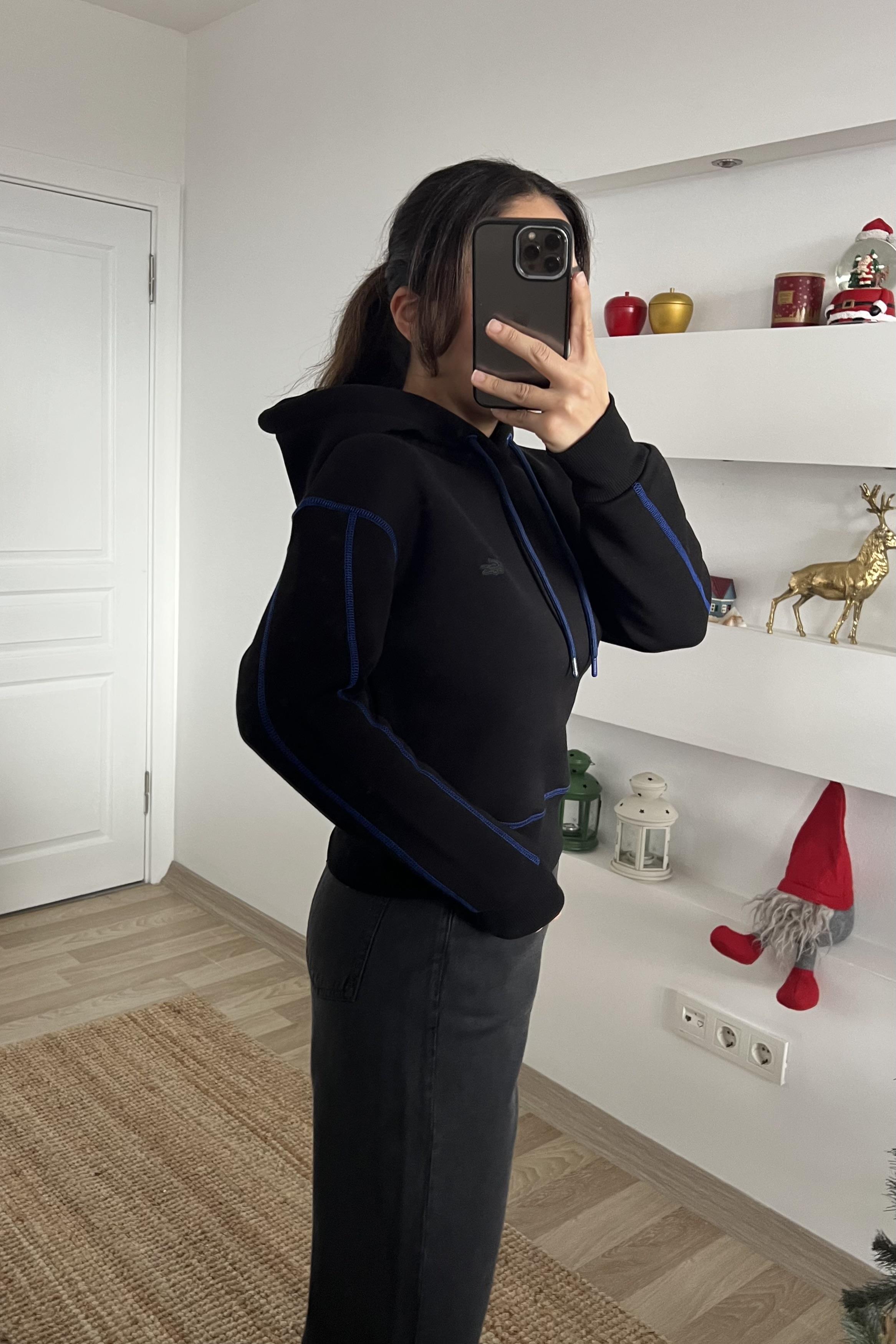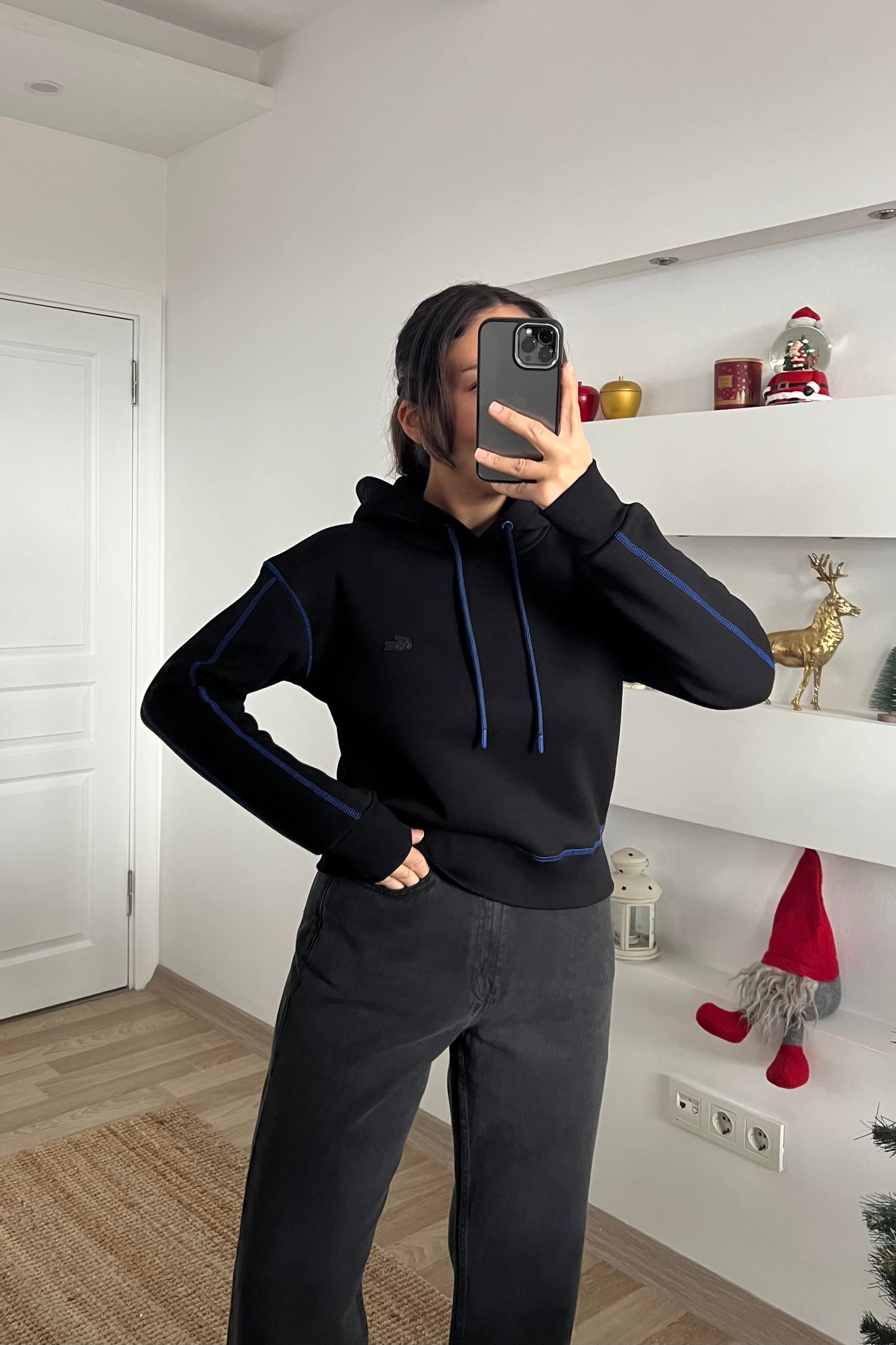 Siyah Neon Dikiş Detaylı Kapüşonlu Sweatshirt
