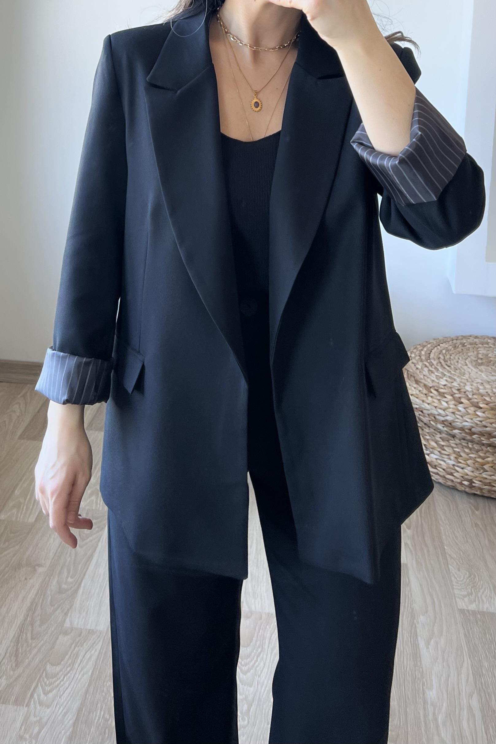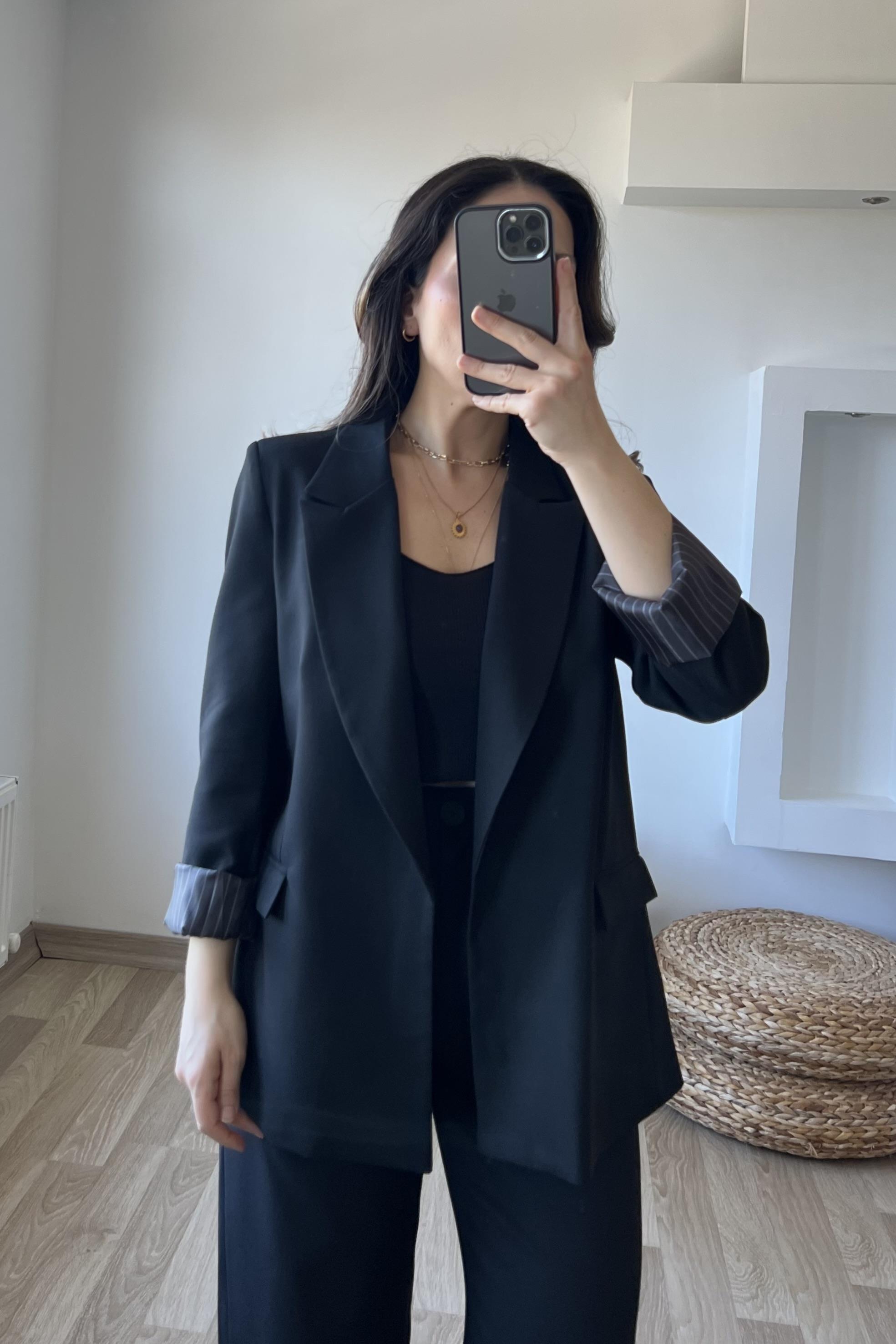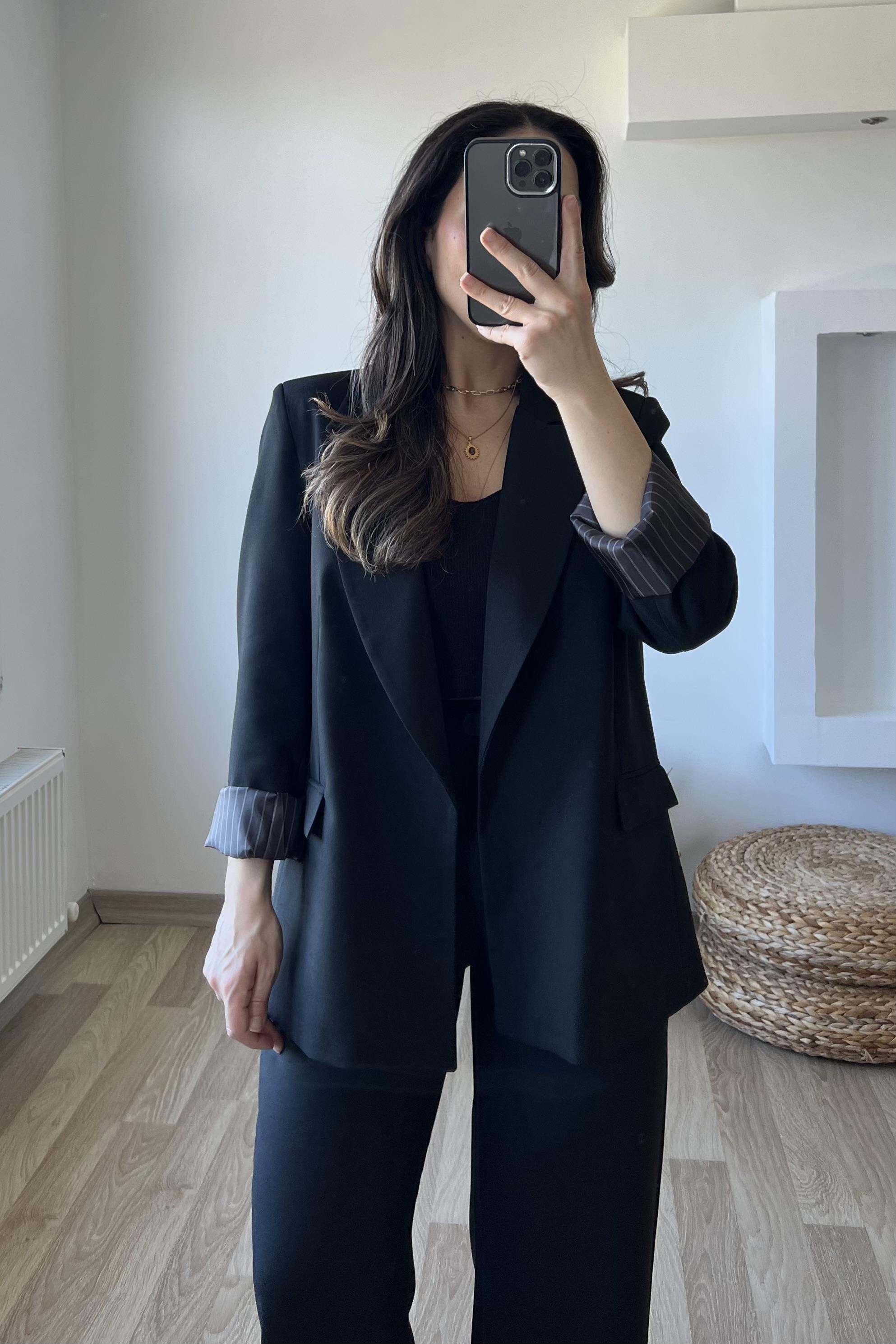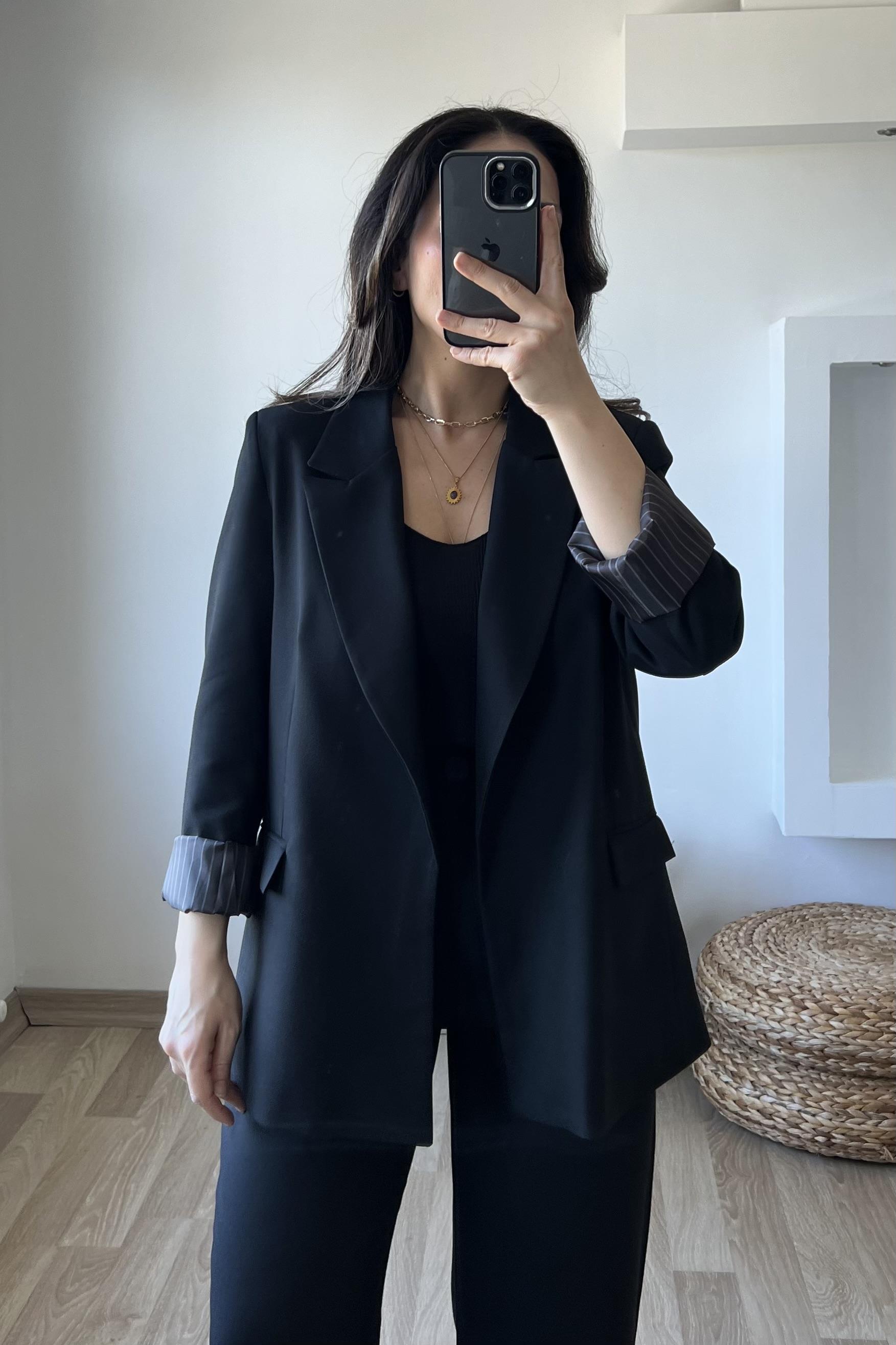 Siyah Premium Kolu Katlamalı Blazer