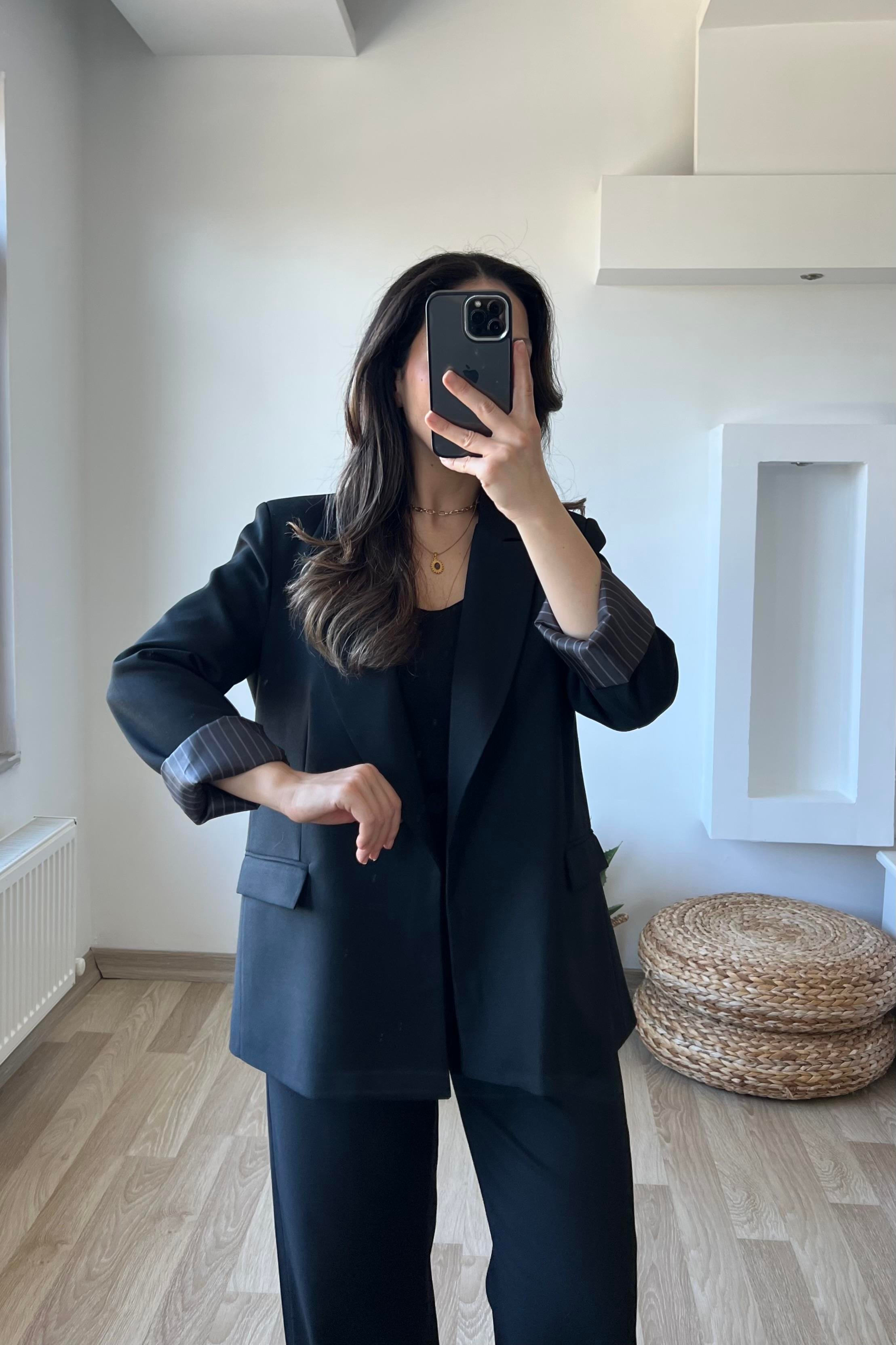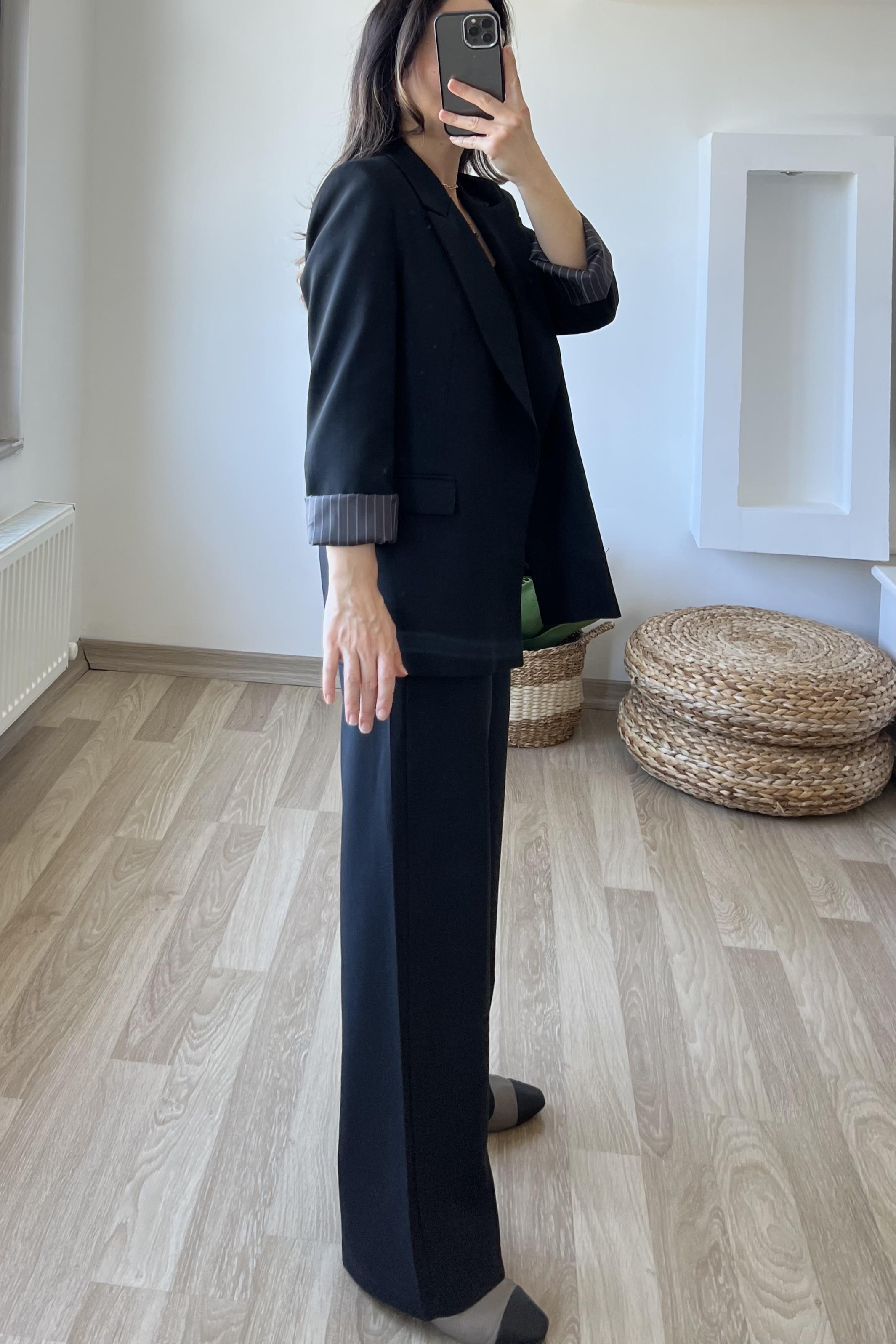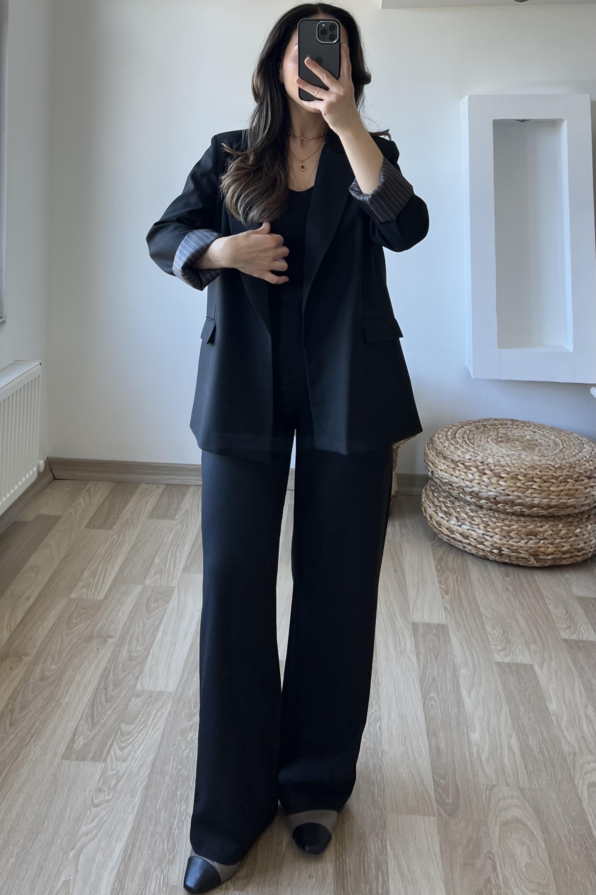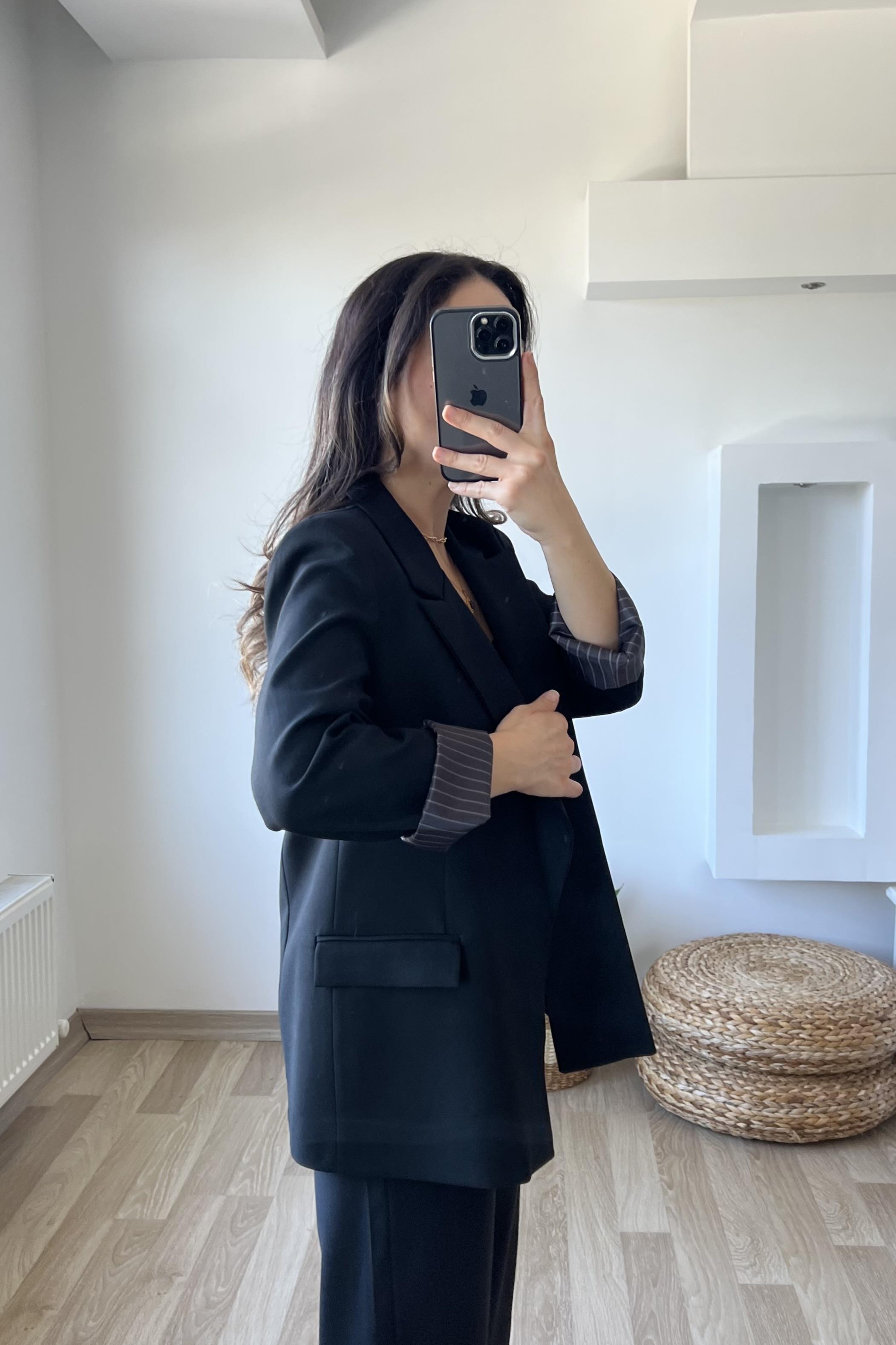 Siyah Premium Kolu Katlamalı Blazer