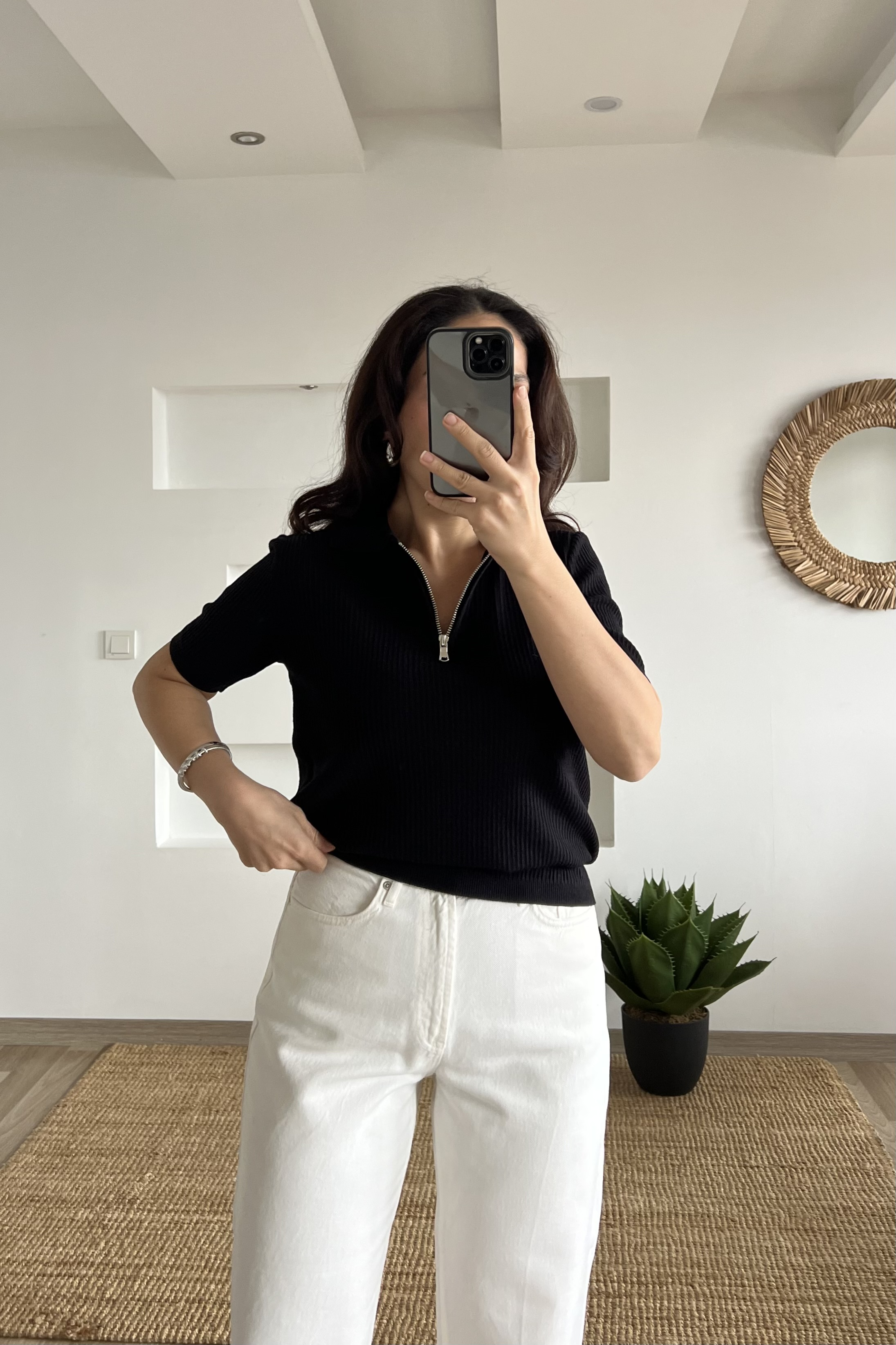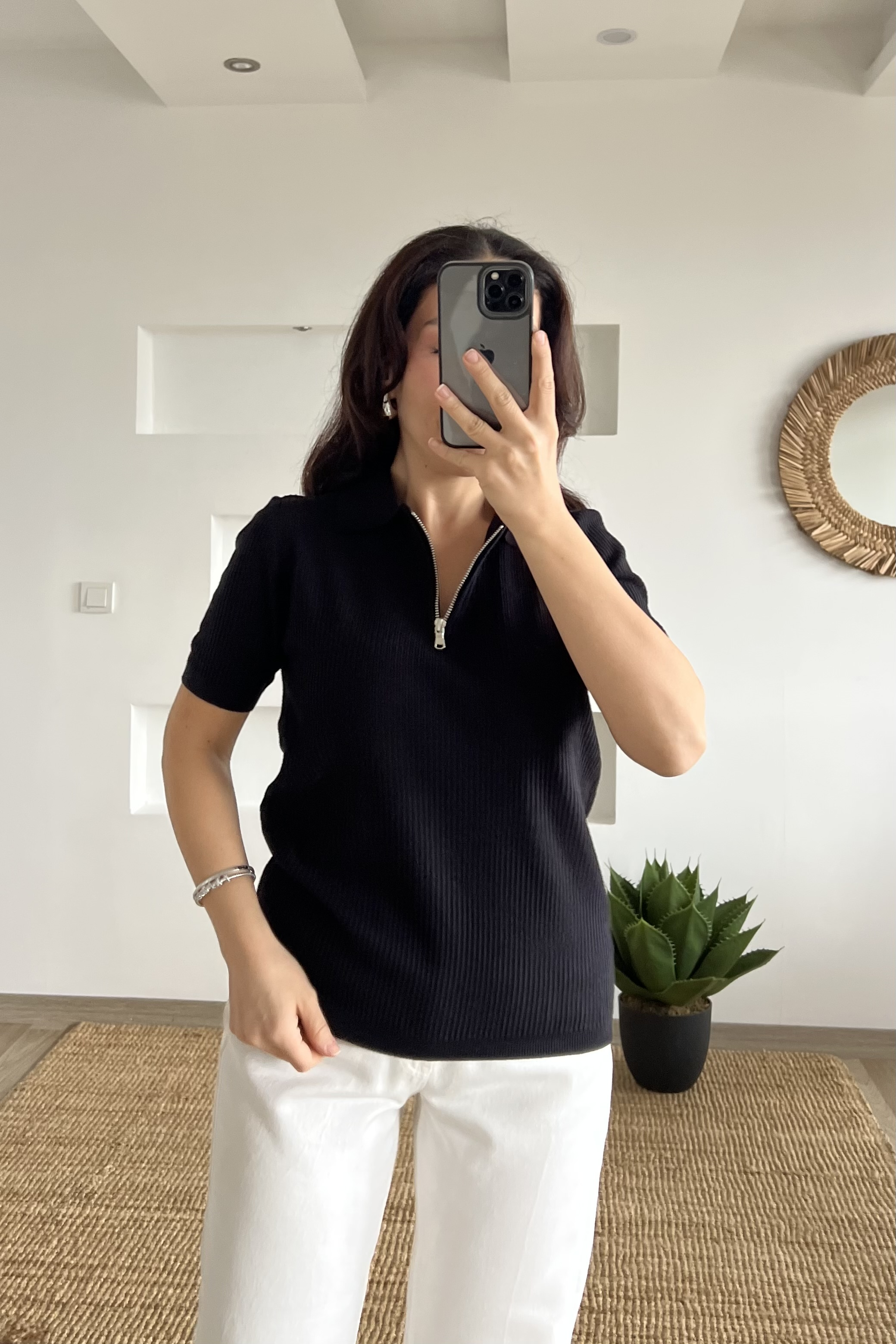 Siyah Soft Touch Polo Yaka Fermuarlı Triko