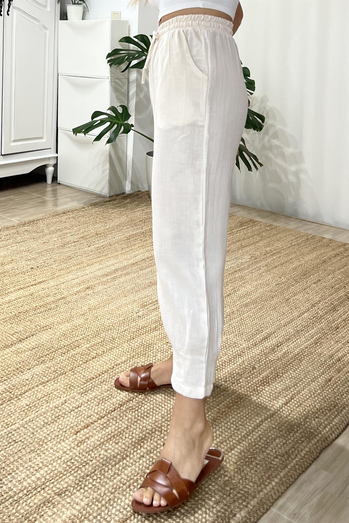 Taş Beli Lastikli Paçası Pileli Müslin Pantolon