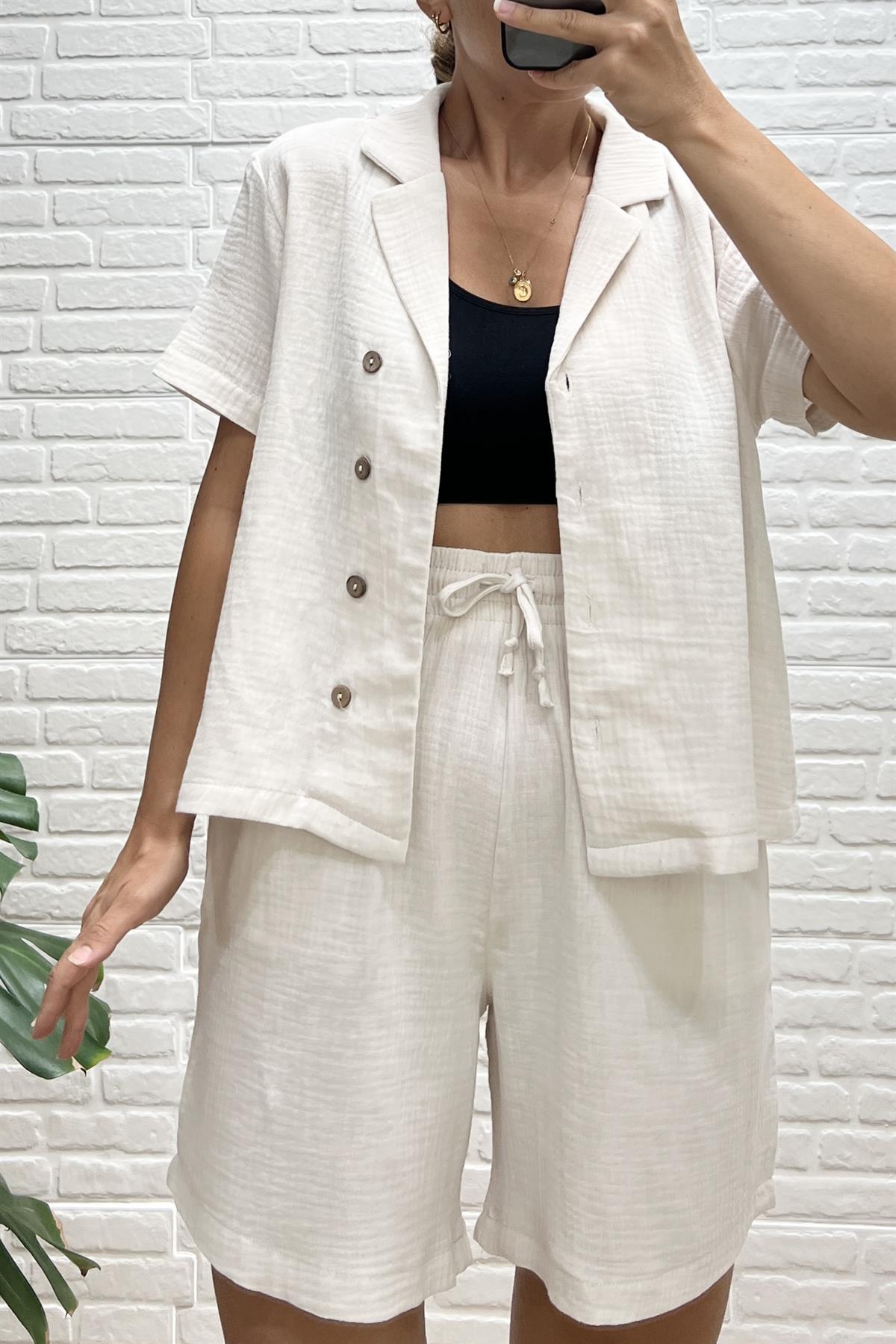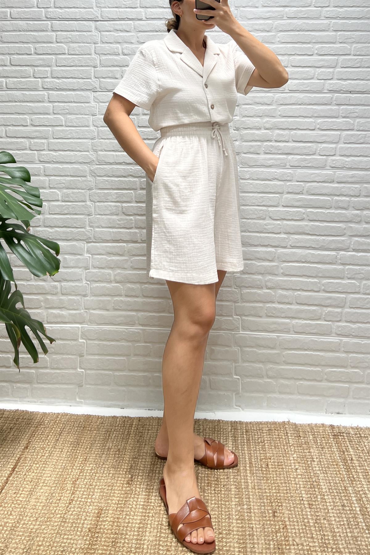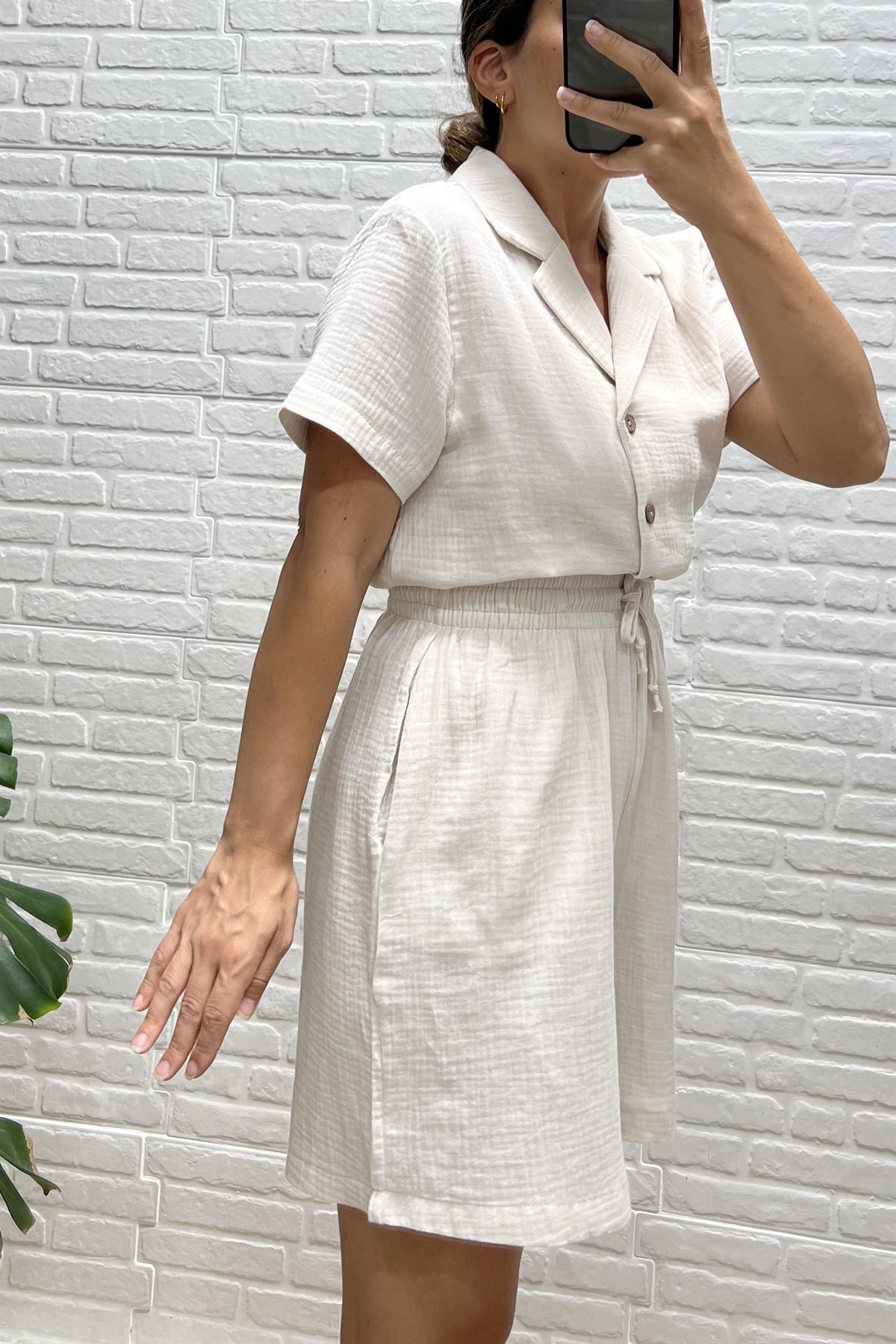 Taş Rengi Müslin Şehir Boy Şort Gömlek Takım