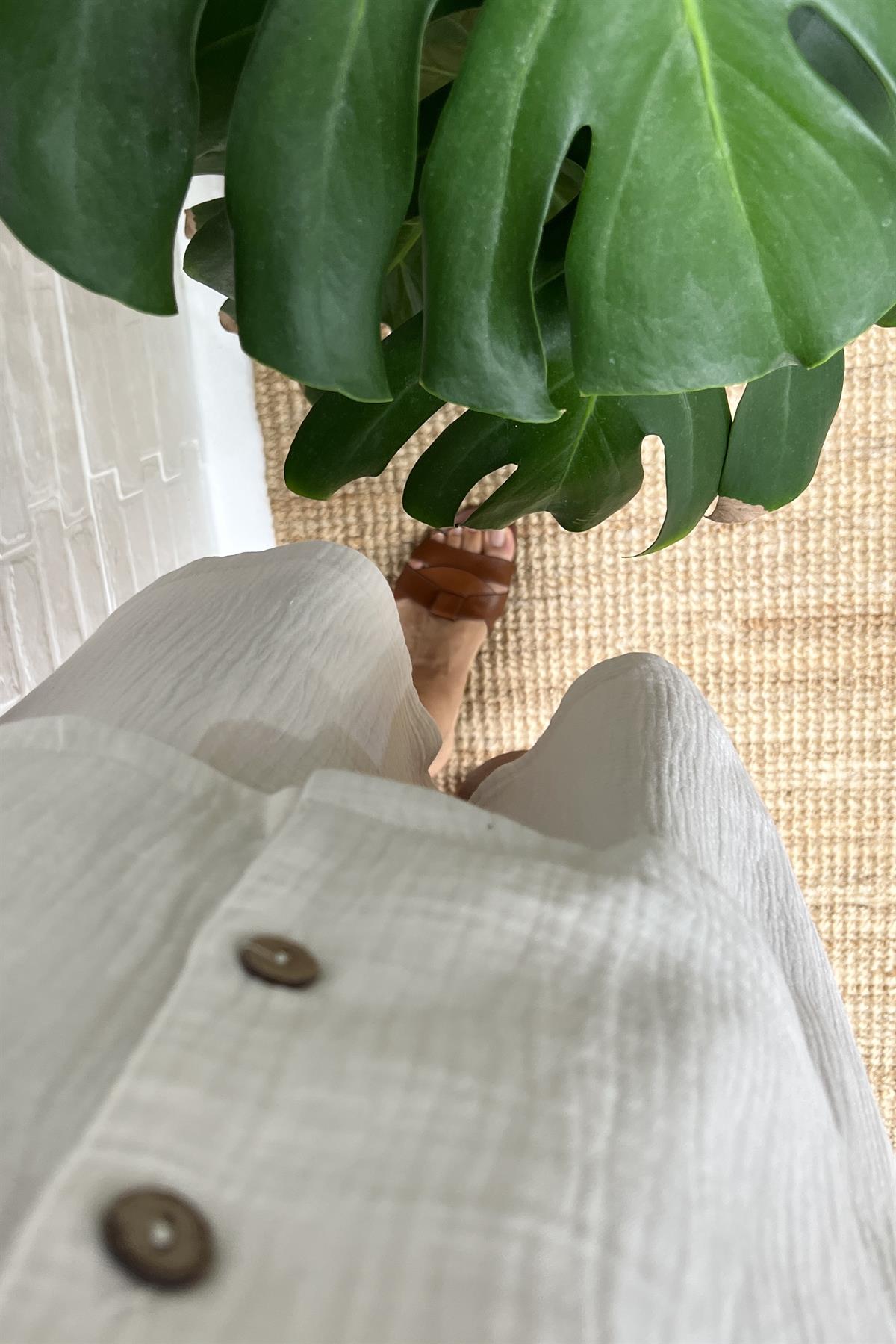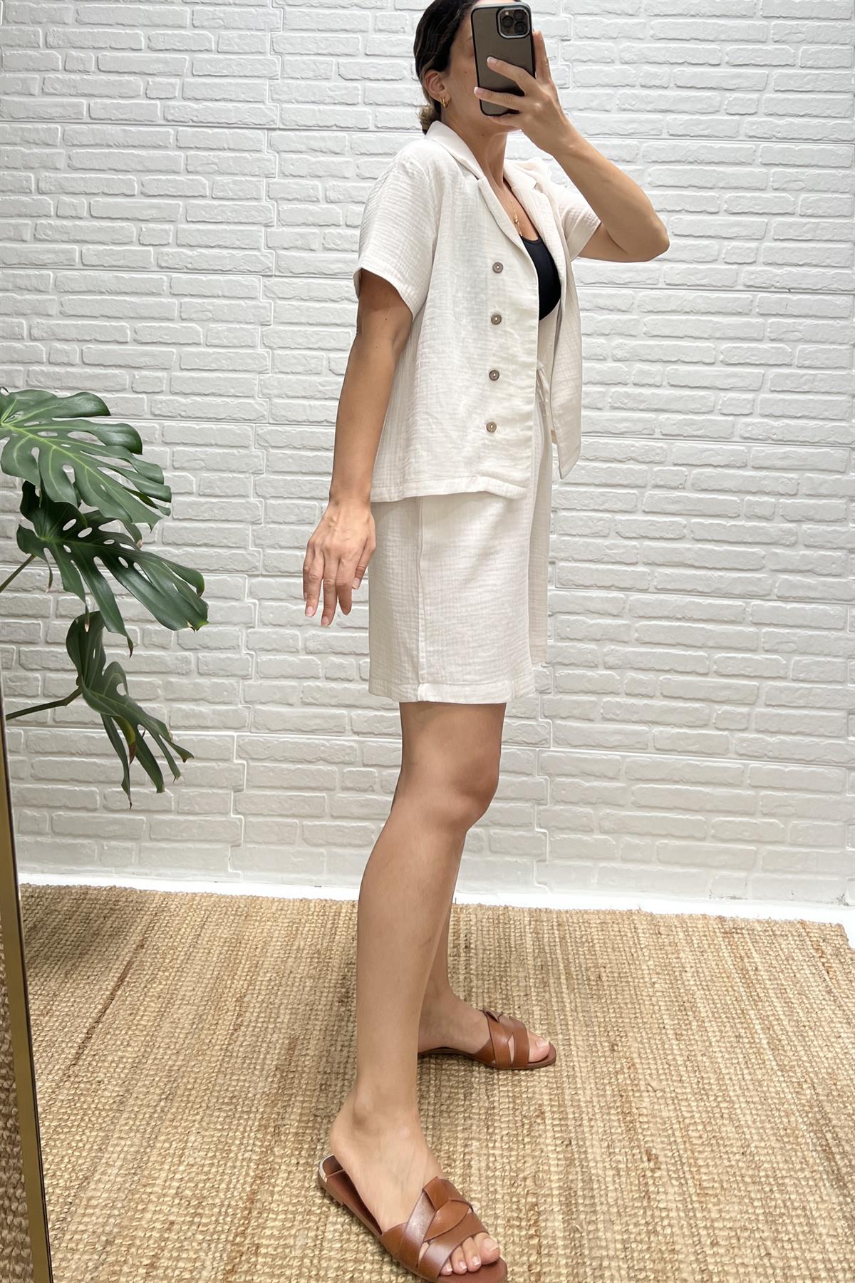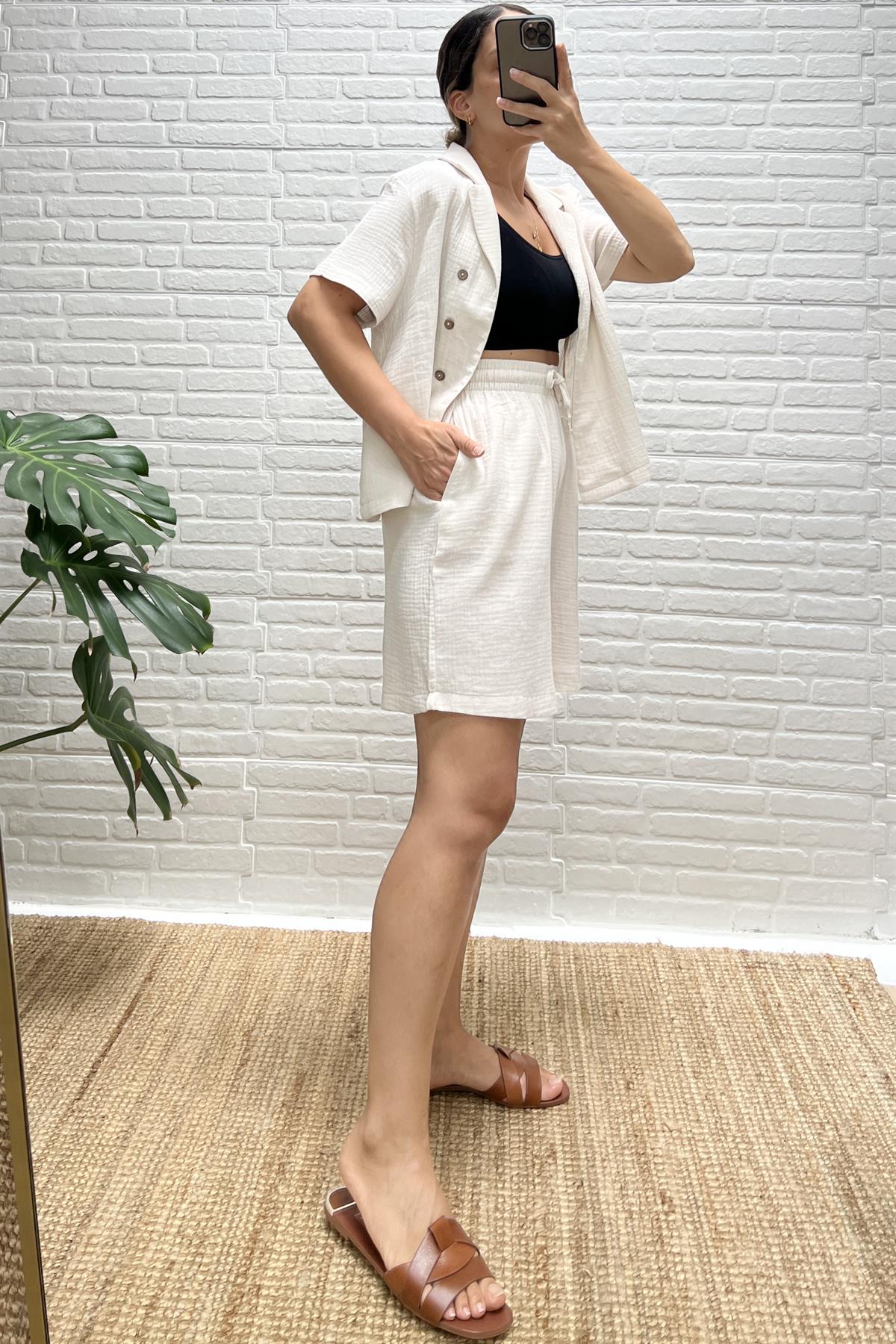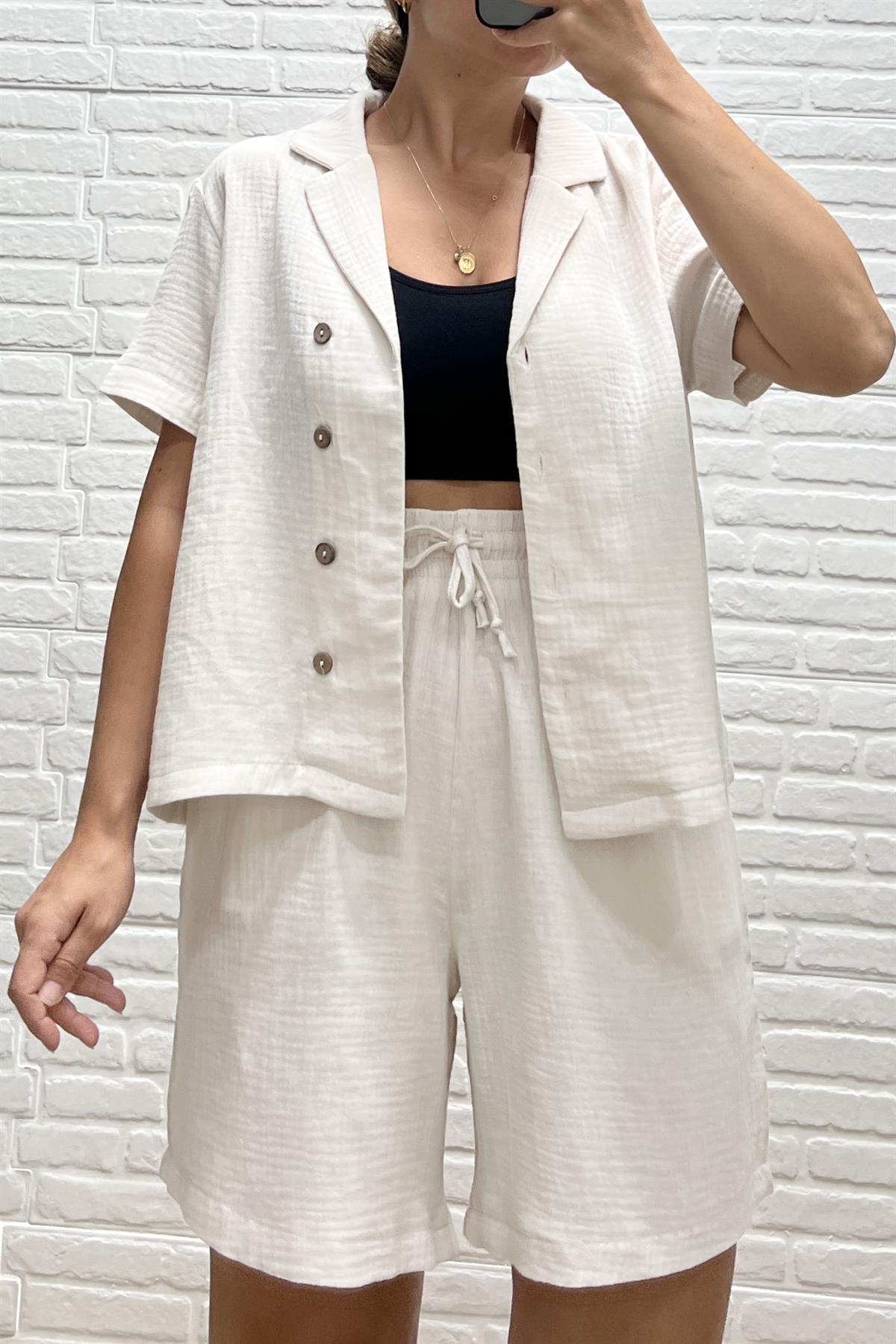 Taş Rengi Müslin Şehir Boy Şort Gömlek Takım