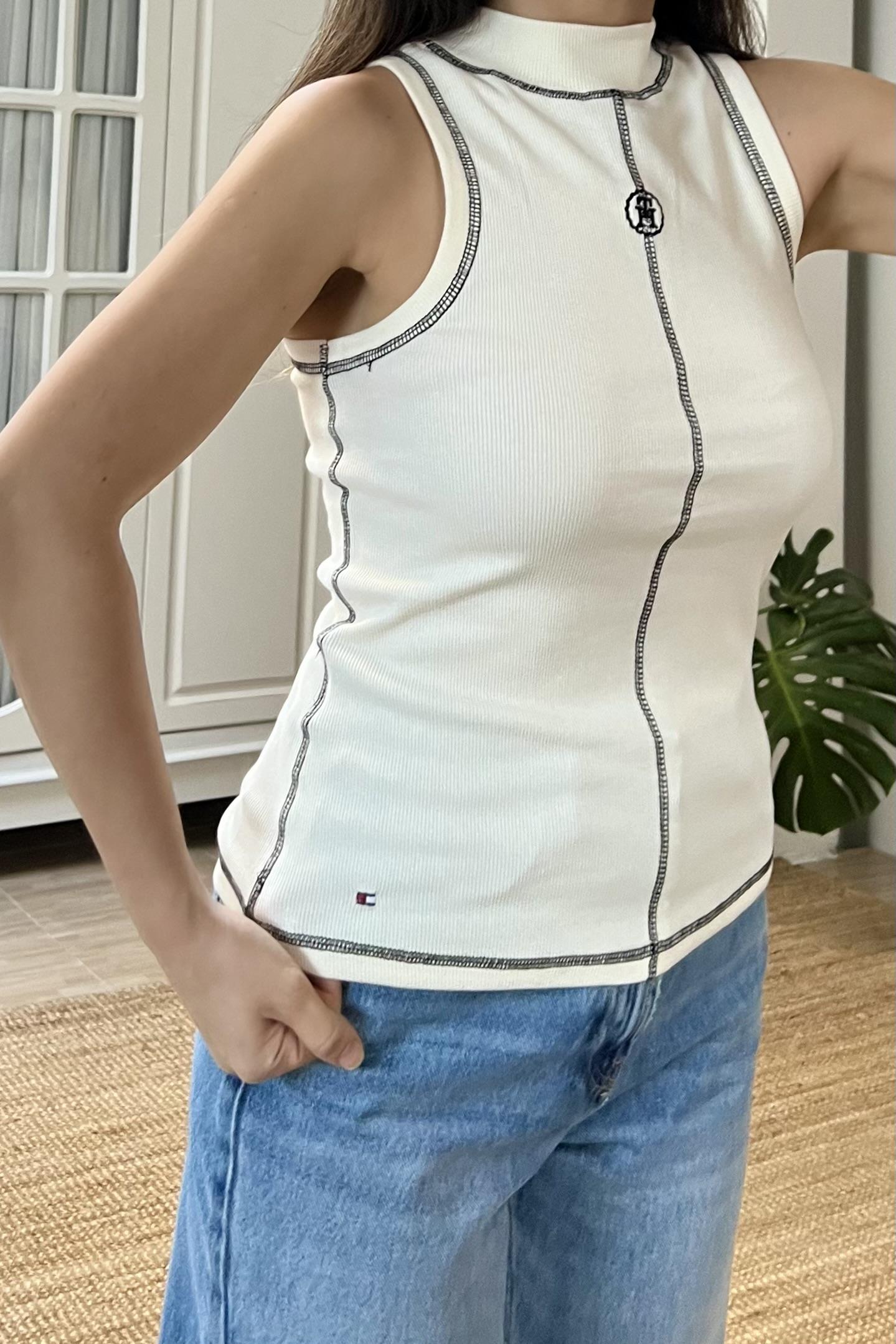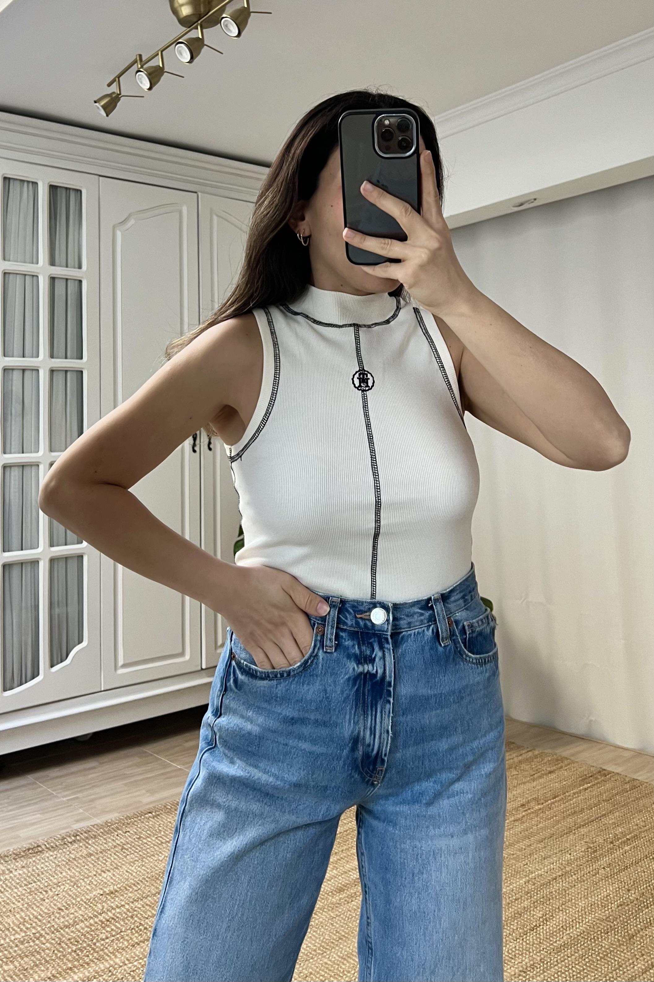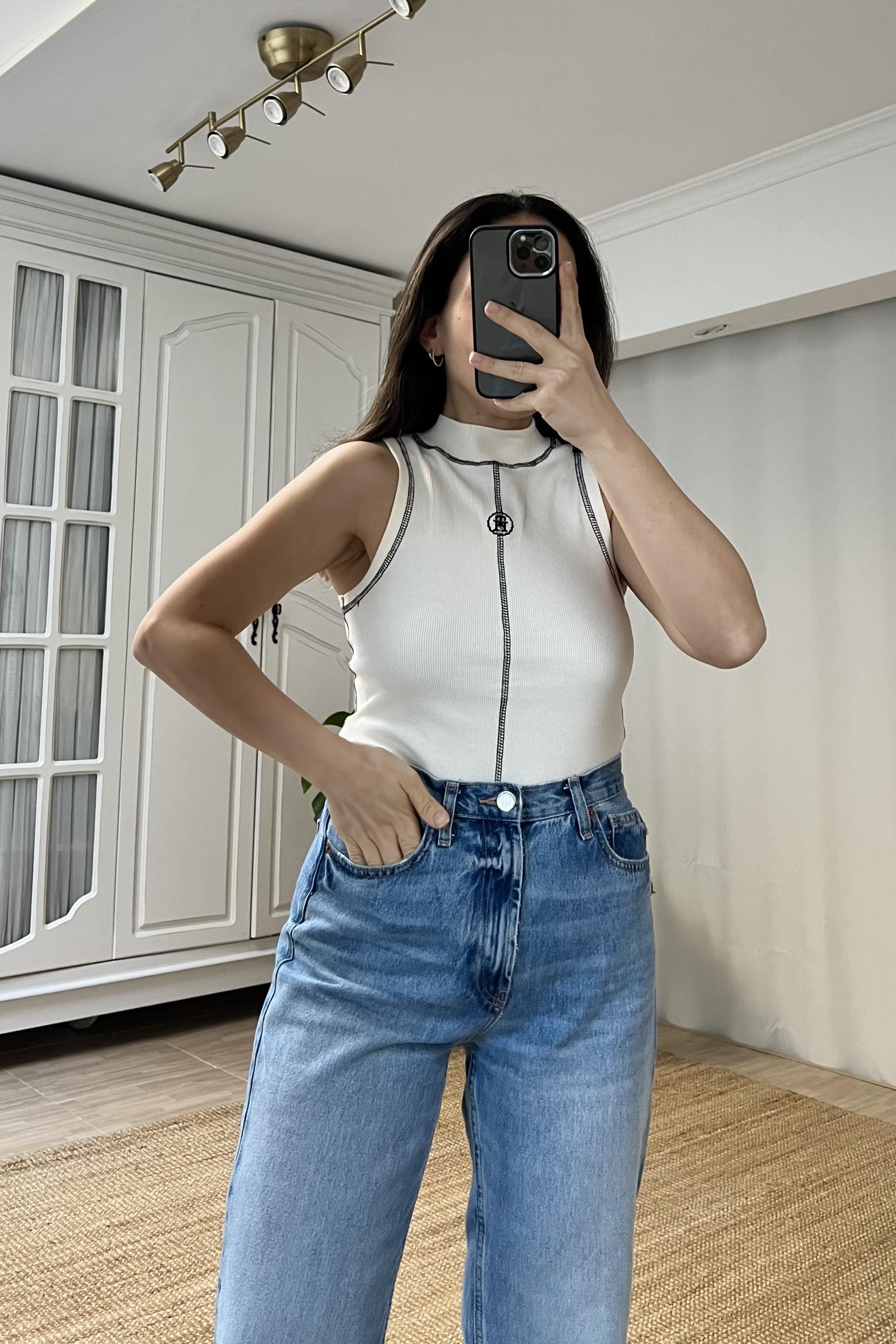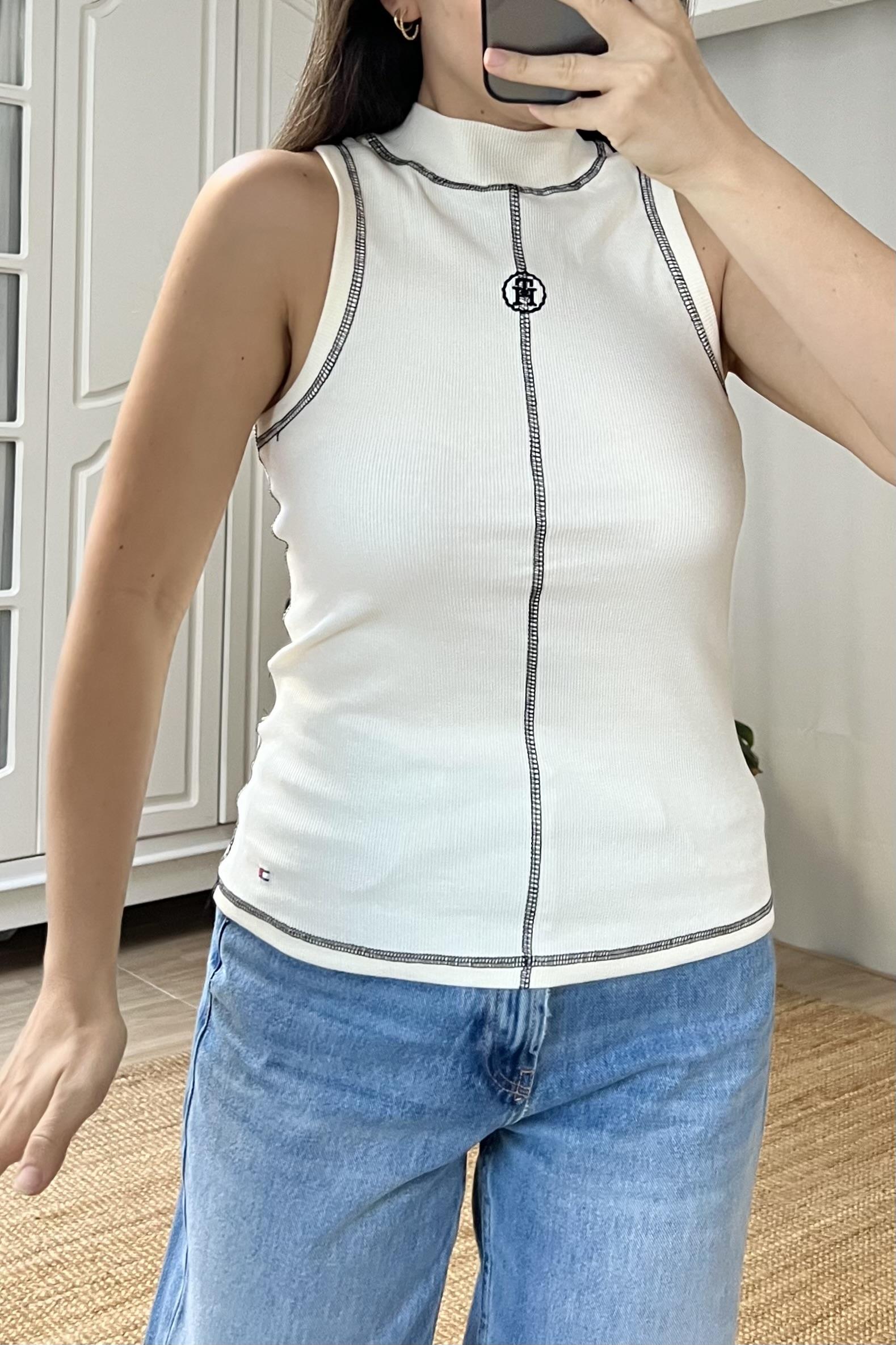TH Ekru Logo Nakışlı Dikiş Detaylı Kolsuz Tshirt