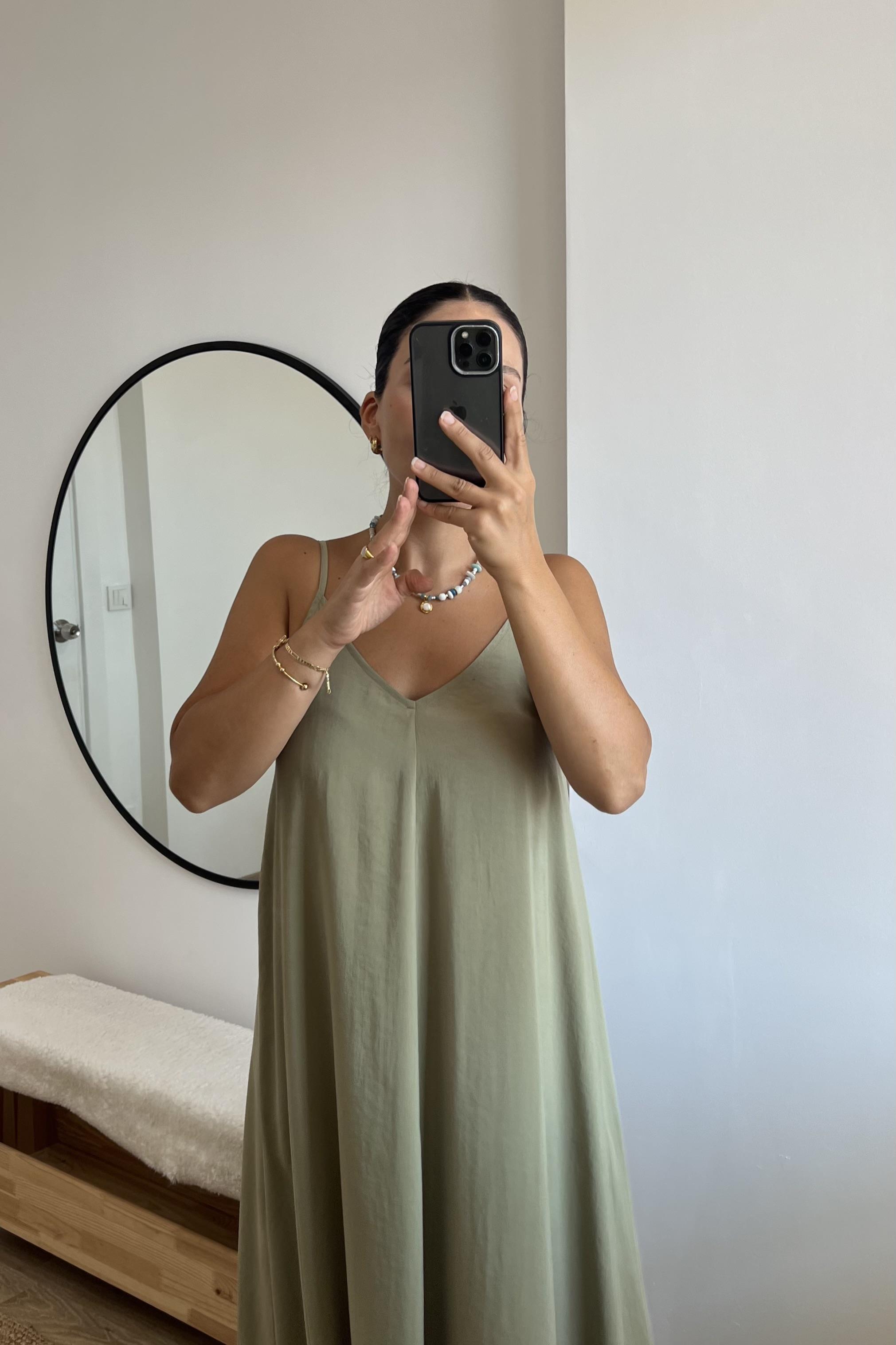 Yağ Yeşili Ayarlanabilir Askılı Modal Elbise