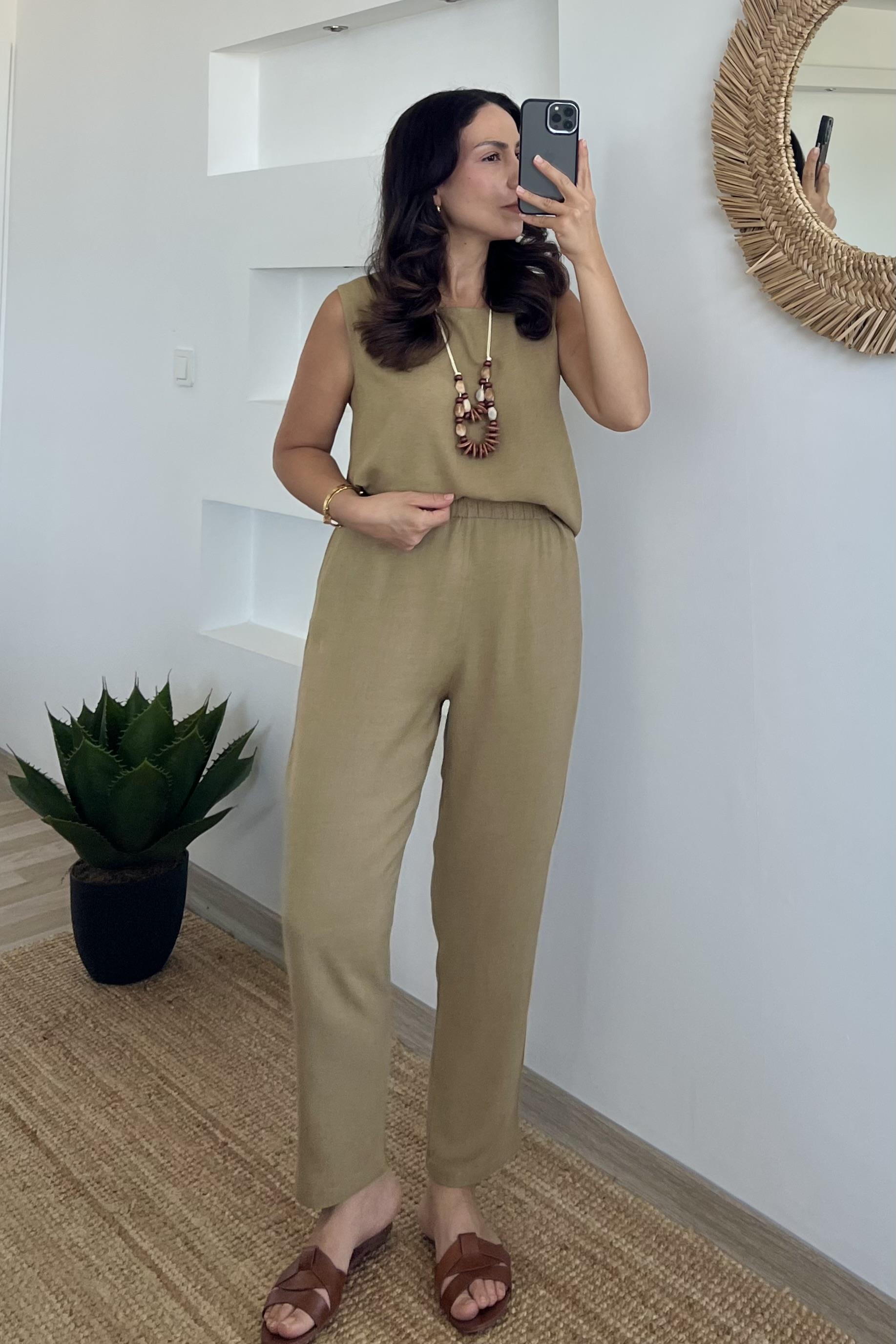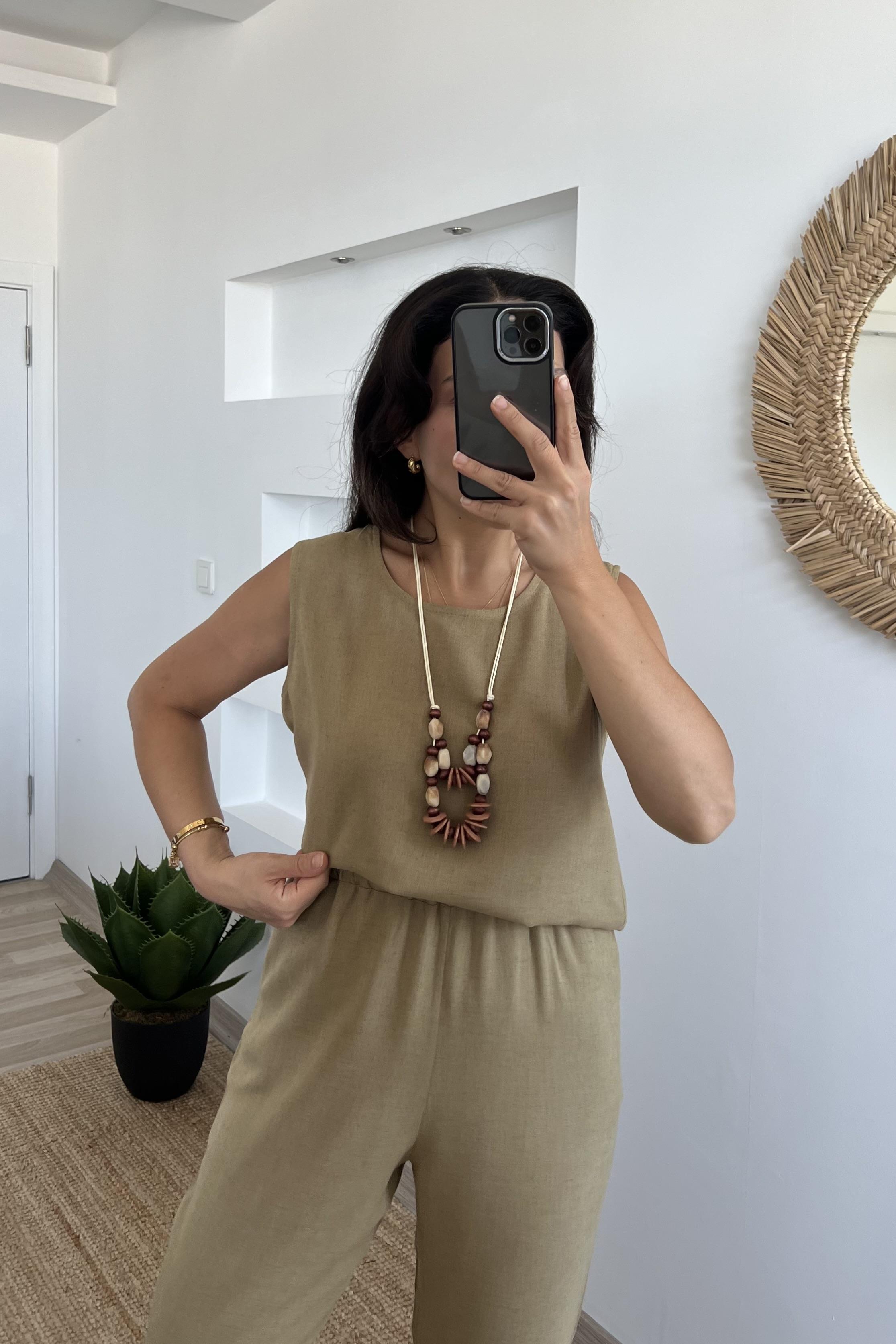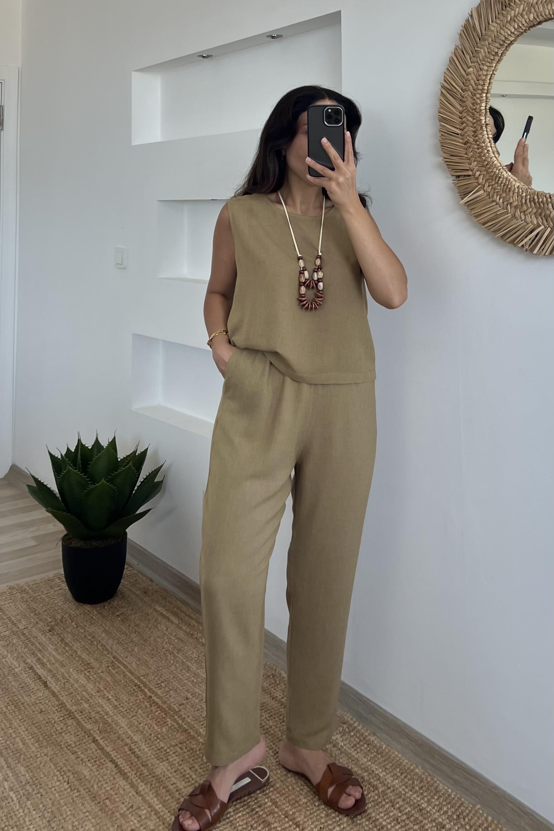 %100 keten kumaştan üretilmiş bu bluz ve pantolon takımı, hafifliğiyle rahatlık sunarken, sade ve zarif tasarımıyla tarzınıza doğal bir dokunuş katıyor.